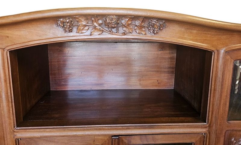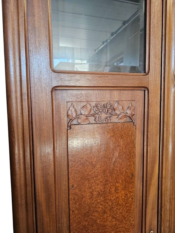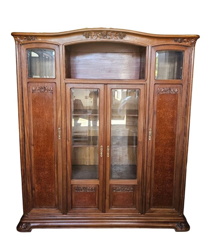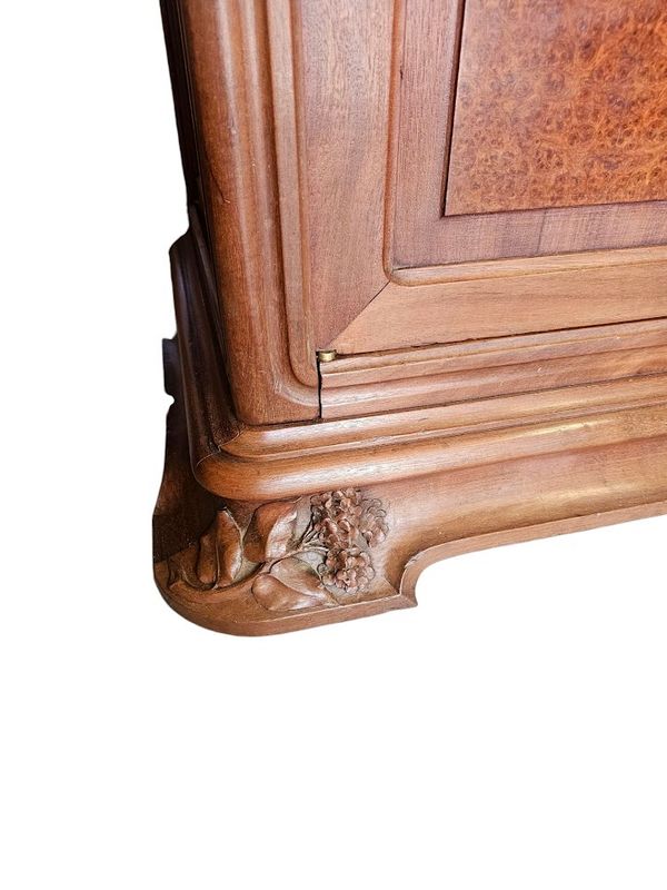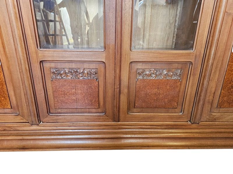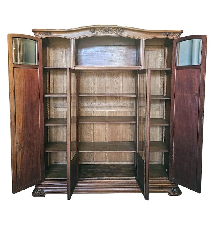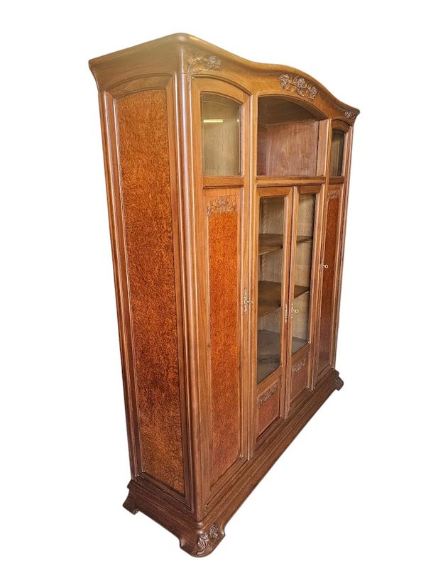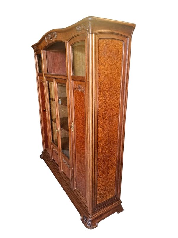 Schöne massive Blonda -Mahagoni -Bibliothek und Loupe -Furnier, geformt und mit hortensien dekoriert geformt. Es öffnet sich mit einer Nische und vier Glastüren und Paneelen, ein gekrümmtes Gesims und eine geformte Basis mit überfüllter Basis. Verblüffte Fenster, Eingänge vergoldeter Bronze -Schlösser und -tasten, Höhe -verstellbare Regale. Hervorragende Qualität der Schrankherstellung!