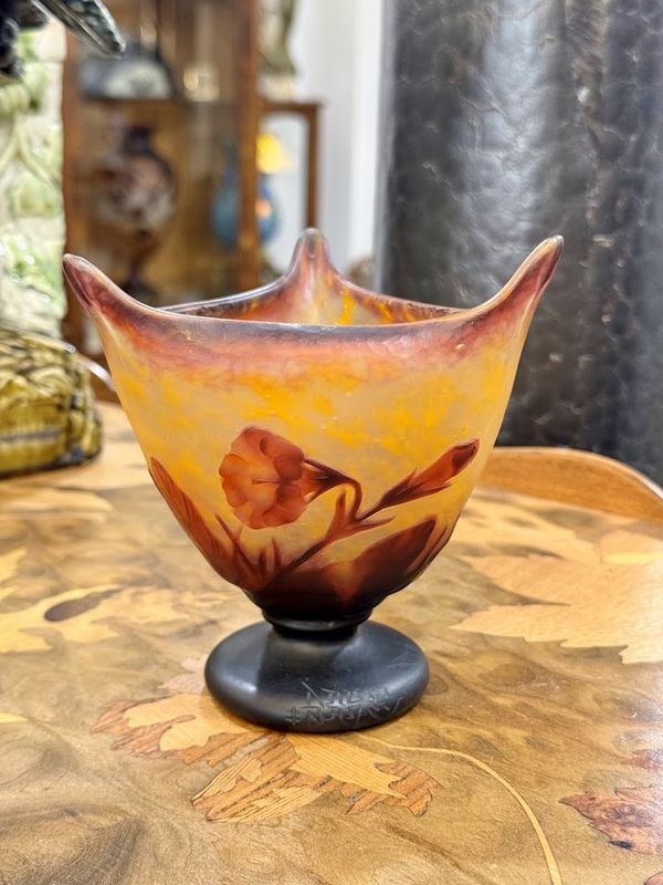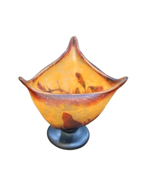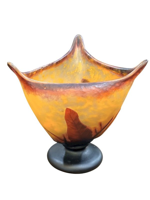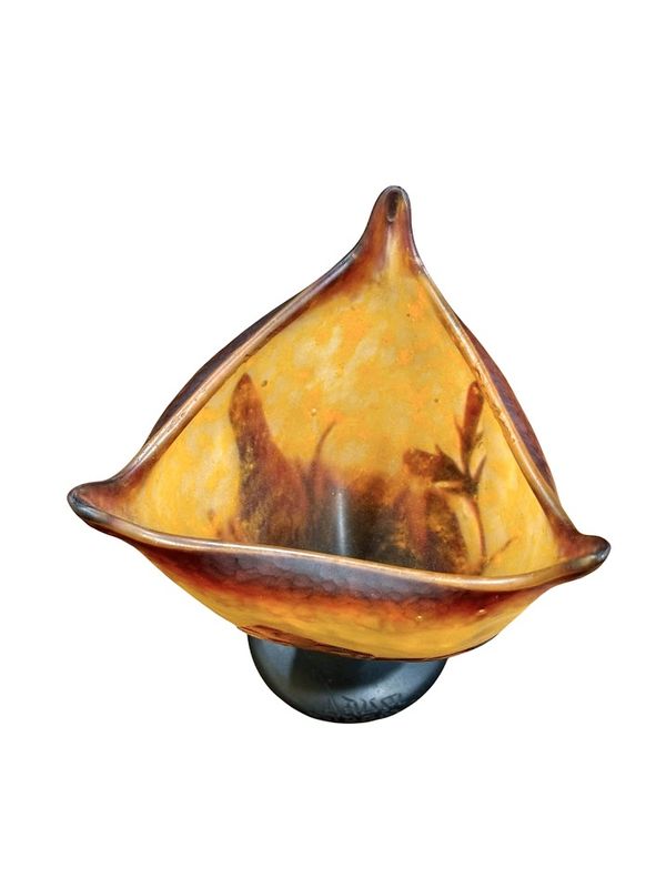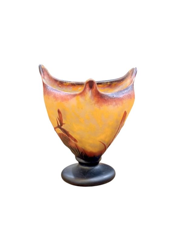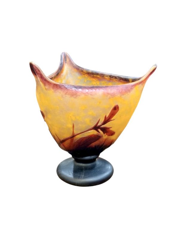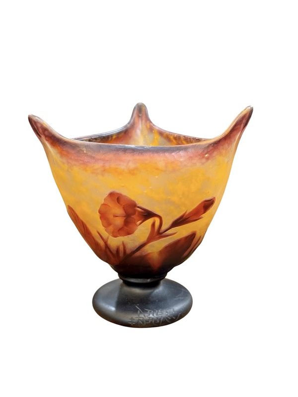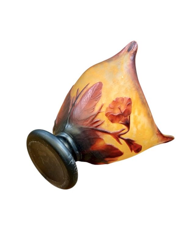Eine seltene doppelwandige Glasvase auf Sockel mit dreieckigem Korpus und abgerundetem Hals, die durch Heißziehen in drei Spitzen geformt wurde. Die im Cameo-Stil geätzte und anschließend mit der Ätzscheibe verfeinerte Dekoration zeigt rote Blüten auf teilweise gehämmertem, marmoriertem Grund. Die Gravur ist von sehr hoher Qualität.