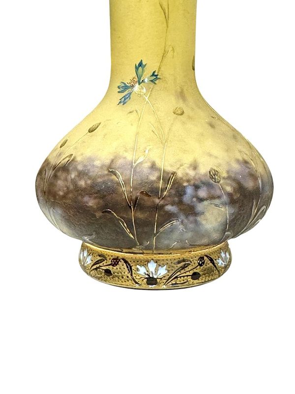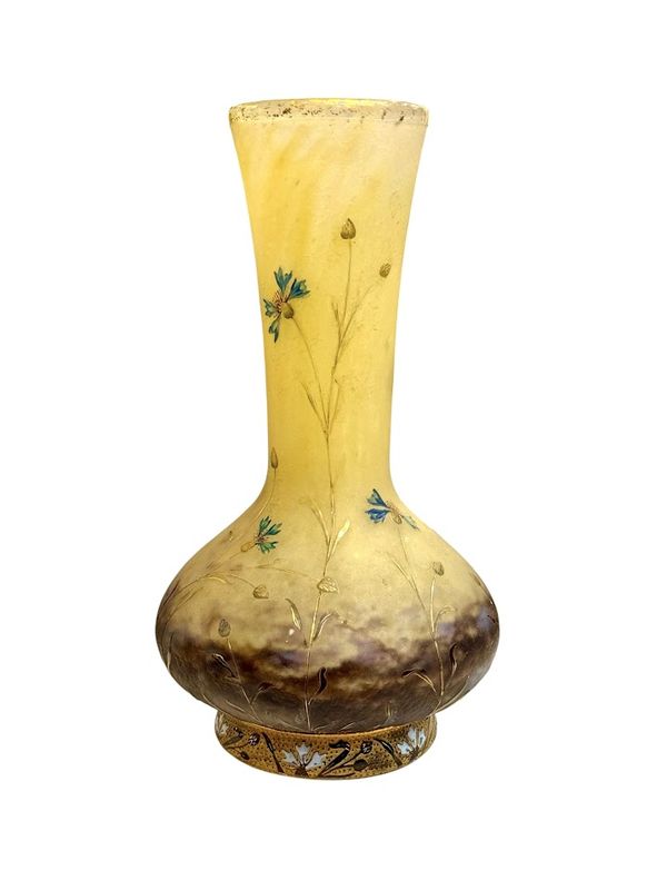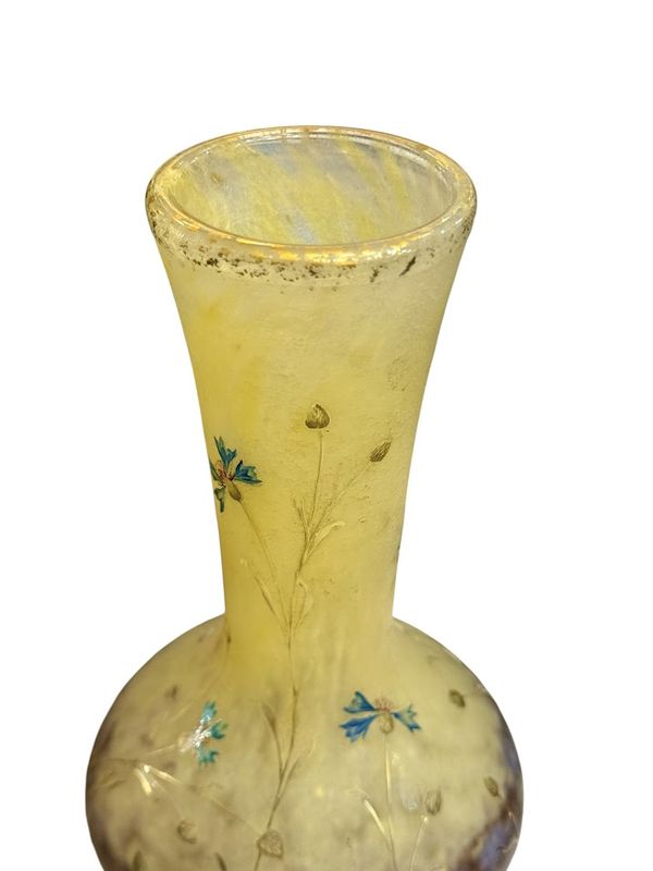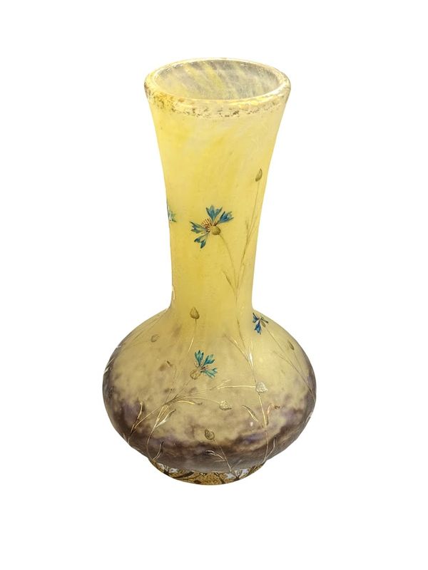 Eine wunderschöne, balusterförmige Vase auf vergoldetem Sockel, gefertigt aus doppelverglastem Glas mit Einschlüssen in Mauve und Gelb. Die fein gravierte und emaillierte Verzierung zeigt Kornblumen und Knospen, die sich durch Goldakzente von mattiertem Hintergrund abheben. Signiert in Gold: Daum Nancy mit dem Lothringerkreuz. Ein Meisterwerk der Handwerkskunst!