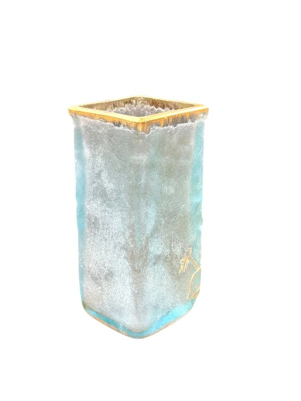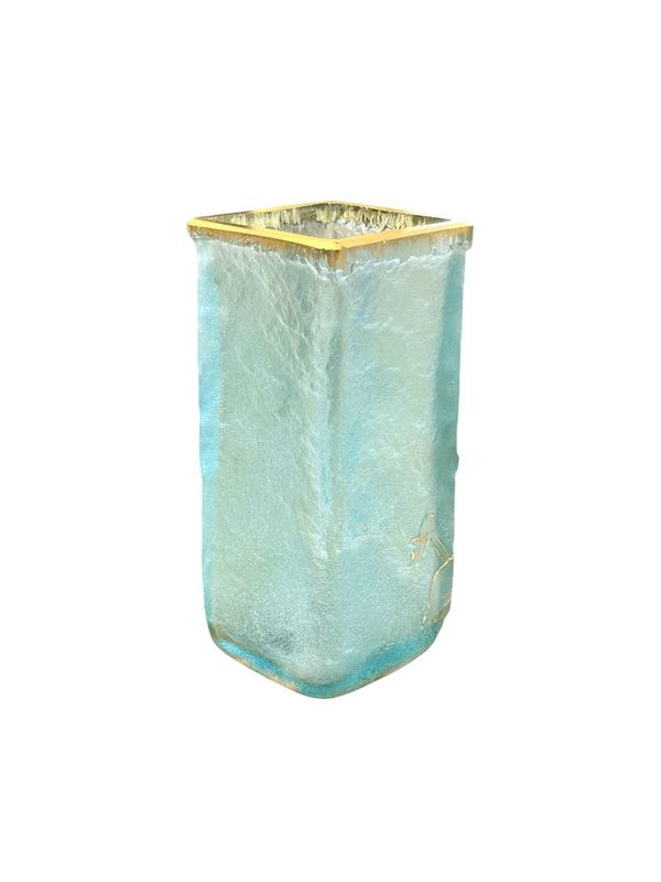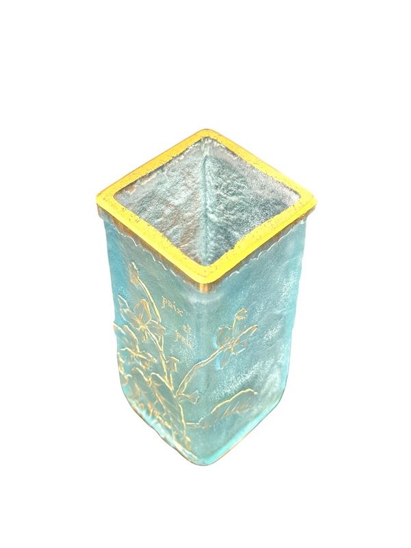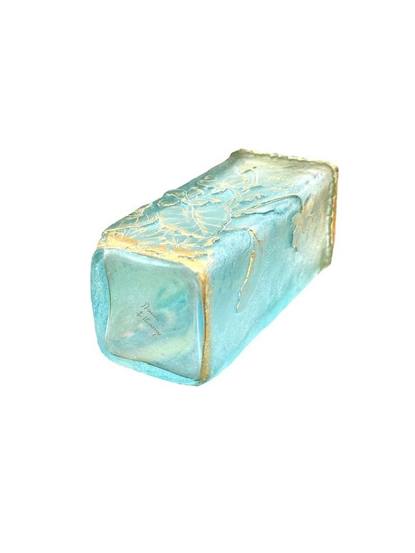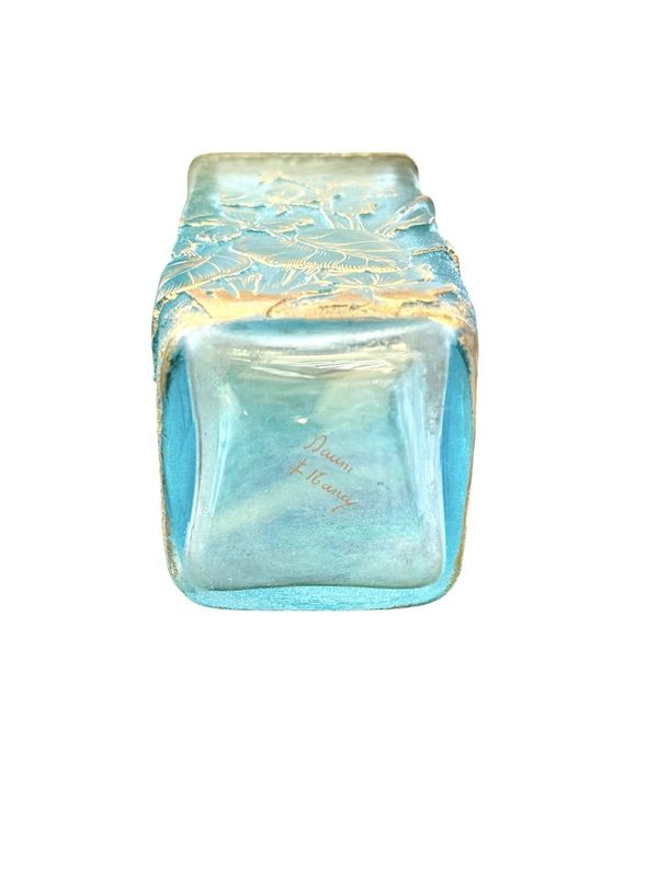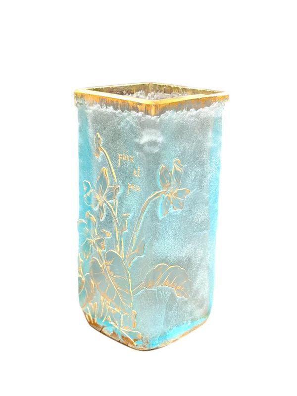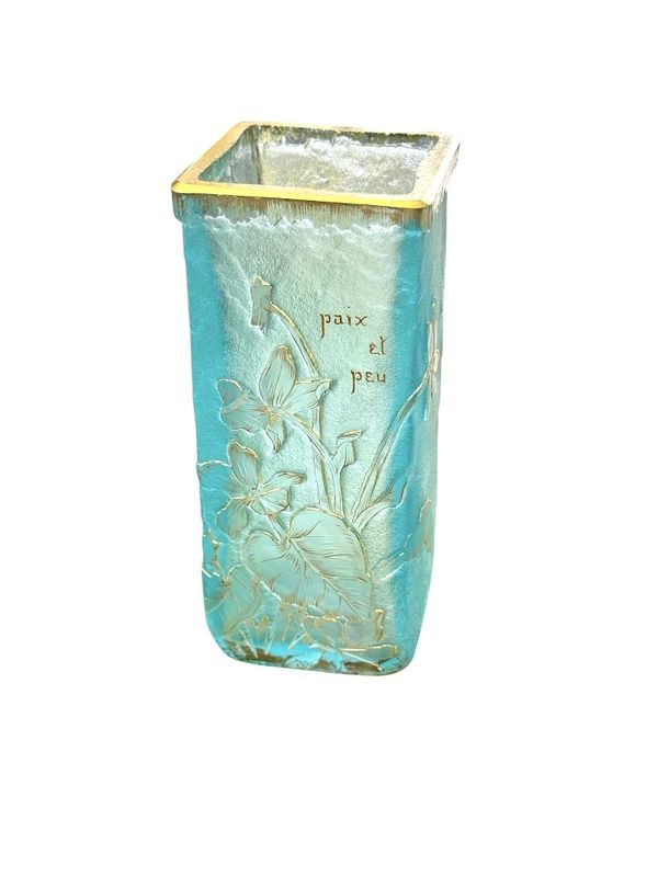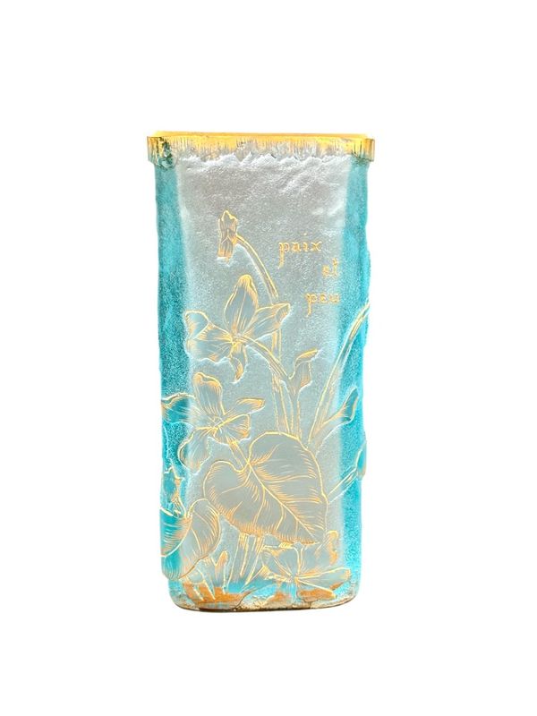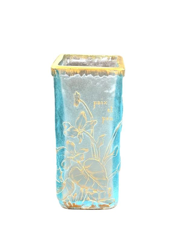 Schöne sprechende Vase "Frieden und kleines" Quadrat in Doppelglasabschnitt. Blumendekoration in sauren Reserven eingraviert und mit Gold auf einem azurblauen blau gefrosteten Hintergrund verbessert. Signature Daum Nancy mit Gold unten. Schönes Lichtwechsel!
