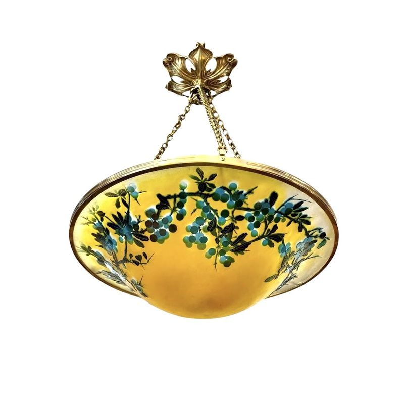 Große, dreifach verglaste Glasschale mit originaler, vergoldeter Bronze- und Messingfassung sowie Deckenleuchte. Die prachtvolle Dekoration ist in feinsten, säuregeätzten Reliefs graviert und zeigt grüne Zweige und Blätter, türkisfarbene Pupillen, alles auf einem seidenmatten gelben Grund. Perfekter Lichteffekt, ob beleuchtet oder unbeleuchtet!