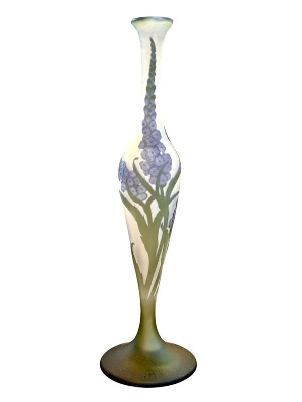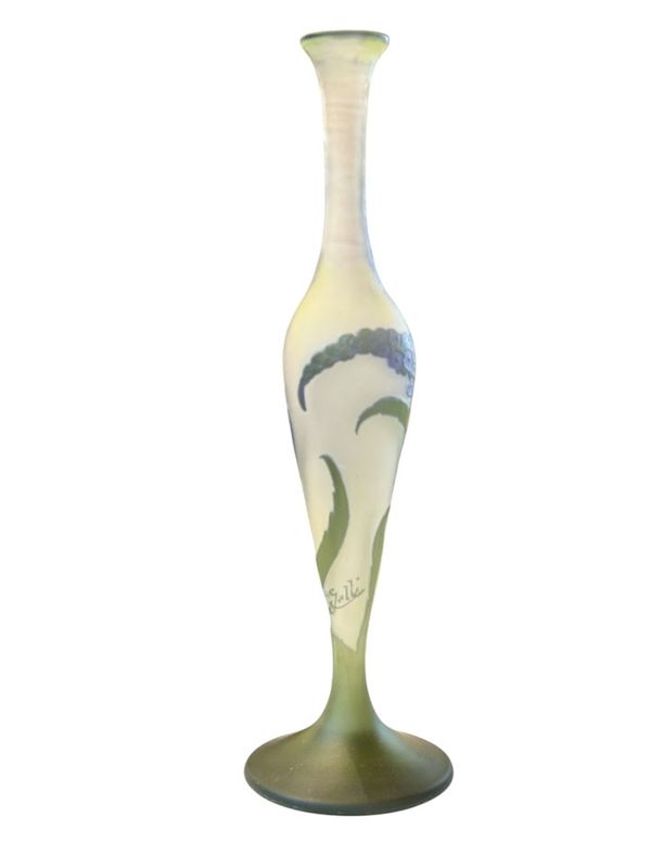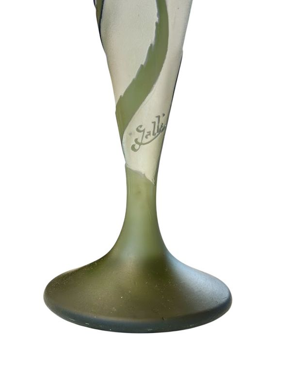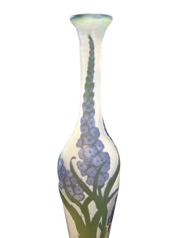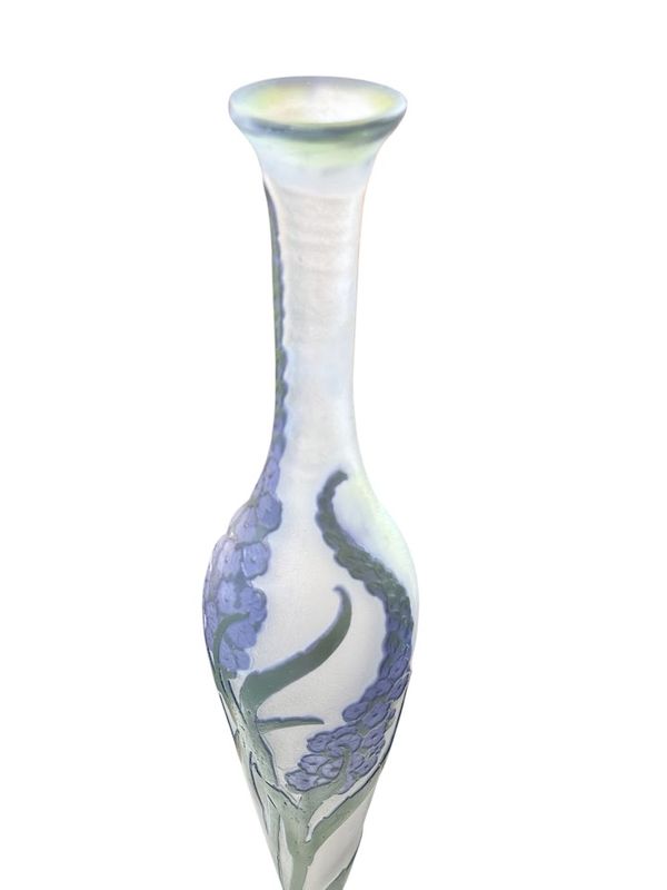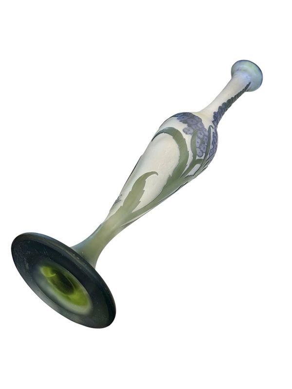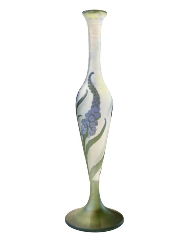 Hochvase -Soliflore mit gestütztem Bauch und abgerundetem Kragen auf dreifachem Glaspodest. Schöne Dekor, die in Camée mit der Säure aus lupen Lupinenblumen und grünen Blättern auf einem frostigen und weißen, beeindruckenden Hintergrund eingraviert ist.