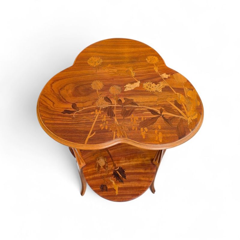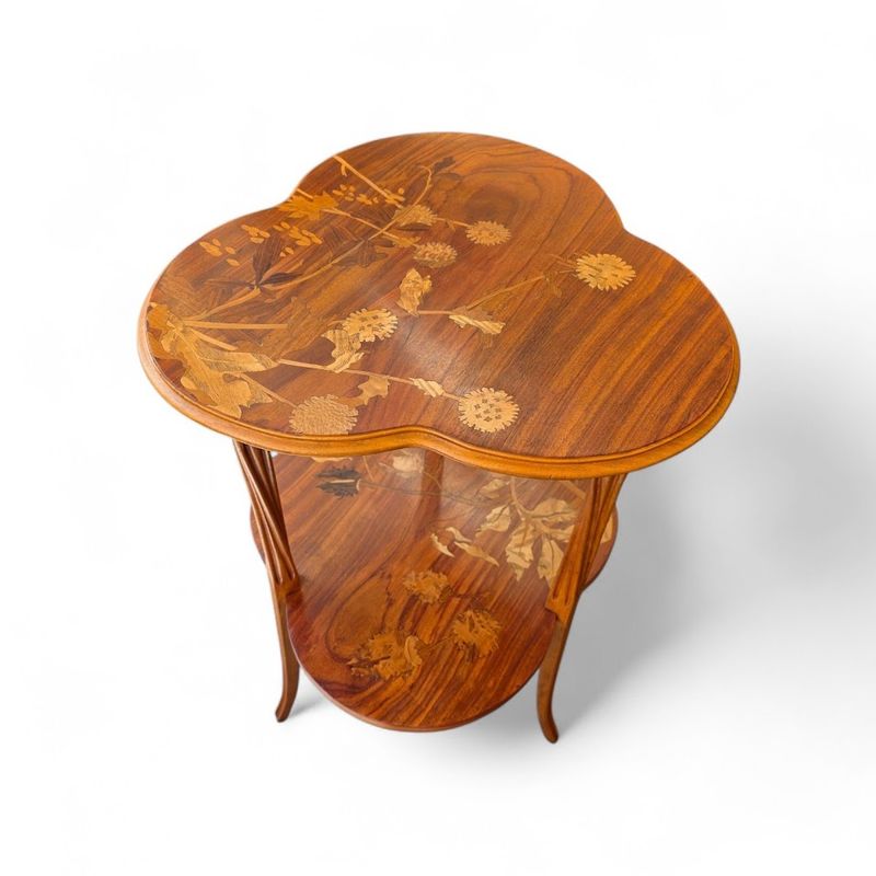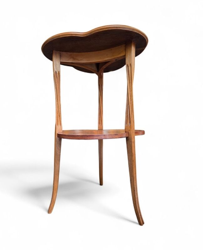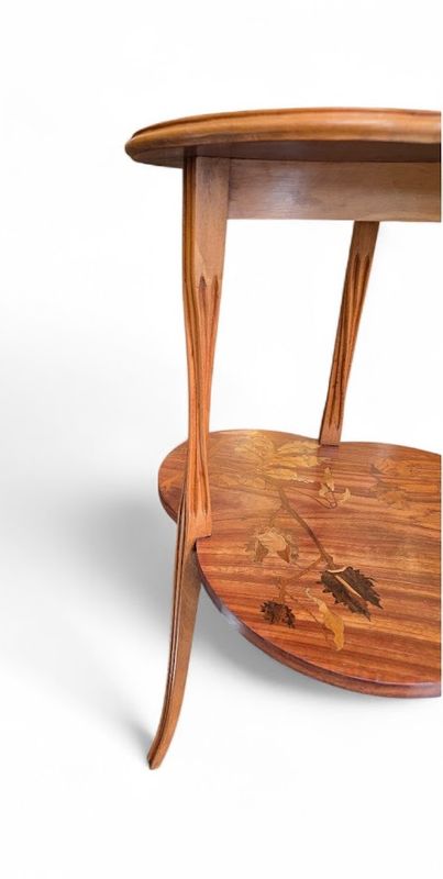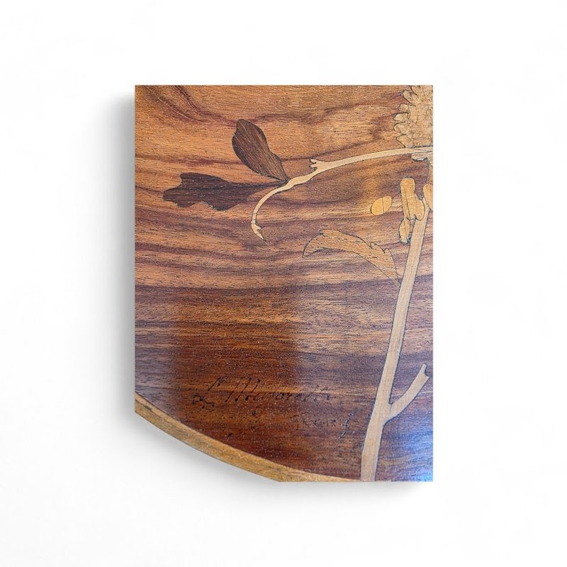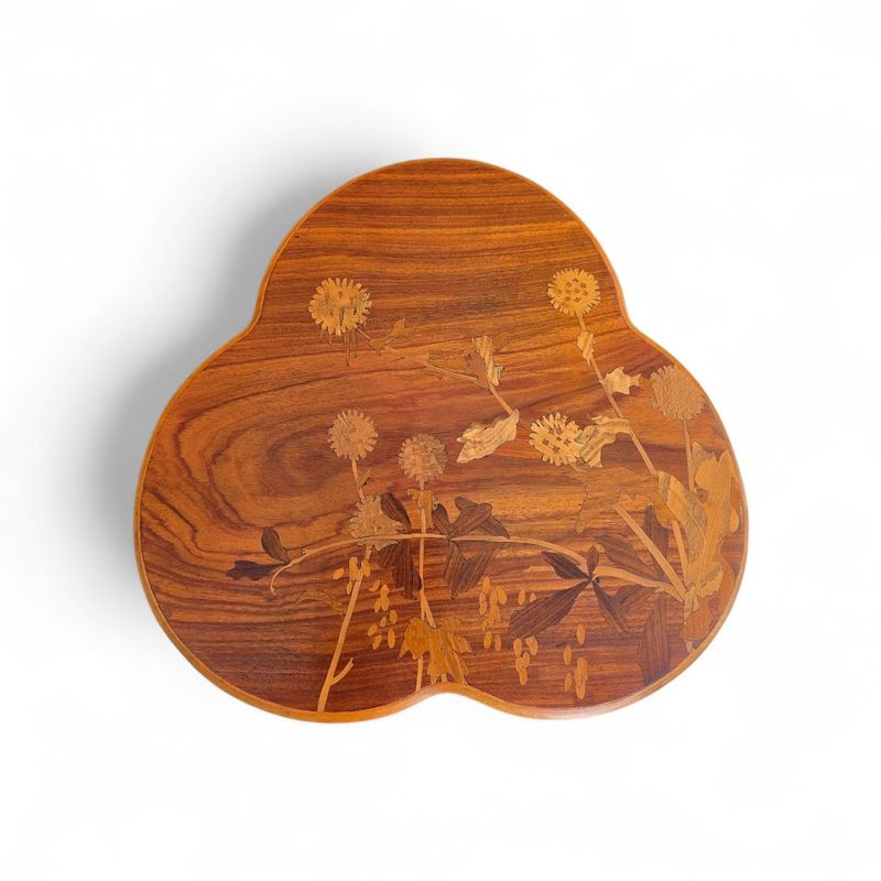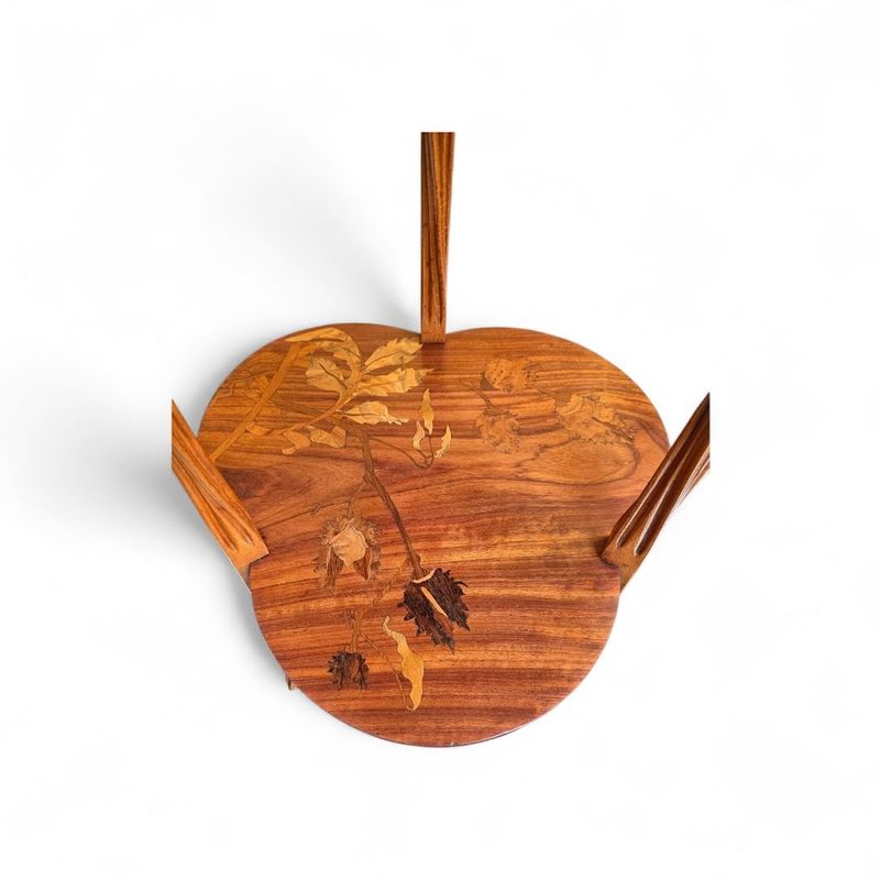Ein Dreibein-Sockeltisch mit einer doppelt gelappten Tischplatte aus massivem Buchenholz. Er ruht auf einem gedrechselten, geschnitzten Fuß und ist mit Intarsien aus Blättern und Blüten auf Palisanderholzgrund verziert. Mit einer Heißprägung versehen und anschließend wunderschön gewachst.