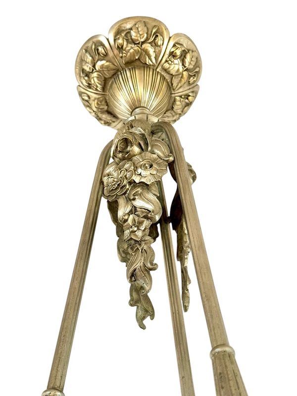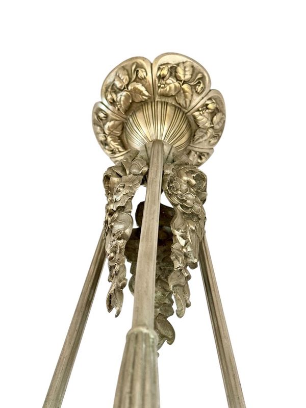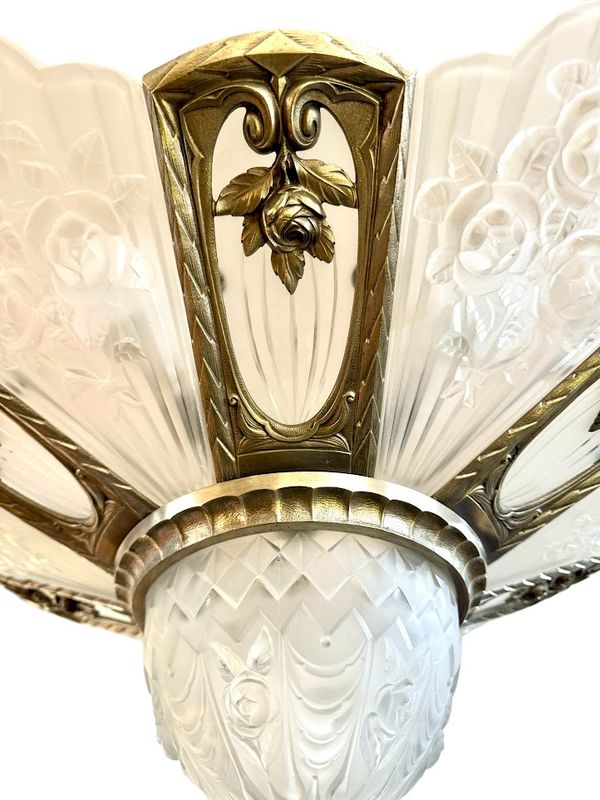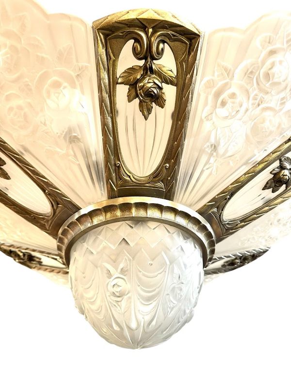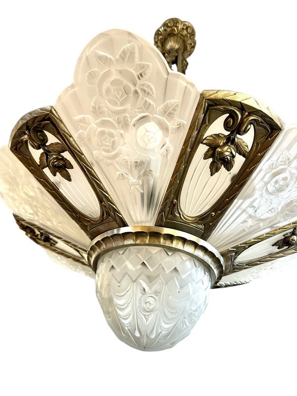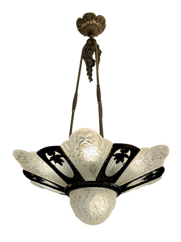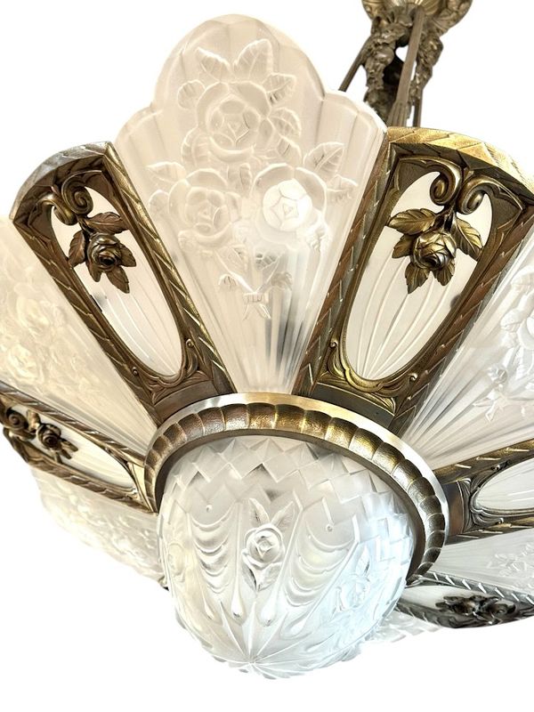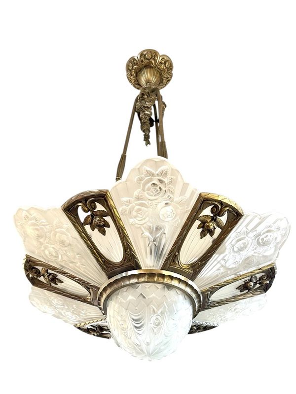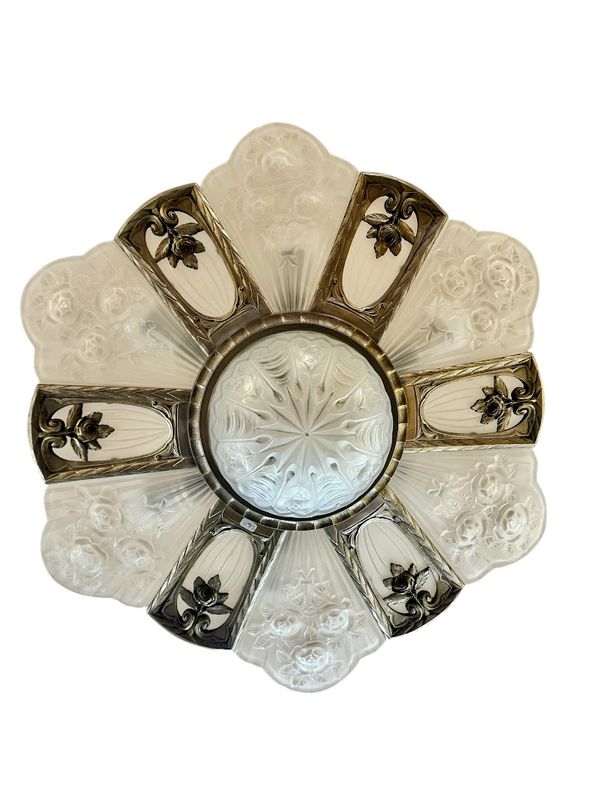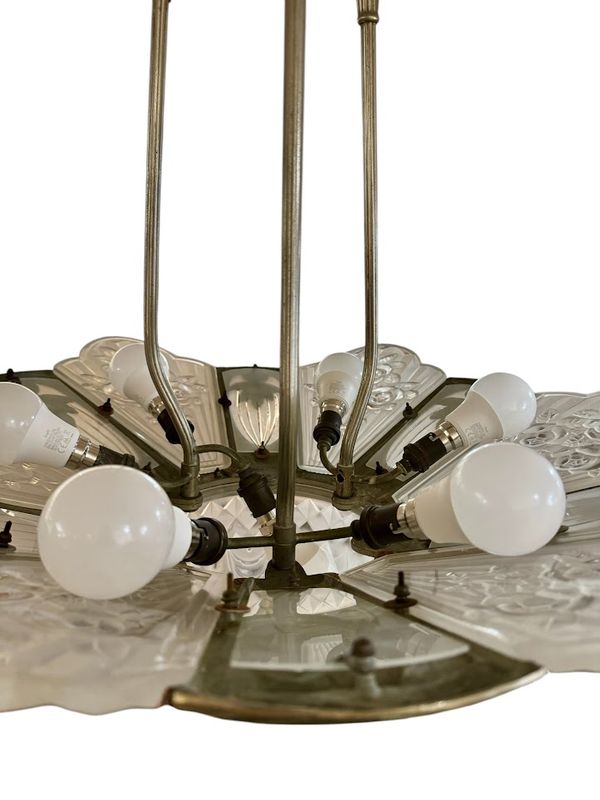 Spektakulärer Kronleuchter in Silberbronze mit offenem Rahmen. Es verfügt über sechs überfüllte Platten mit abgerundetem geschnittenem frostetem Glasglas, sechs flach gerippten Tellern mit einem Rad und einem zentralen Becken. Sehr schönes Lichtwechsel, Elektrifizierung neu von uns neu.