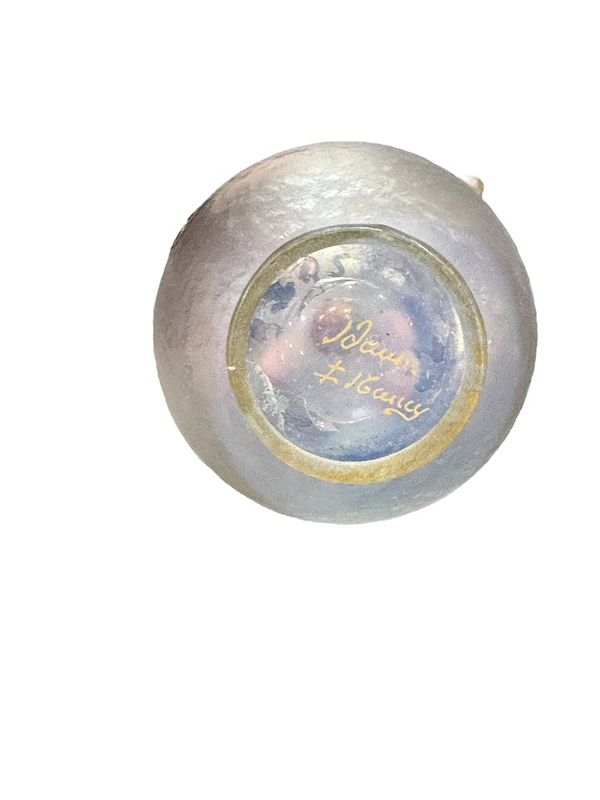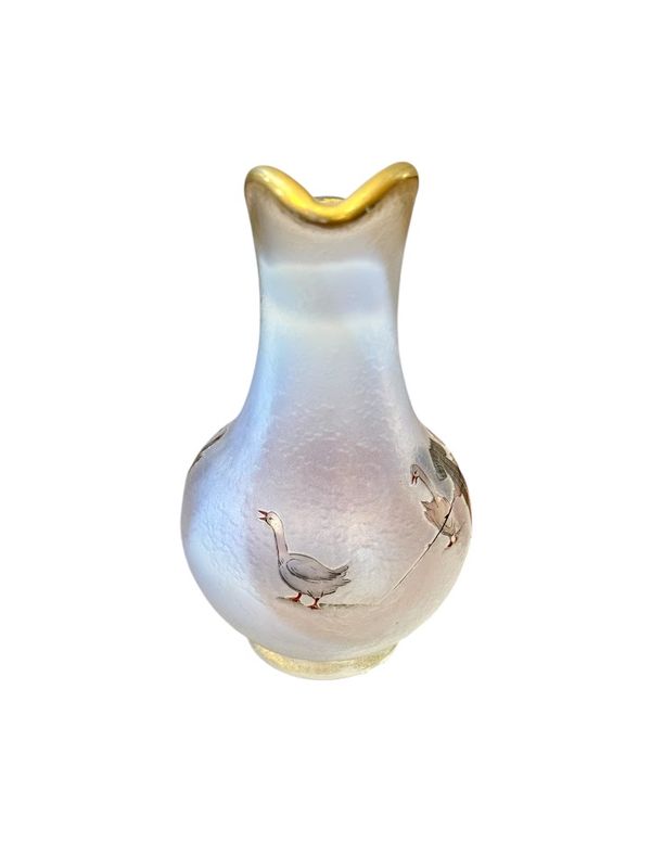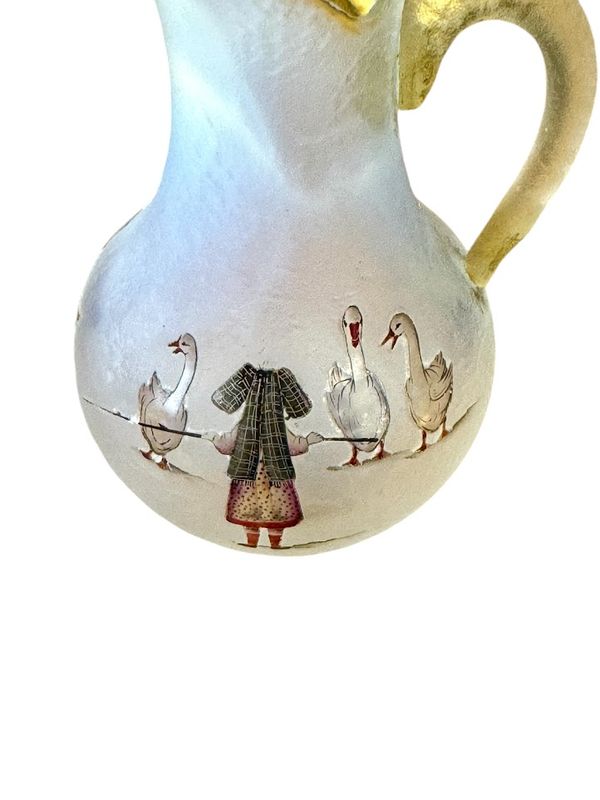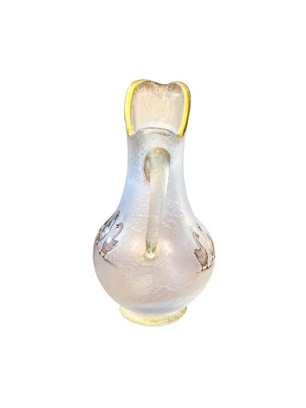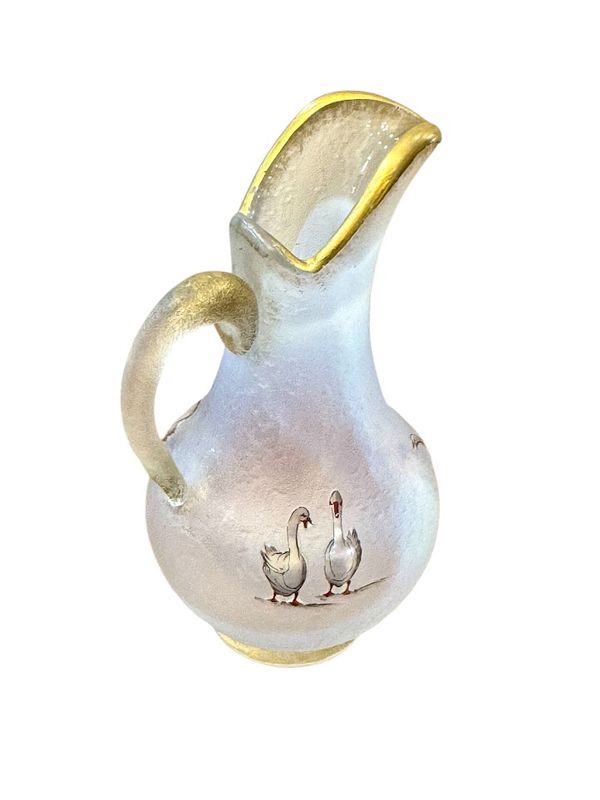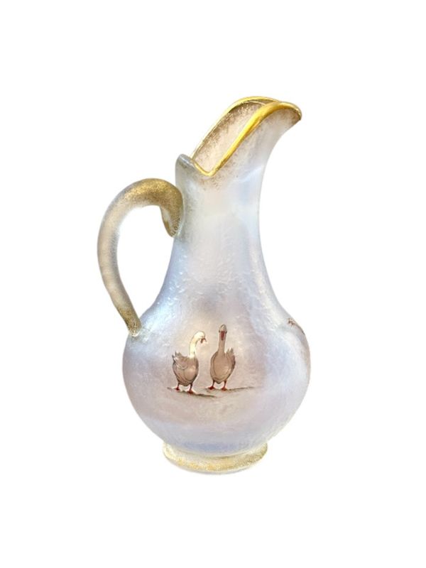 Charming handled pitcher in bluish opalescent glass. Rare and delicate decoration, etched in fine reserves with acid, painted with polychrome enamels and highlighted with gold on a granulated ground, depicting a young Alsatian woman tending geese. Handle applied while hot, superb quality enameling.