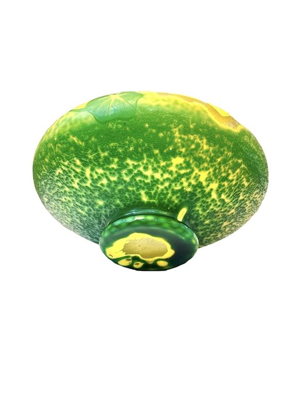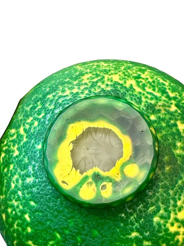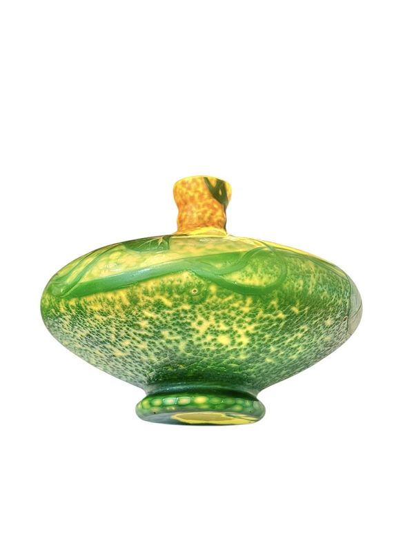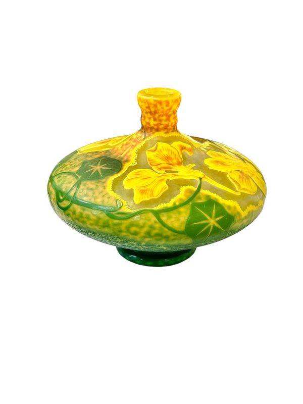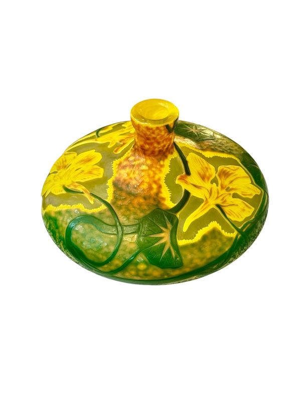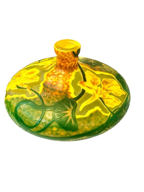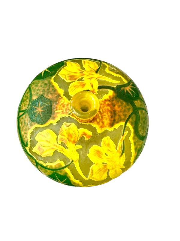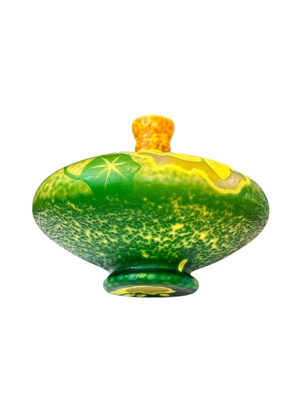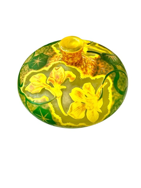 Superb four-tiered glass top-shaped vase. The cameo-etched decoration, finished with acid and wheel engraving, features yellow and red irises in cartouches, green foliage and water lily stems, on a hammered background for the foot and upper section, and speckled on the base of the body. A rare piece, with a perfect luminous effect!