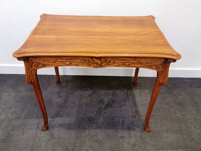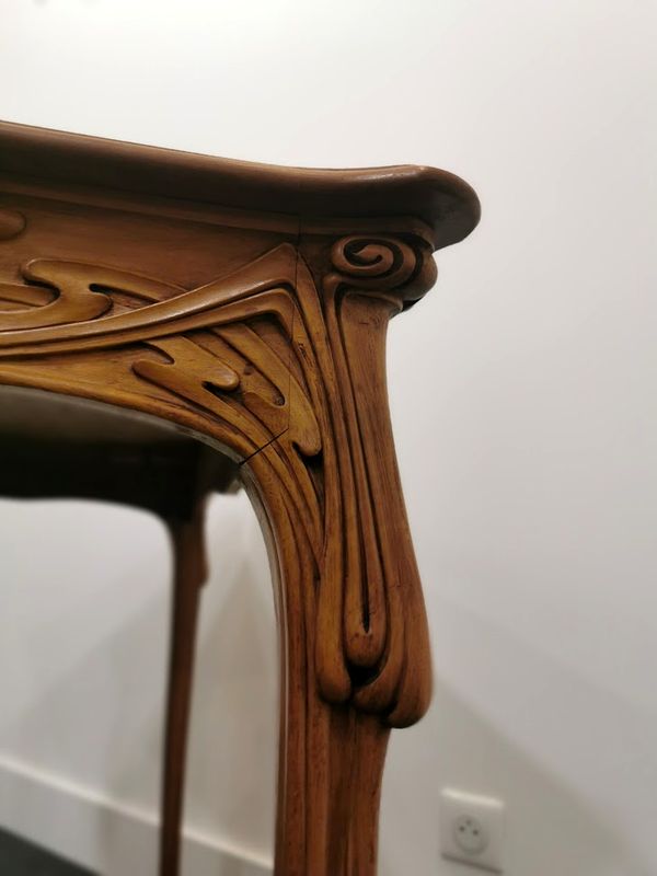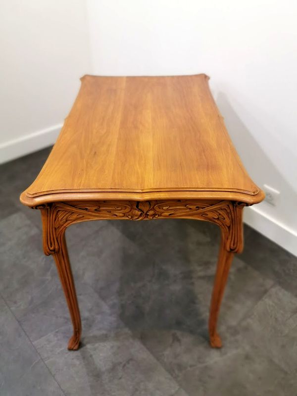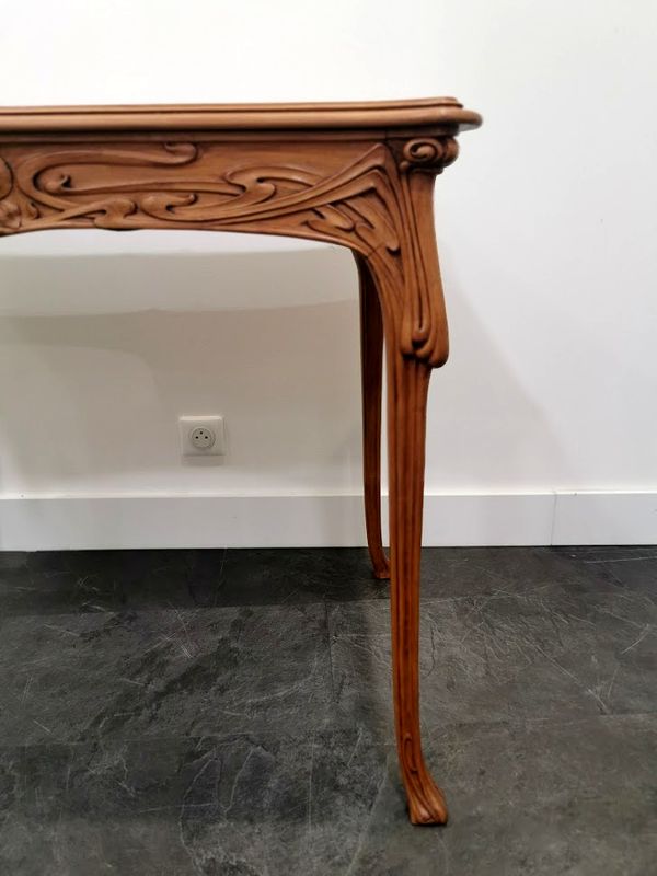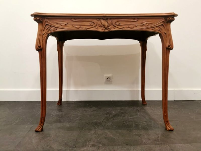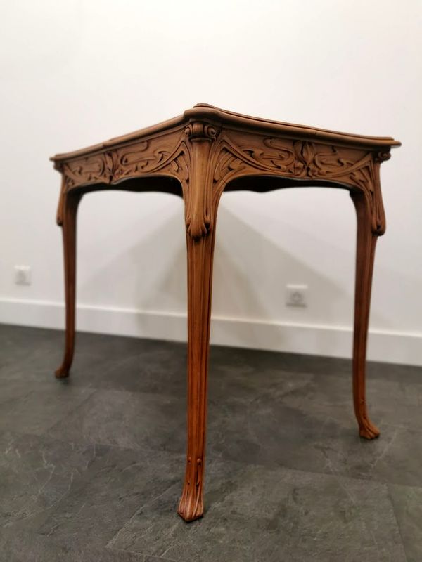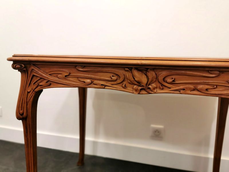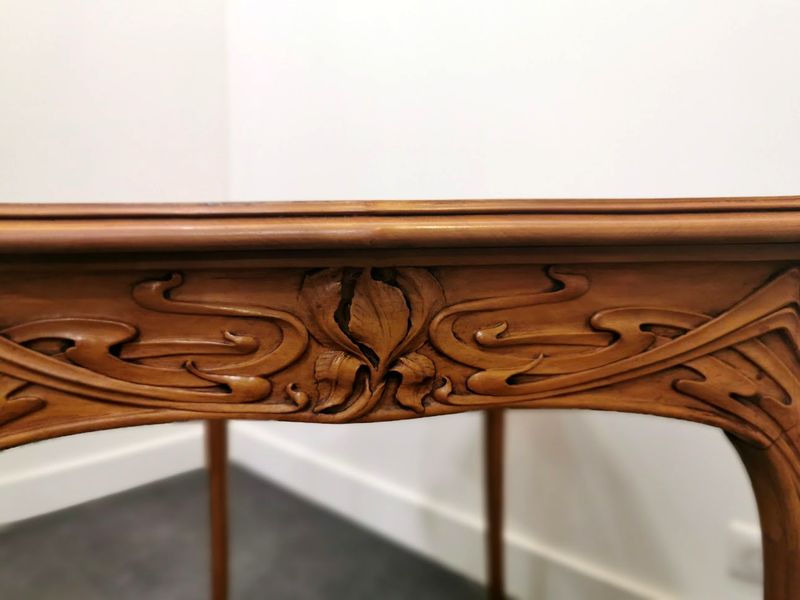 Superb solid pear wood table with rich carved decoration in high relief of iris and whips. Curved base with sculpted edges, decoration of abstract shapes creating a fluidity and dynamic specific to Edouard Colonna. Edouard Colonna Mulheim am Rhein, May 27, 1862-Nice, October 14, 1948 An artist with eclectic talent, he tackles furniture as well as jewelry, porcelain and fabrics. After studying architecture in Brussels, he went to New York in 1882 and worked with the Tiffany house. He exhibited his works at the secession of Munich in 1899, in Turin in 1902, but especially in Paris, during the universal exhibition of 1900, in the "house of art nouveau" of the Samuel Bing group, to which he belongs.