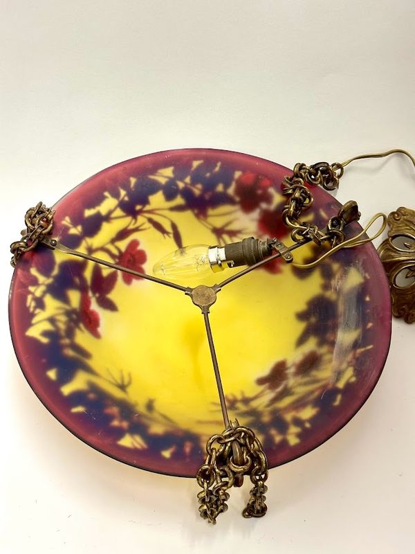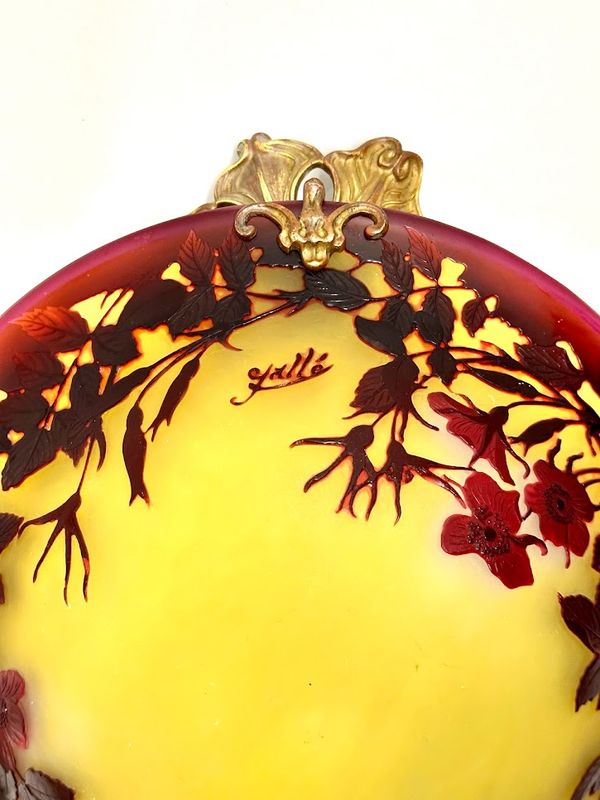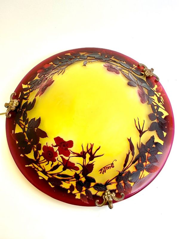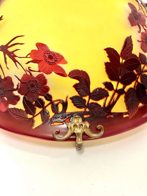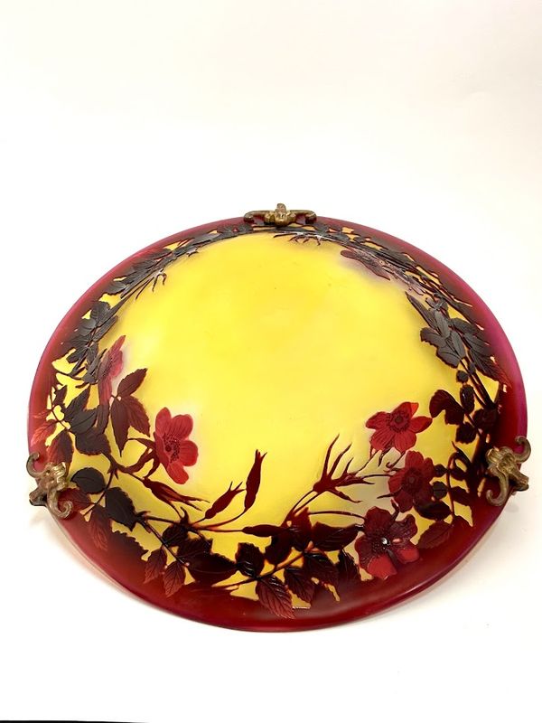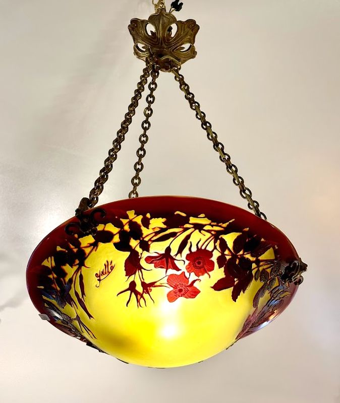 Emile Gallé Ceiling Lamp “Aux Roses” nathalie rousselot2024-09-20T22: 18: 17+02: 00 Item Description 7 December 8, 2023 Glassware Lighting-Gallé-Aux-Roses- Lamp Art Nouveau STYLE ARTIST Emile Gallé YEAR 1894-1904 DIMENSIONS H: 60 cm D: 36 cm PRICE : 3800 euros More information Pretty double glass ceiling light etched in deep acid reserves, with buds and flowering roses on a yellow opacified background. Supports, chains and ceiling light in patinated bronze. Magnificent luminous rendering, both on and off! My Messages SKILLS: Art Nouveau Gallé ceiling light “Aux Roses” nathalie rousselot Site creator Share Facebook Twitter LinkedIn Google + Email