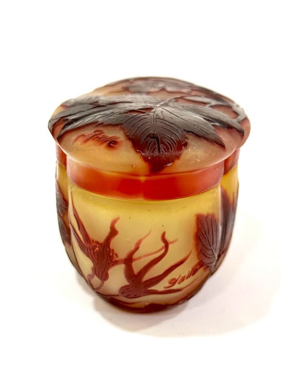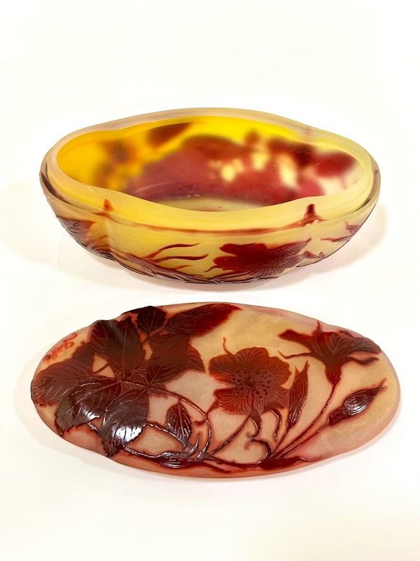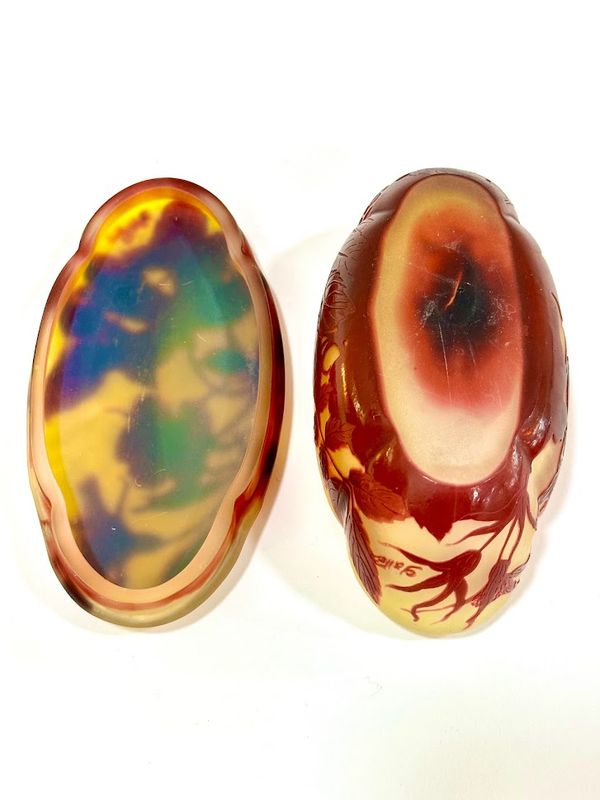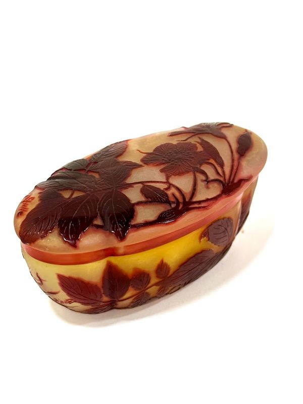 Gallé Candy Box “With Eglantine Flowers” nathalie rousselot2023-04-14T17:22:02+02:00 Item Description 5 April 14, 2023 Glassware Bonbonnière-Gallé-Aux-Fleurs-D’Eglantines- Vase Art Nouveau STYLE ARTIST Emile Gallé YEAR 1918-1931 DIMENSIONS H: 6.5 cm L: 15 cm Width: 8 cm PRICE : 2800 Euros More information Pretty oval-shaped candy dish with circular movement, in multi-layer glass, finely etched with acid, decorated with wild rose flowers, on a satin yellow background. Double signature on the bottom and the lid. Very beautiful luminous rendering! My Messages SKILLS: Art Nouveau Gallé Candy Box “With Eglantine Flowers” nathalie rousselot Site creator Share Facebook Twitter LinkedIn Google + Email