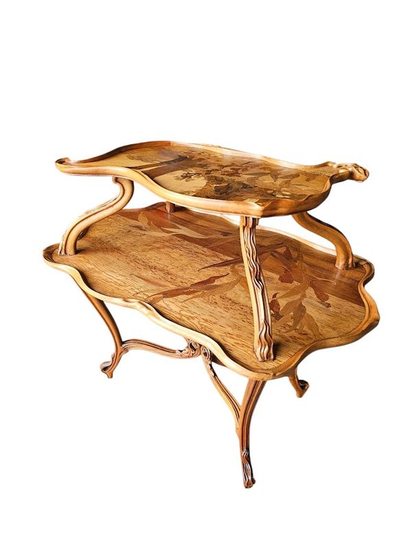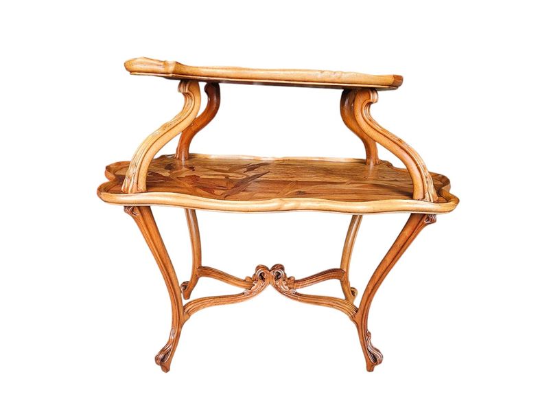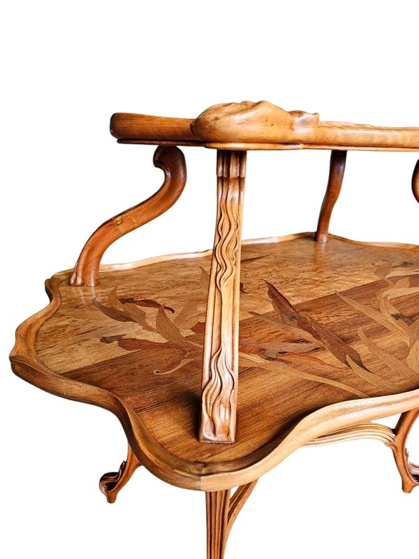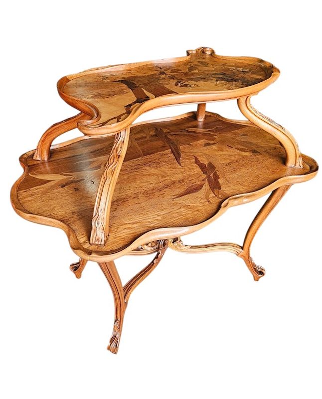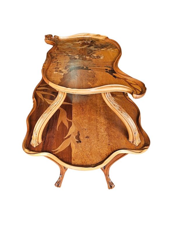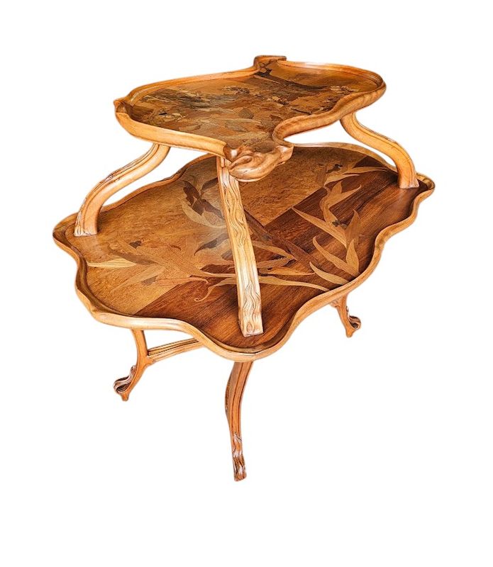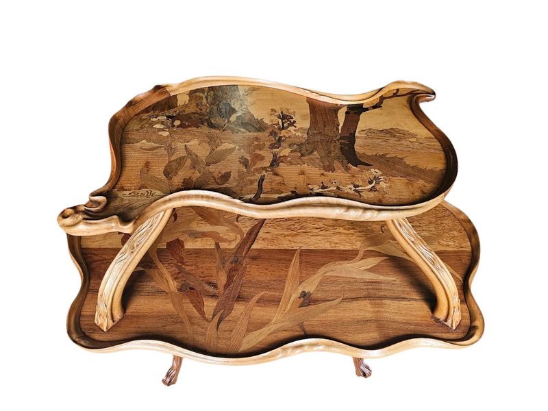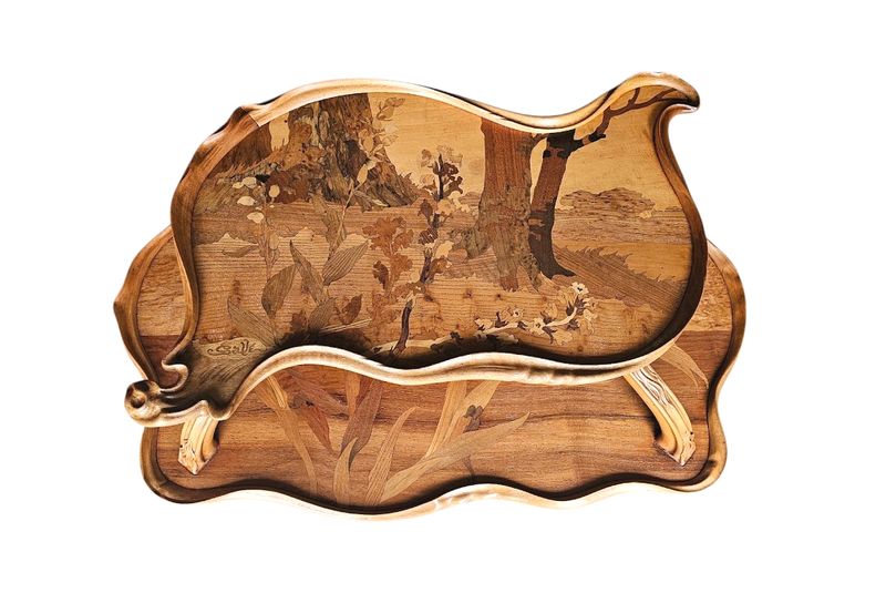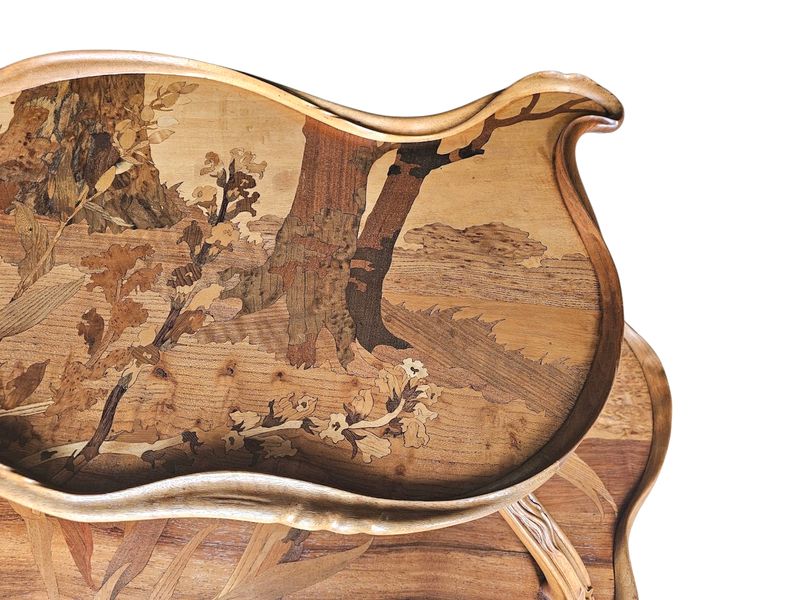 Spectacular tea table in solid, ribbed and sculpted walnut drunk. It has two asymmetrical cutting trays illustrating foliage, the first is marked by a wooded and flowery lake landscape, the second has a decor of marshes. It rests on four curved and openwork feet, united by a spacer carved in the round of stylized foliage. Very rare first period model, exceptional quality of marquetry and sculpture!