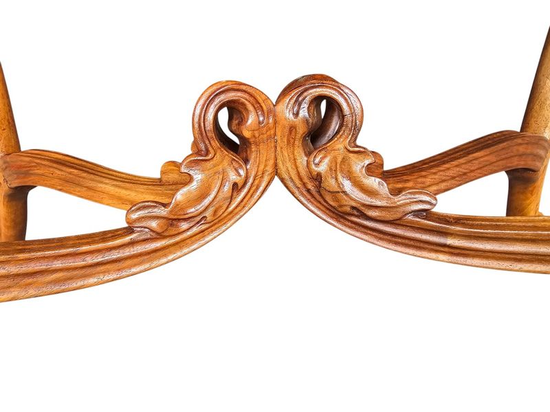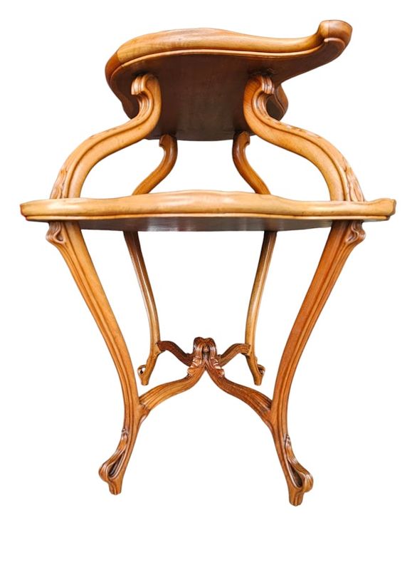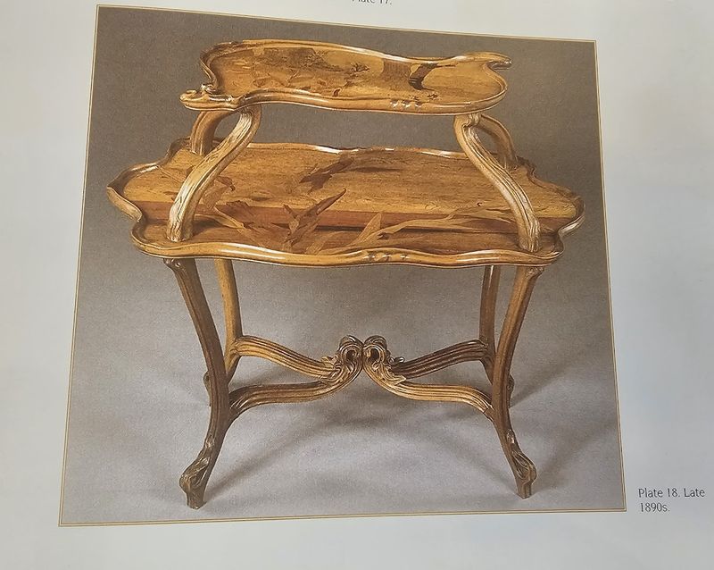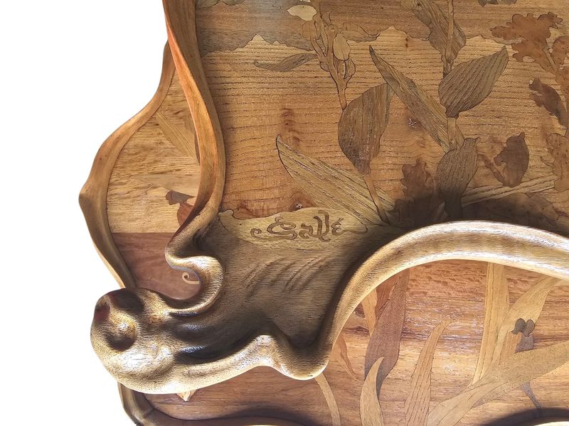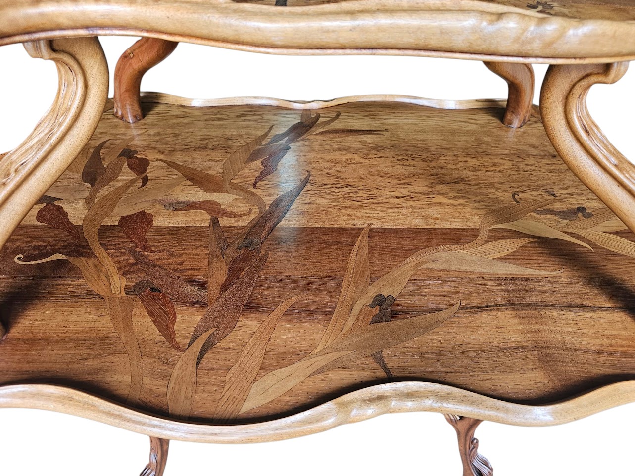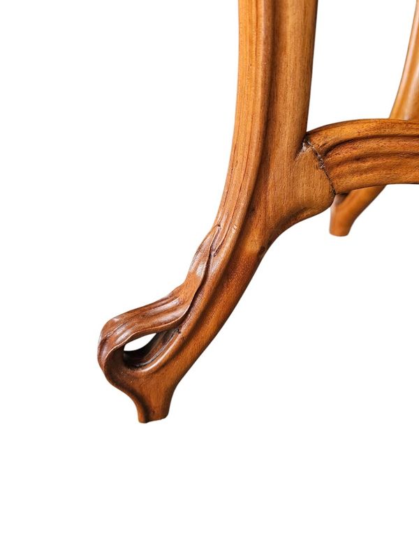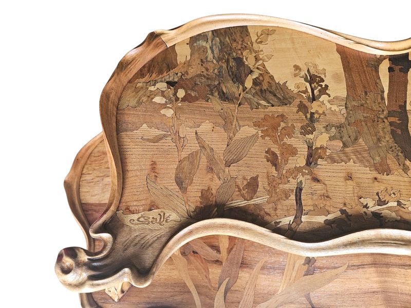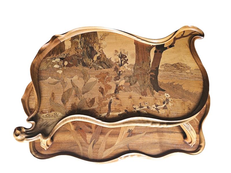 Spectacular tea table in solid, ribbed and sculpted walnut drunk. It has two asymmetrical cutting trays illustrating foliage, the first is marked by a wooded and flowery lake landscape, the second has a decor of marshes. It rests on four curved and openwork feet, united by a spacer carved in the round of stylized foliage. Very rare first period model, exceptional quality of marquetry and sculpture!