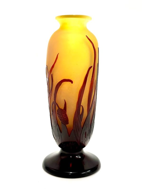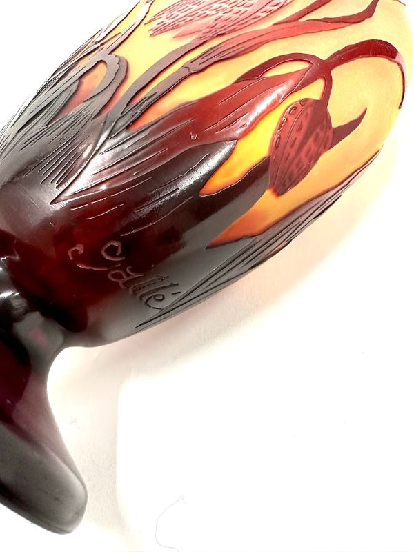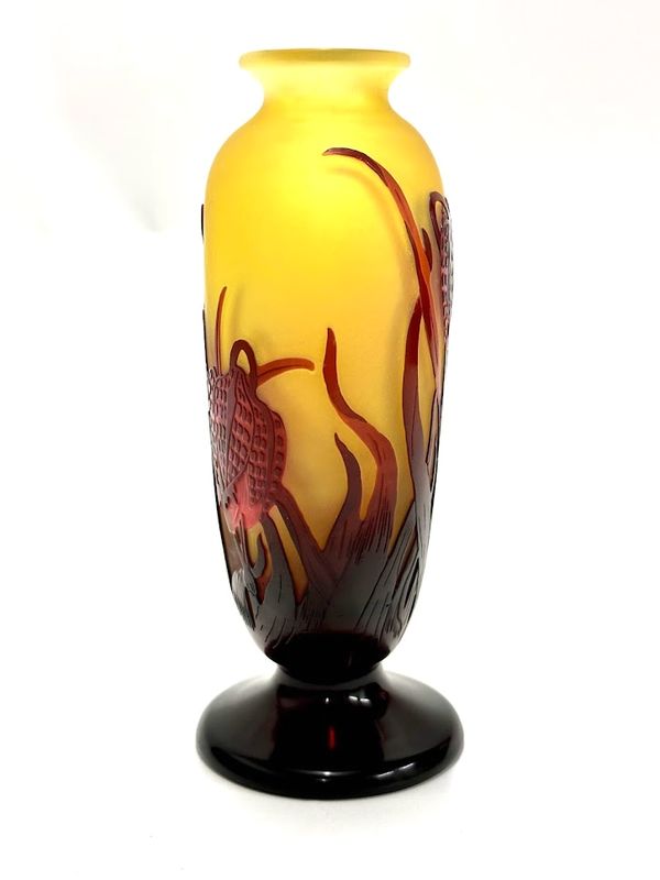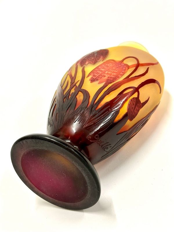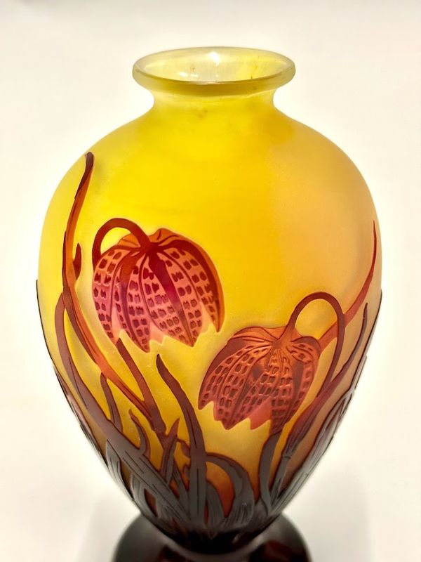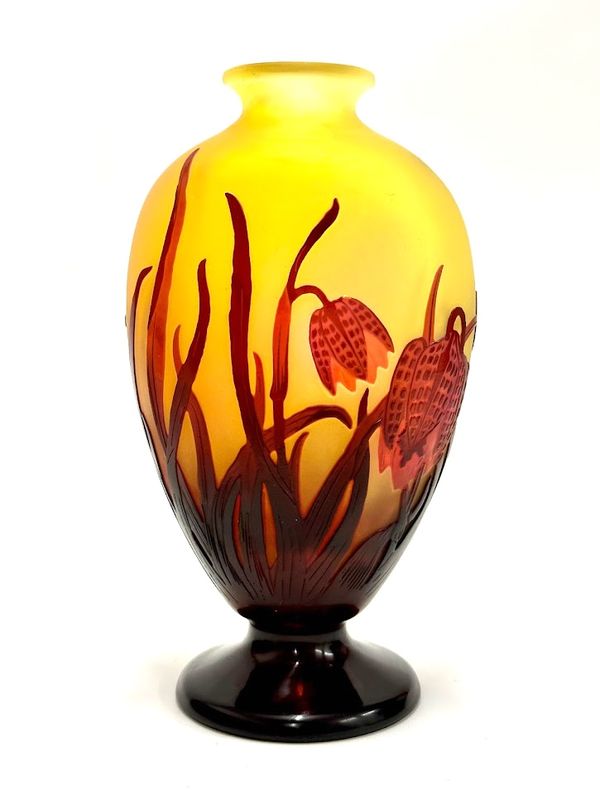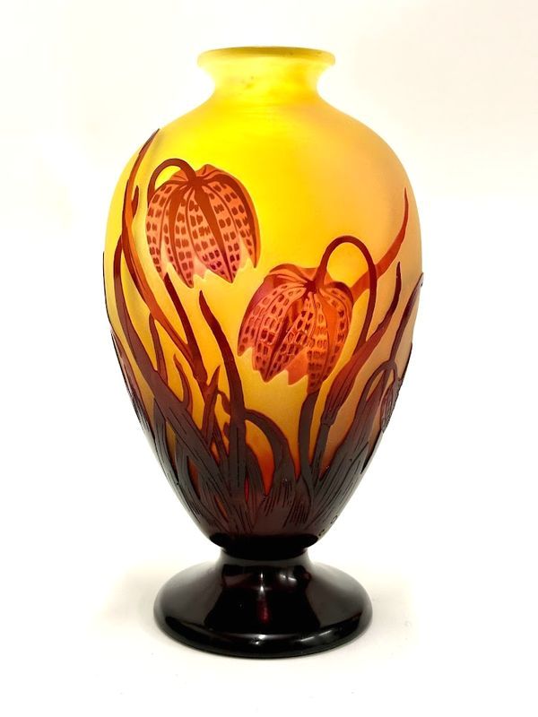 Emile Gallé Vase “Fritillaries Guinea Fowl” nathalie rousselot2024-01-19T19:08:13+01:00 Item Description 7 January 19, 2024 Glassware Vase-Gallé-Fritillaries- Vase Art Nouveau STYLE ARTIST Emile Gallé YEAR 1918-1931 DIMENSIONS H: 20 cm L: 11 cm D: 8 cm PRICE : 3200 Euros More information Rare baluster vase with flat body on pedestal with round neck in double glass. Very beautiful finely engraved acid cameo decoration of red fritillaries on a satin yellow background. Beautiful quality of production! My Messages SKILLS: Art Nouveau Gallé Vase With Fritillaries nathalie rousselot Site creator Share Facebook Twitter LinkedIn Google + Email