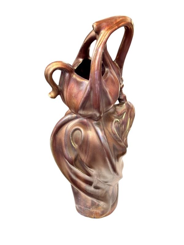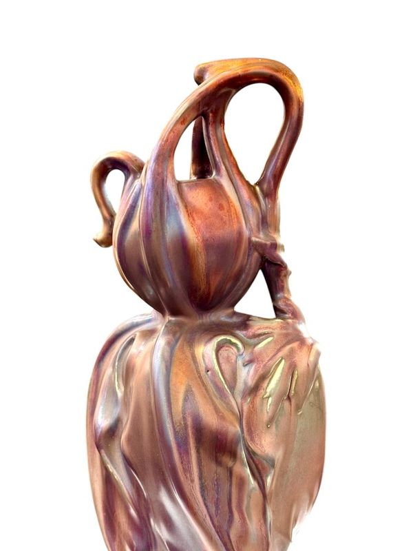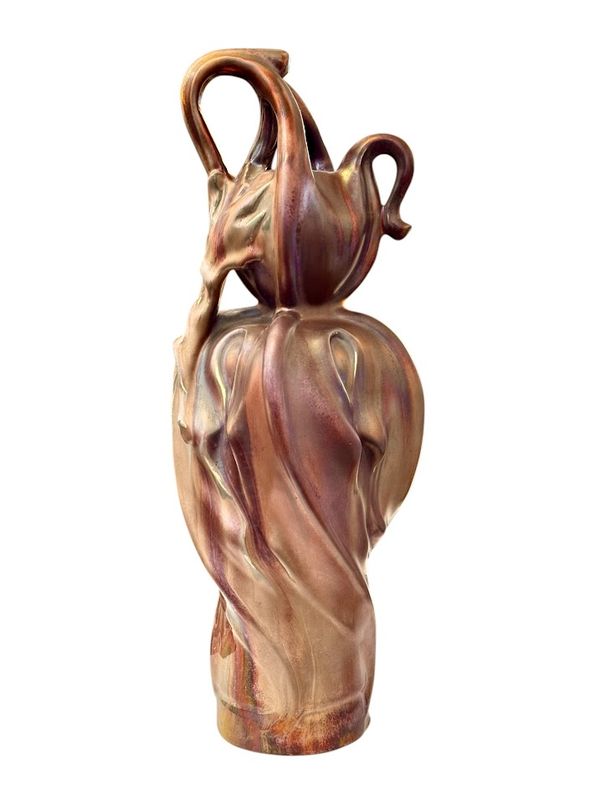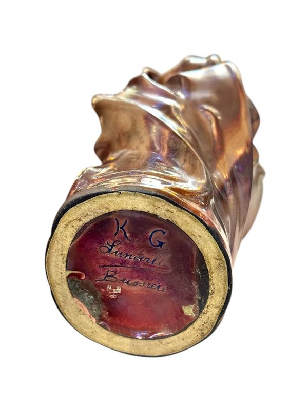 Superb gourd-shaped vase in fine earthenware, fired at low temperature, with an iridescent glaze and metallic sheen, matte and glossy, known as "glass skin." Signed KG Lunéville and Bussière. The model takes its name from the flower's pedicel, which supports all the floral elements. It illustrates Bussière's talent as a sculptor, who focused his work on the plant structure, often retaining only one aspect to create a realistic piece with fluid, modern lines.