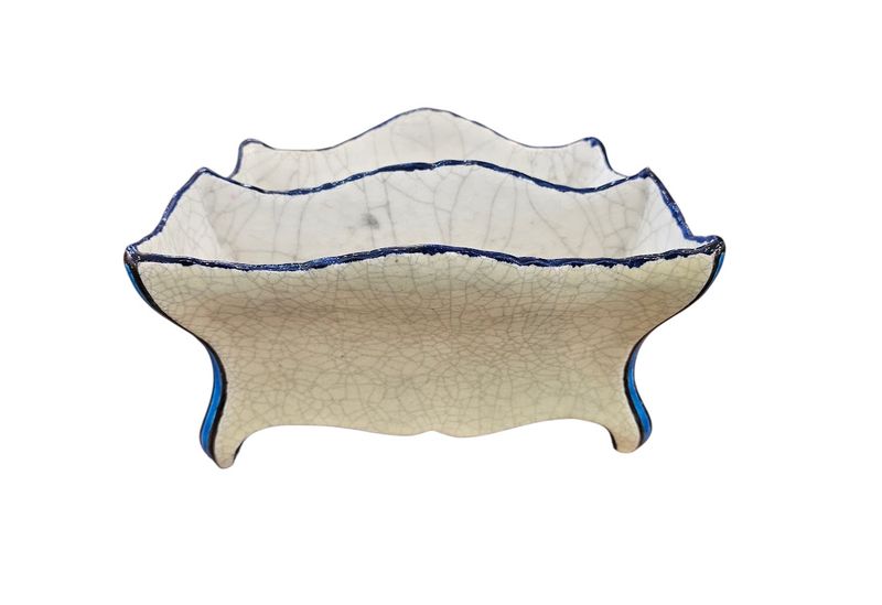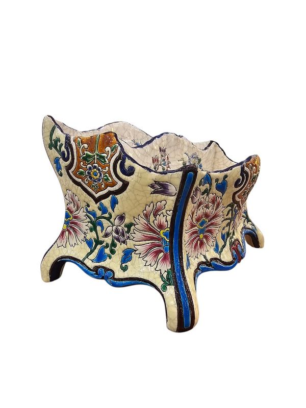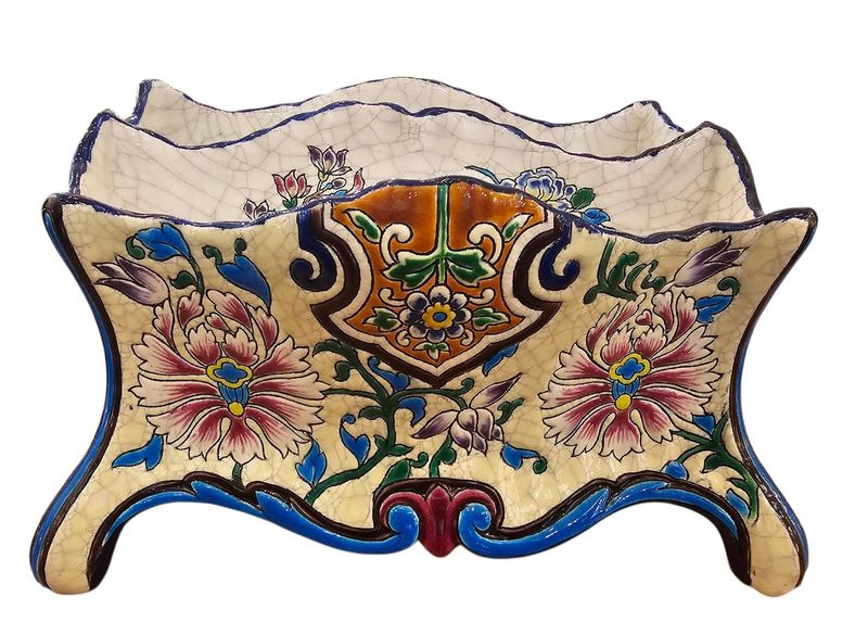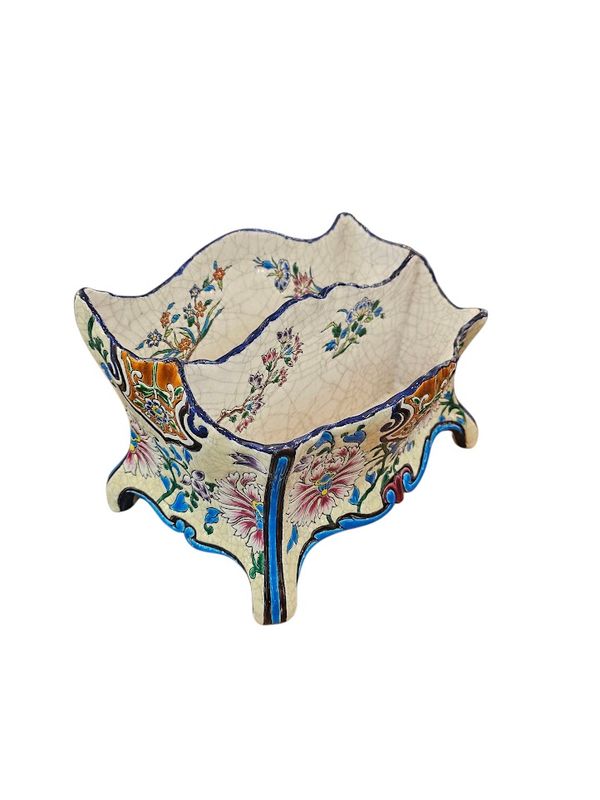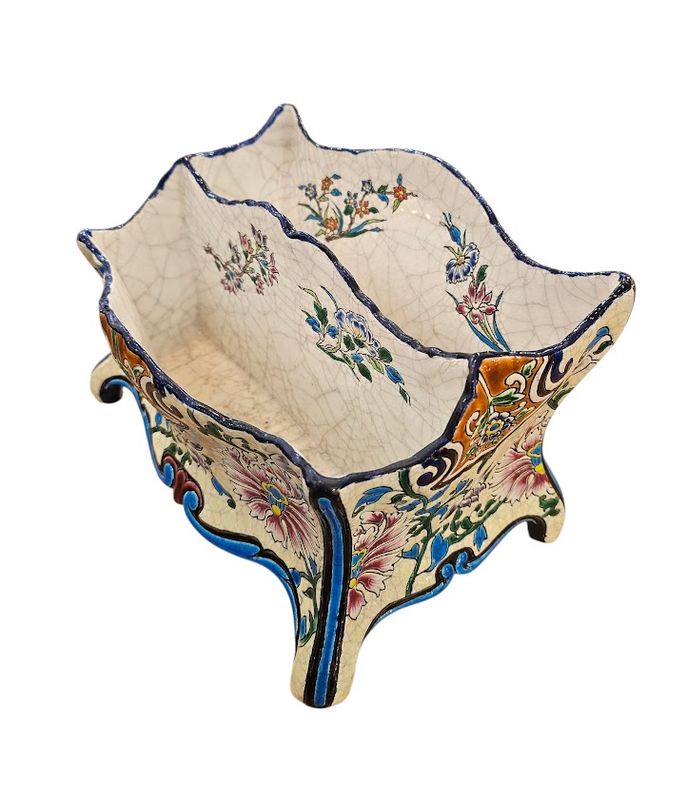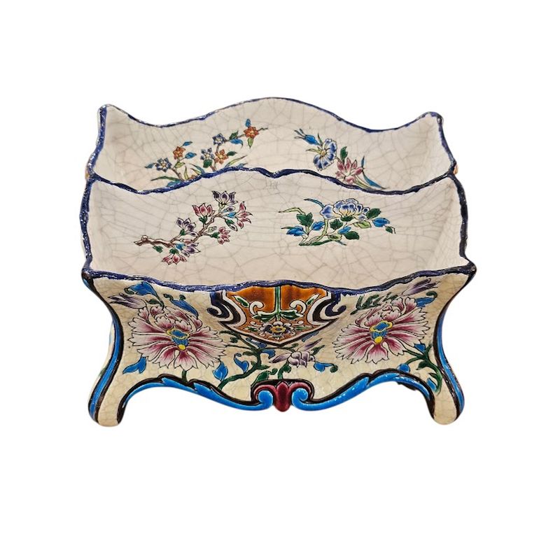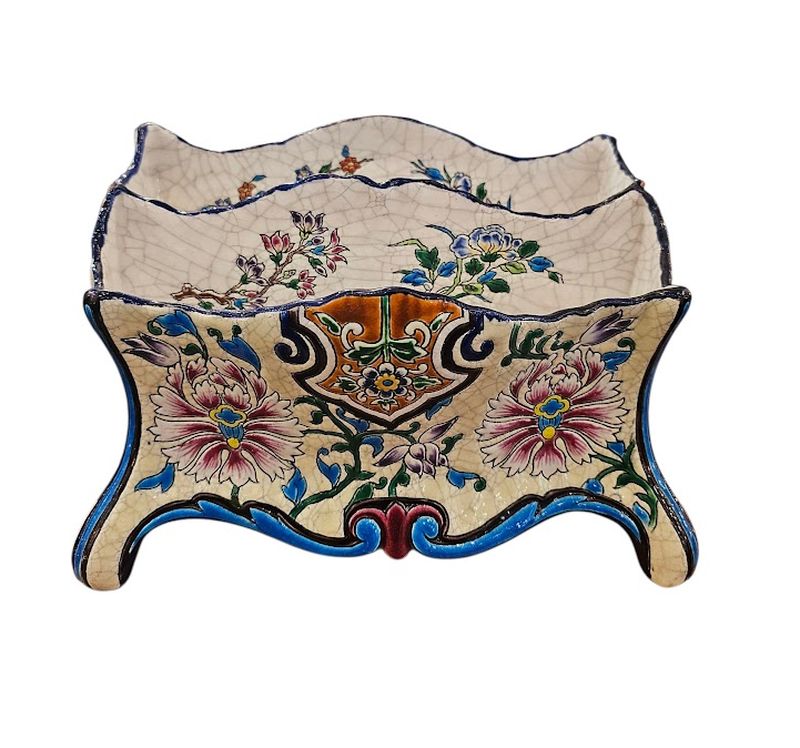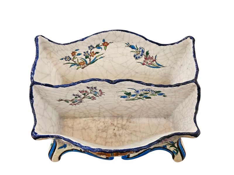 A rare double-compartment letter holder, its three sides decorated with Japanese-inspired chrysanthemums and polylobed cartouches reminiscent of Persia, all set against an eggshell white background. The interior is adorned with flowering branches, the floral motifs outlined in delicate relief, a truly beautiful piece of craftsmanship.