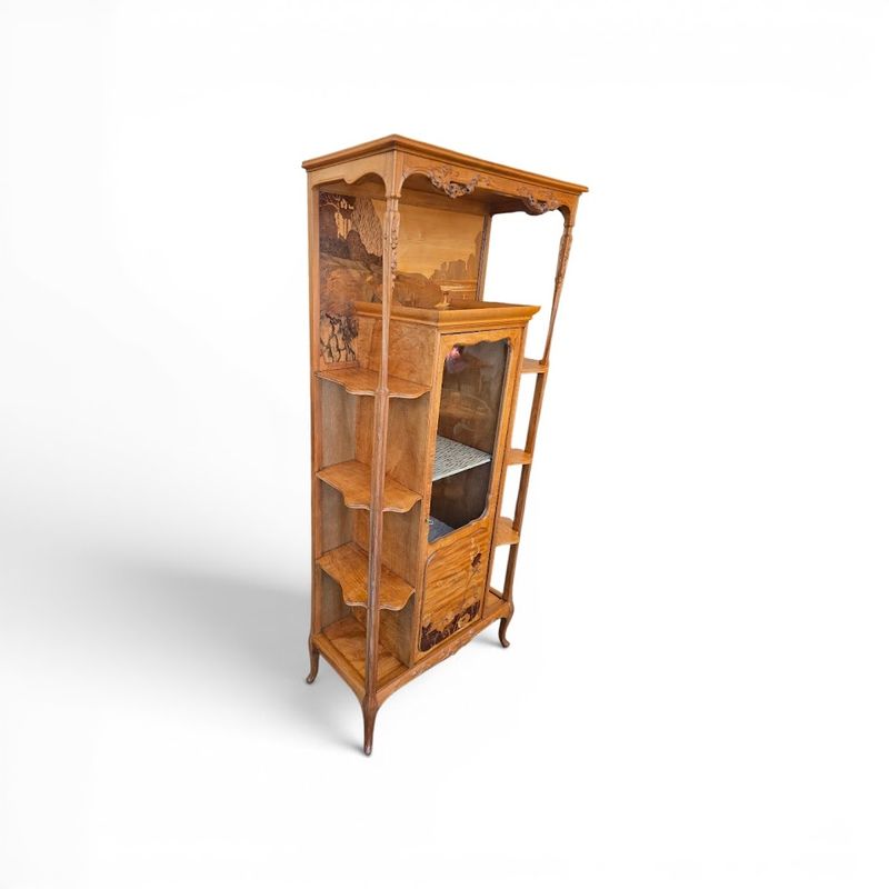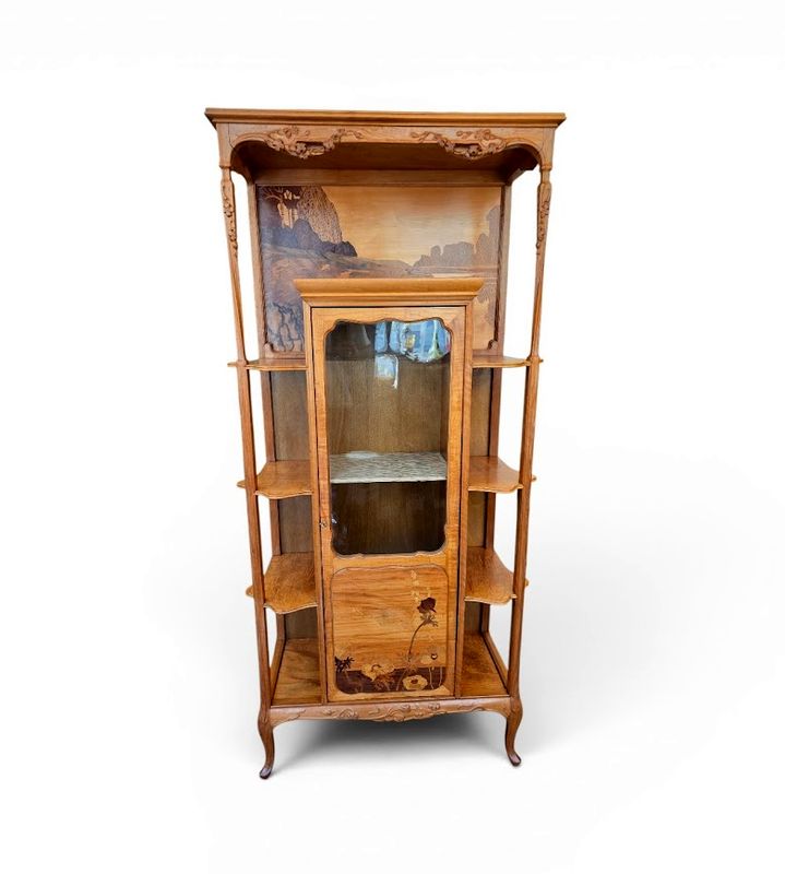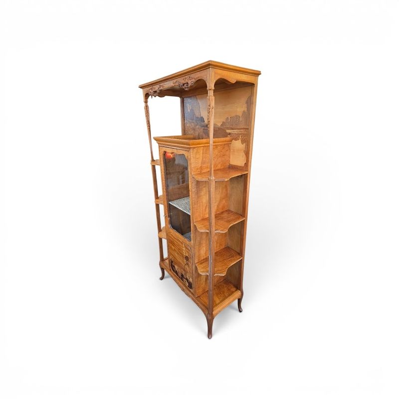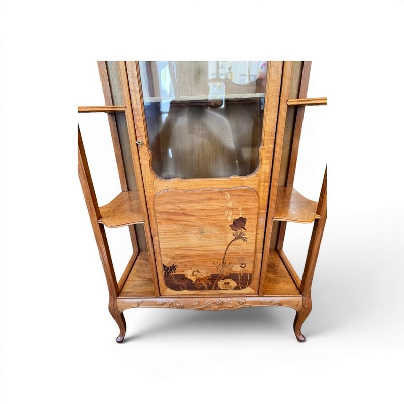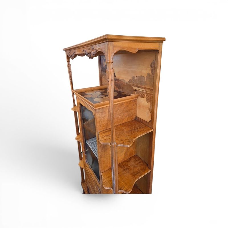 Superb display cabinet in solid walnut and maple veneer, molded and carved with a clematis motif. It features a central compartment opening with a glazed and marquetry door decorated with poppies, six projecting shelves with scalloped moldings, and a large niche decorated with a lakeside landscape and water lilies. Saber legs, original gilt bronze key, hot-stamped mark, beautiful waxed finish. Ref: Louis Majorelle by Alastair Duncan