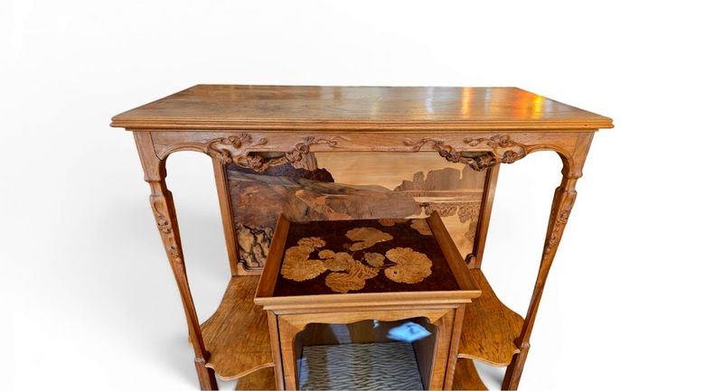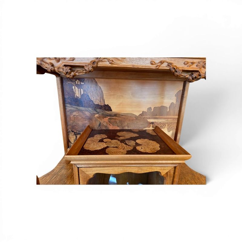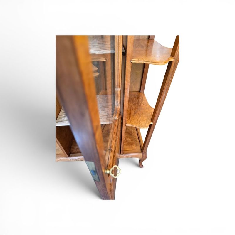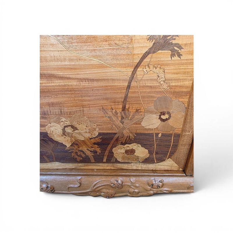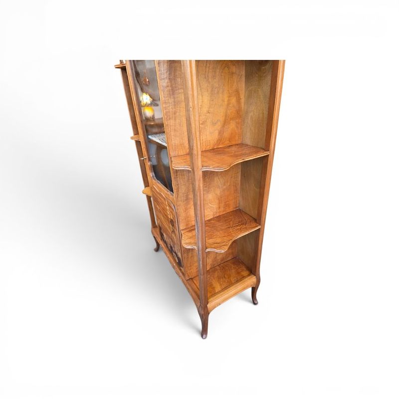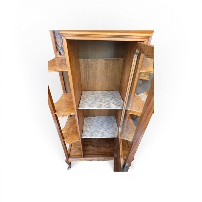Superb display cabinet in solid walnut and maple veneer, molded and carved with a clematis motif. It features a central compartment opening with a glazed and marquetry door decorated with poppies, six projecting shelves with scalloped moldings, and a large niche decorated with a lakeside landscape and water lilies. Saber legs, original gilt bronze key, hot-stamped mark, beautiful waxed finish. Ref: Louis Majorelle by Alastair Duncan