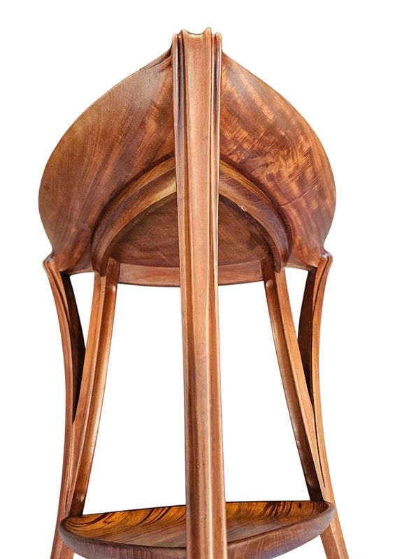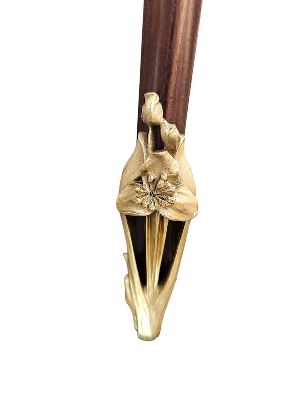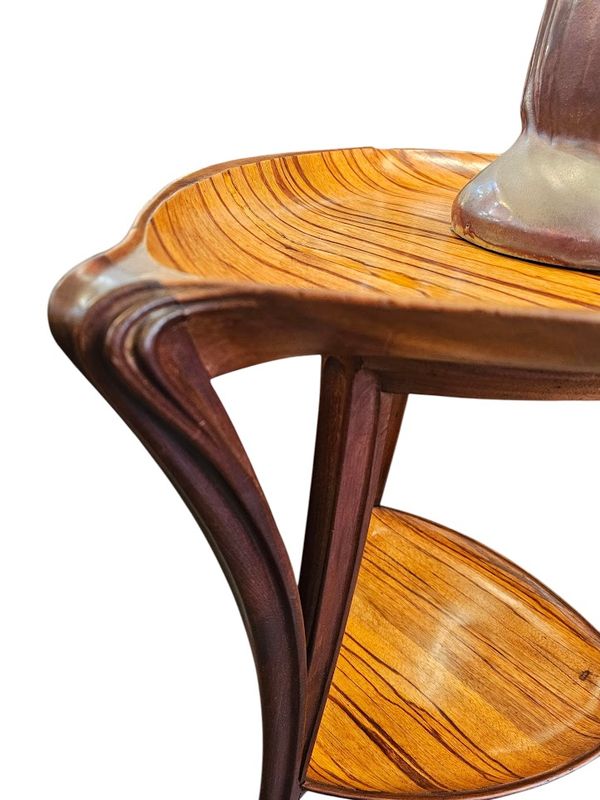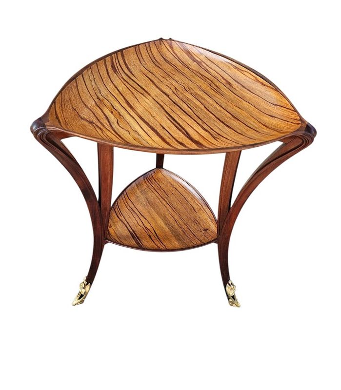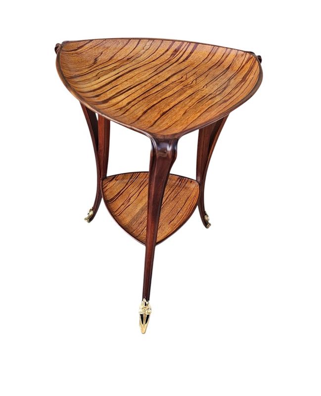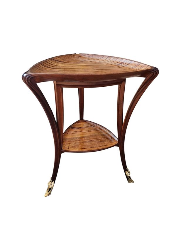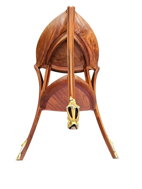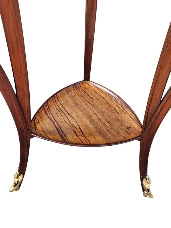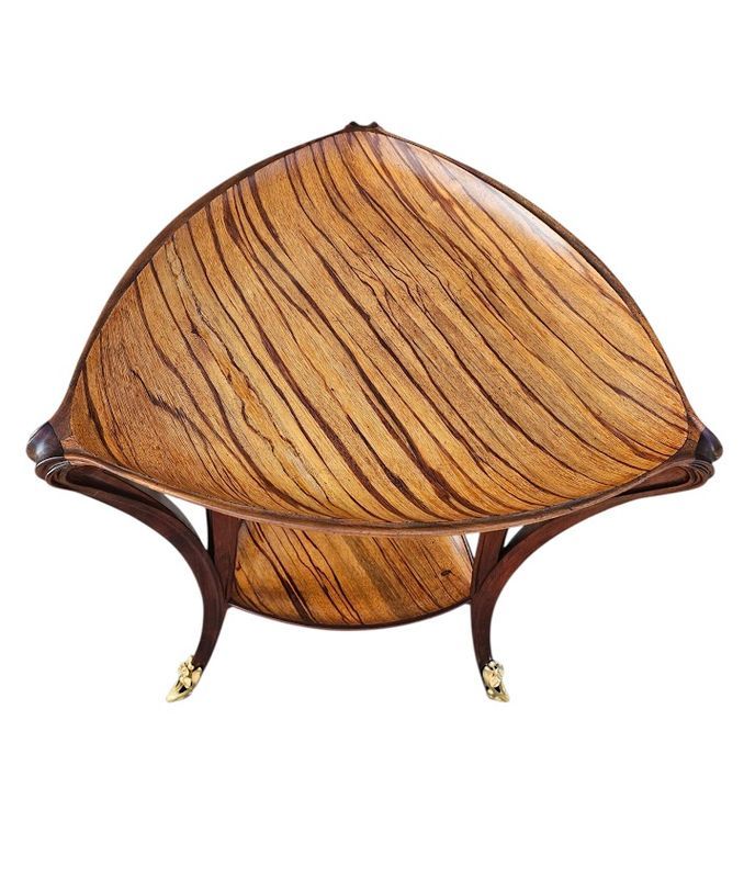 Superb double-topped tripod pedestal table in solid mahogany and snakewood veneer. It features two deeply curved tops, supported by curved, doubled and ribbed uprights, the base is covered with gilt bronze sabots decorated with arrowhead flowers. Remarkable quality of cabinetmaking, rare model!