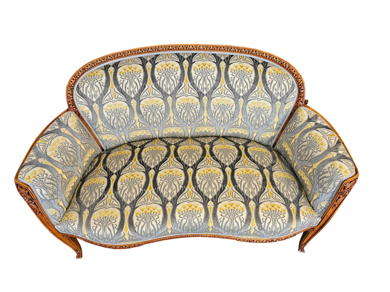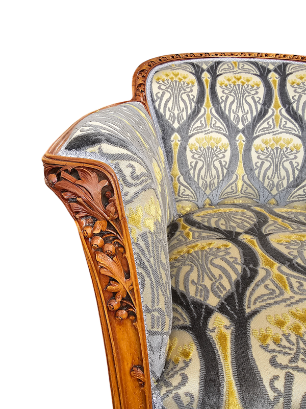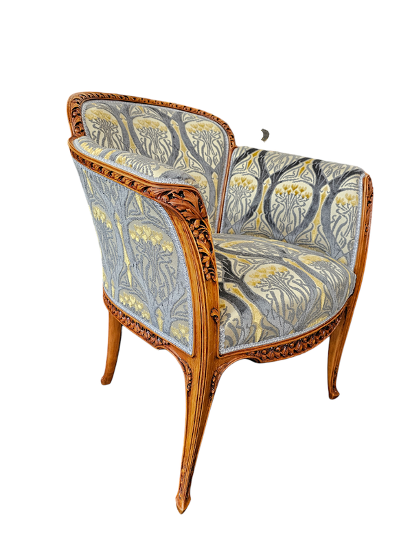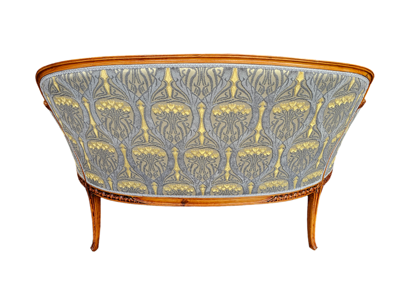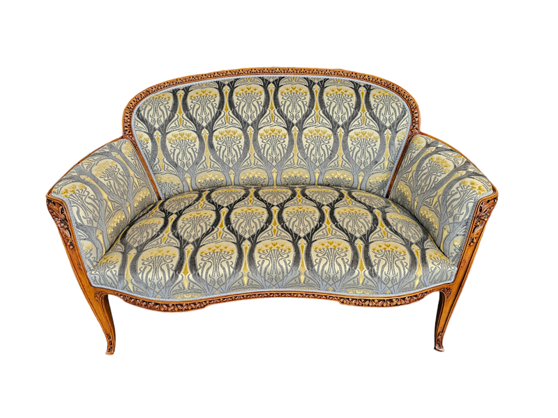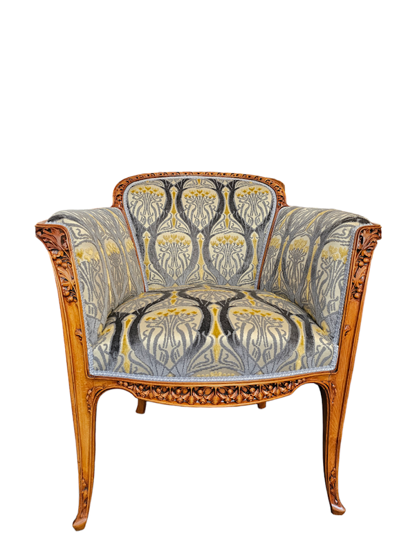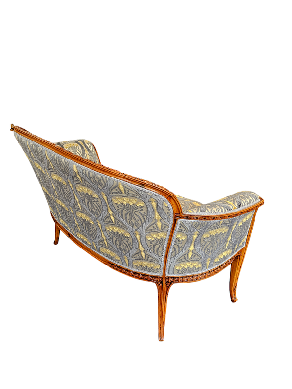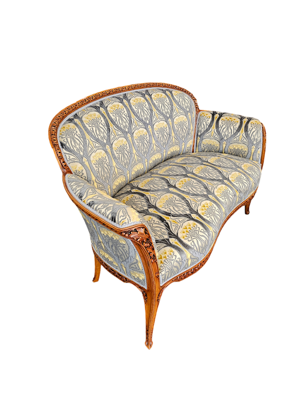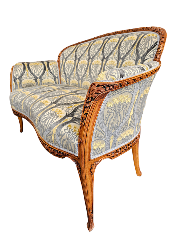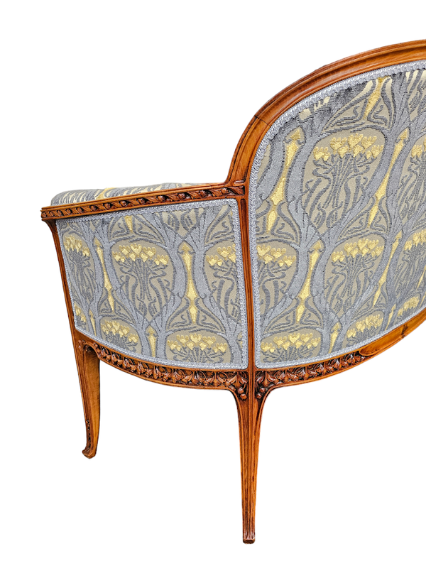 Superb set of molded beech lounge molded and finely carved with hawthorn decoration. It consists of a bench, two shepherdesses and two chairs. The bench and the shepherdesses are curved, all sides, basket handles and saber base. Very nice quality of cabinetmaking and magnificent patina! The whole has been fully restored in a traditional way by our professional upholsterer, the fabric is produced is distributed by: Maison L'Art Nouveau in Dordrecht in the Netherlands. Comfort is perfect!