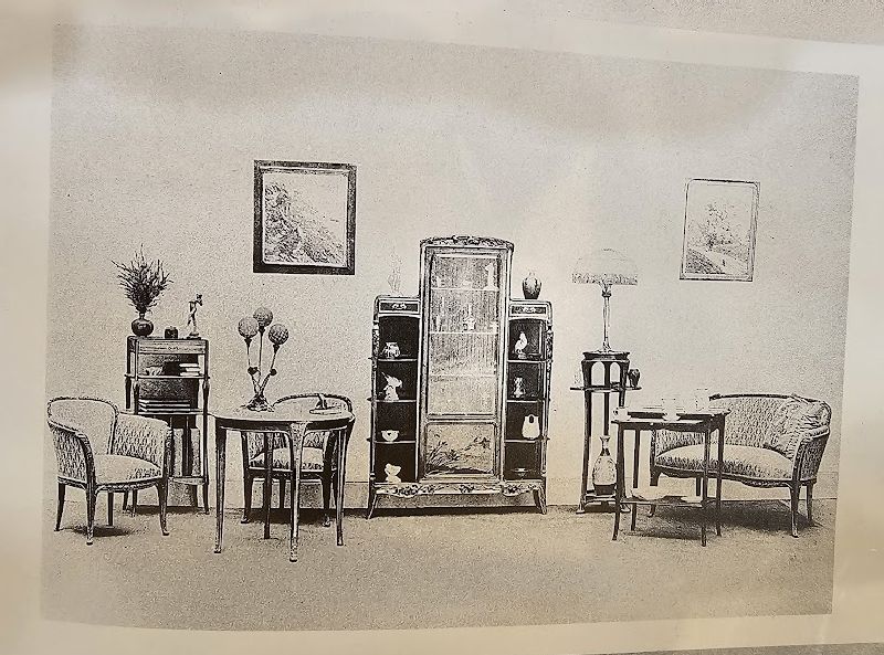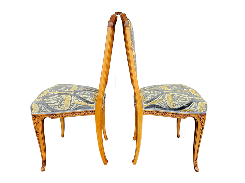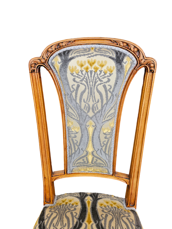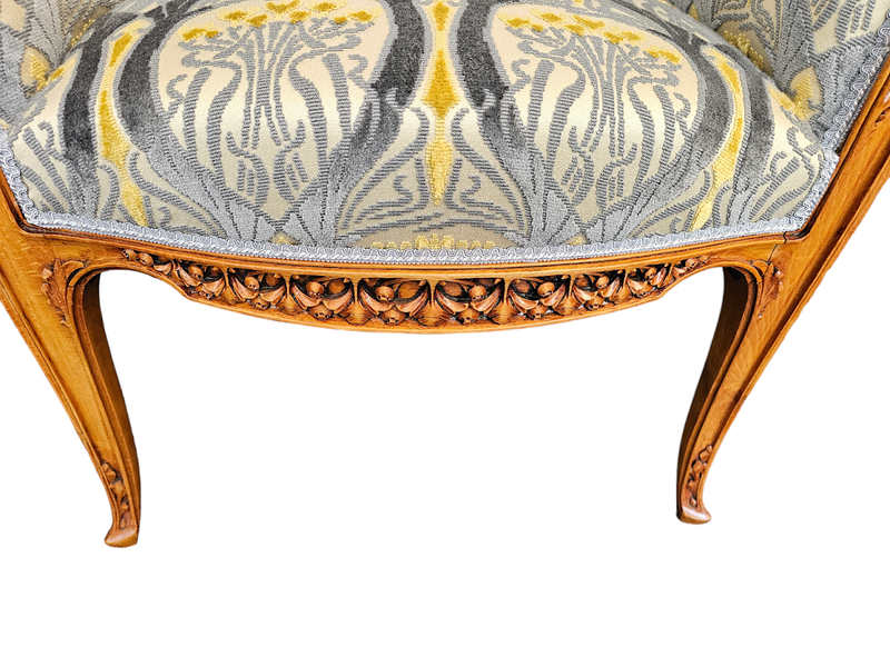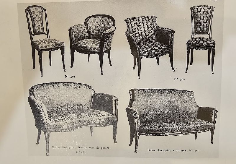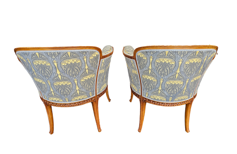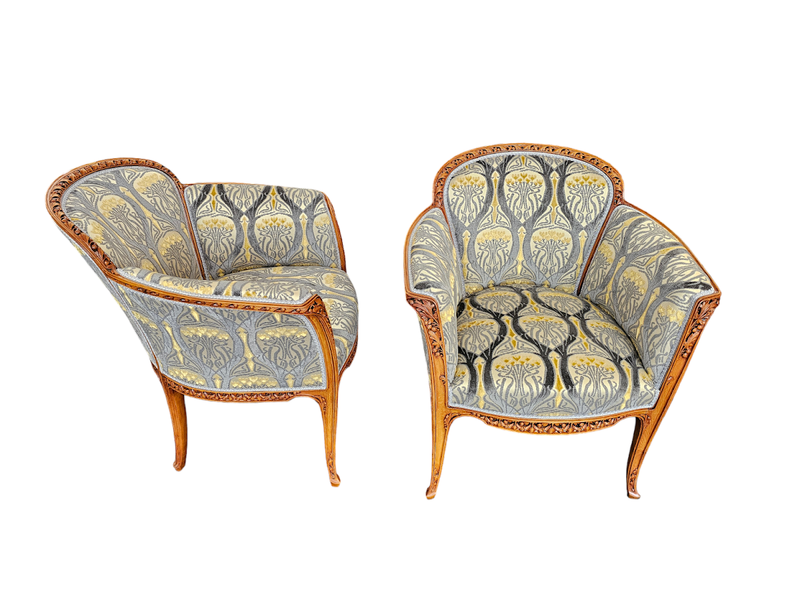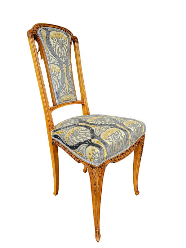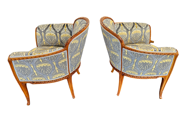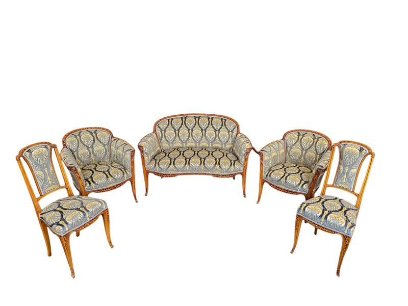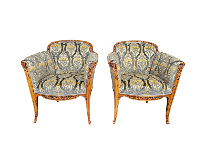 Superb set of molded beech lounge molded and finely carved with hawthorn decoration. It consists of a bench, two shepherdesses and two chairs. The bench and the shepherdesses are curved, all sides, basket handles and saber base. Very nice quality of cabinetmaking and magnificent patina! The whole has been fully restored in a traditional way by our professional upholsterer, the fabric is produced is distributed by: Maison L'Art Nouveau in Dordrecht in the Netherlands. Comfort is perfect!