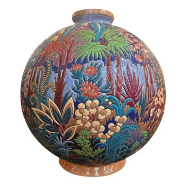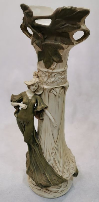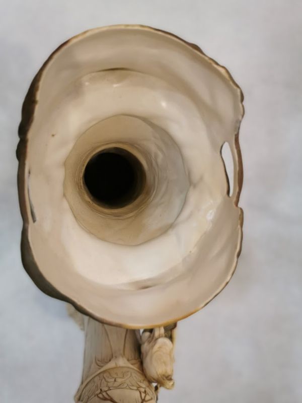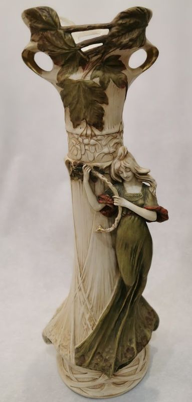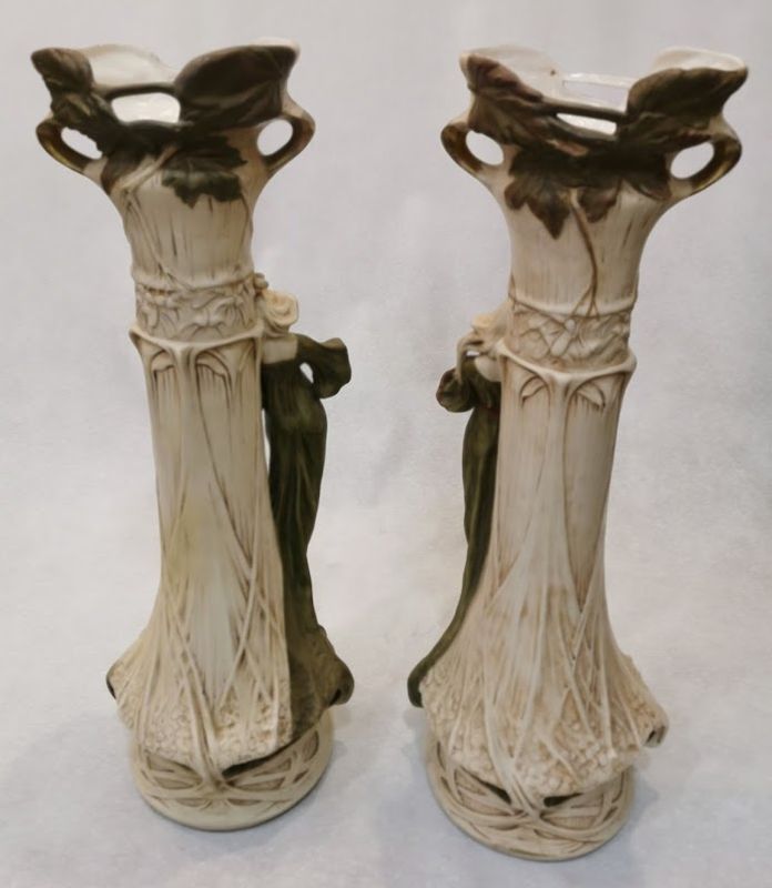Important pair of polychrome porcelain vases enhanced with gold decorated with two nymphs, foliage and naturalistic interlacing. Restoration of a crack and a branch at the level of a perfectly invisible collar. Pink triangle marking applied, mold number 1095