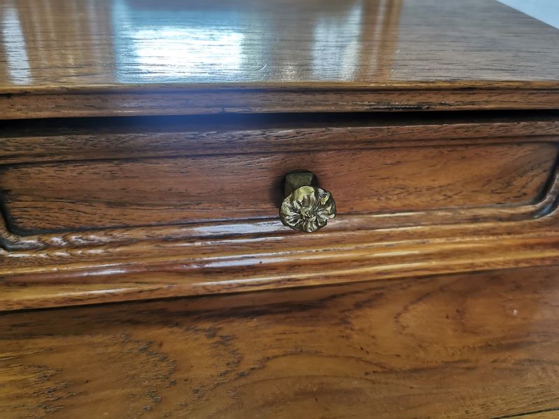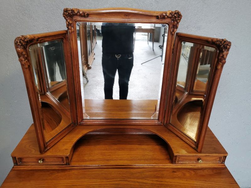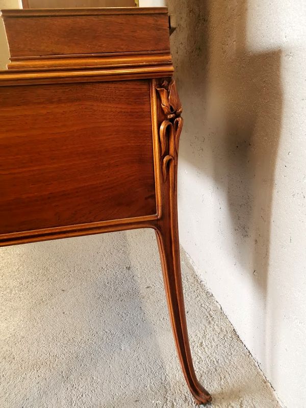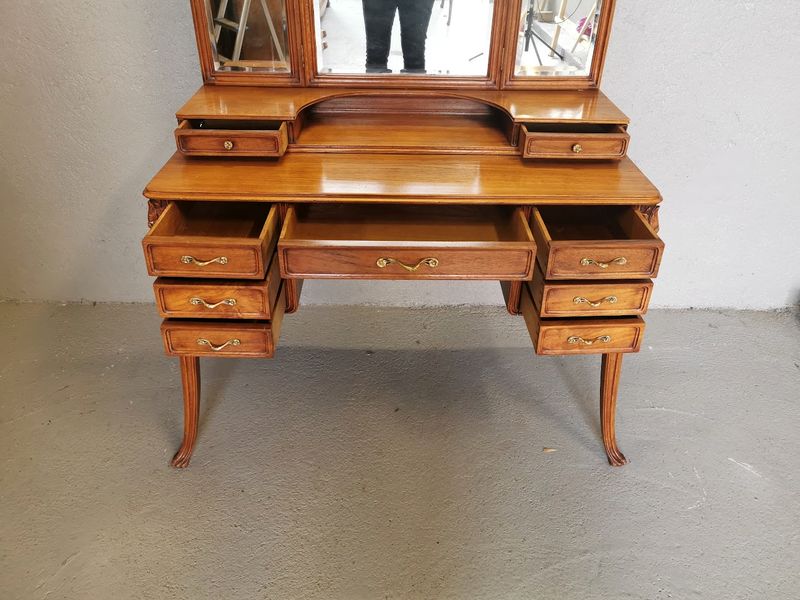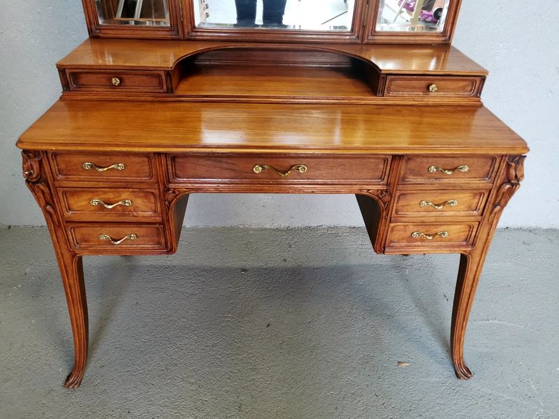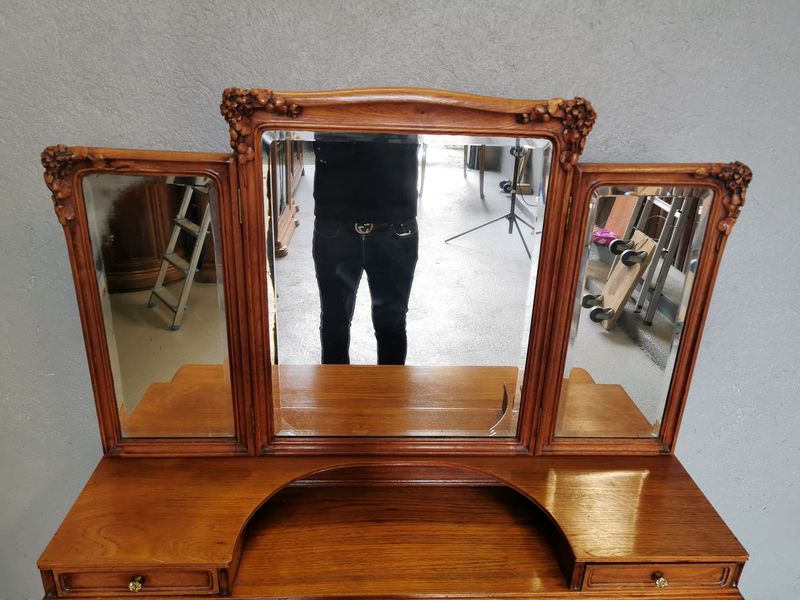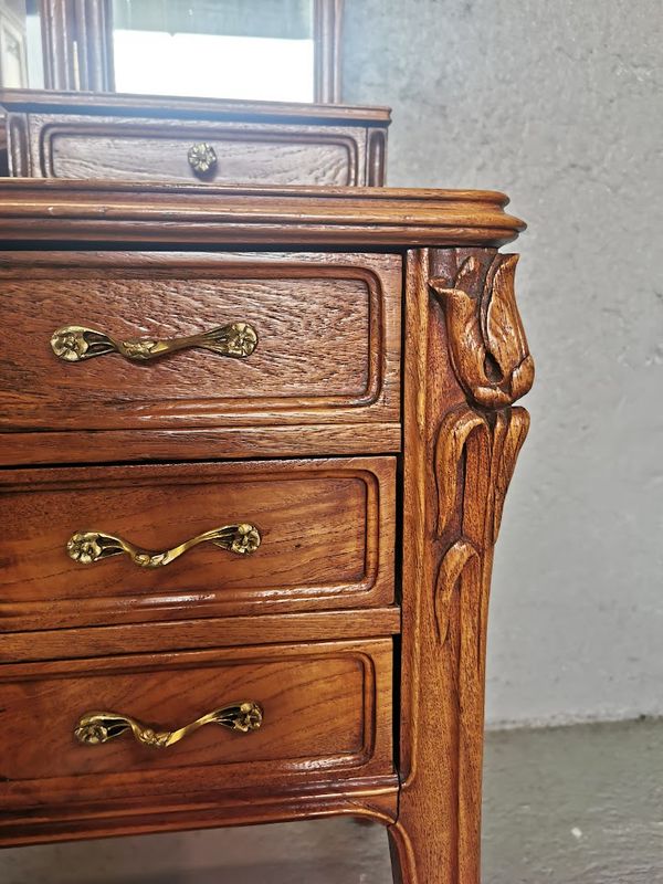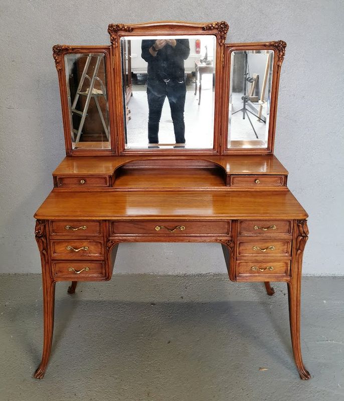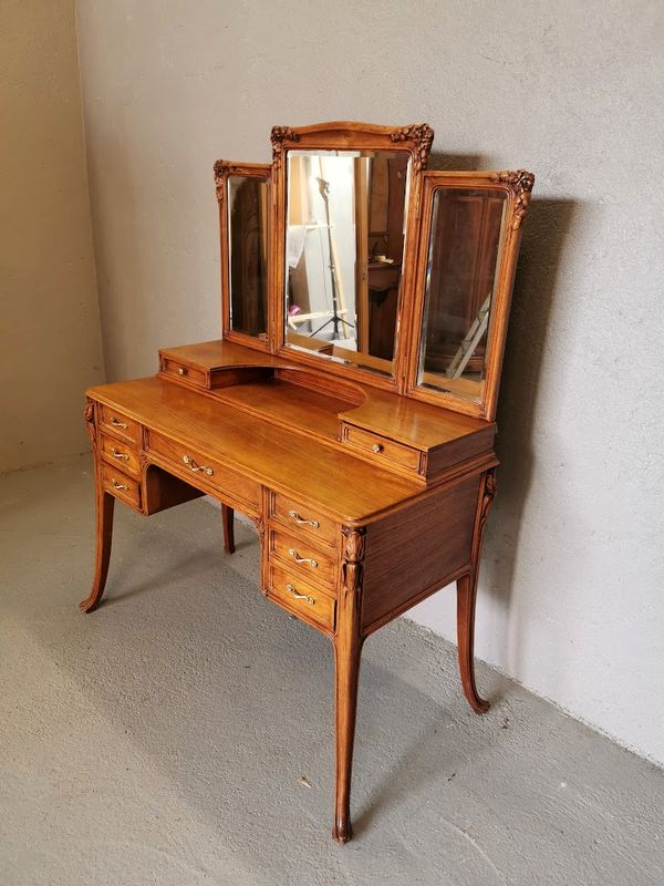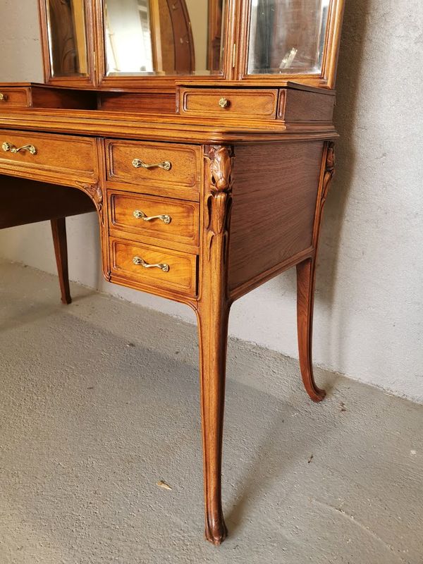 Beautiful dressing table in molded and finely carved blond oak decorated with tulips and hydrangeas. It opens with two rows of three drawers and a central drawer in the lower part, two drawers on each side on the tier supporting the mirror. Saber base, gilded bronze handles and buttons, beveled triptych mirror. Superb quality of cabinetmaking!