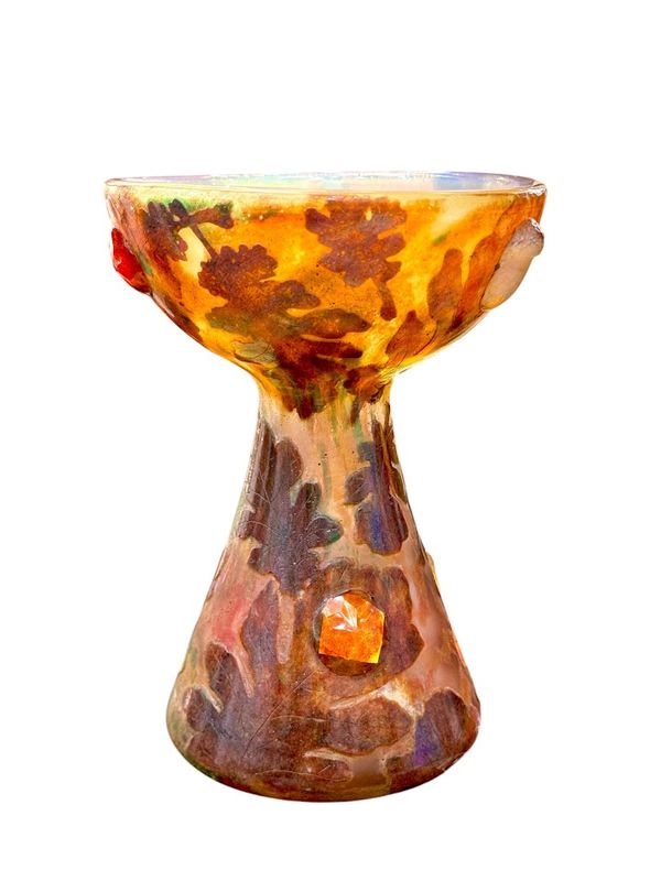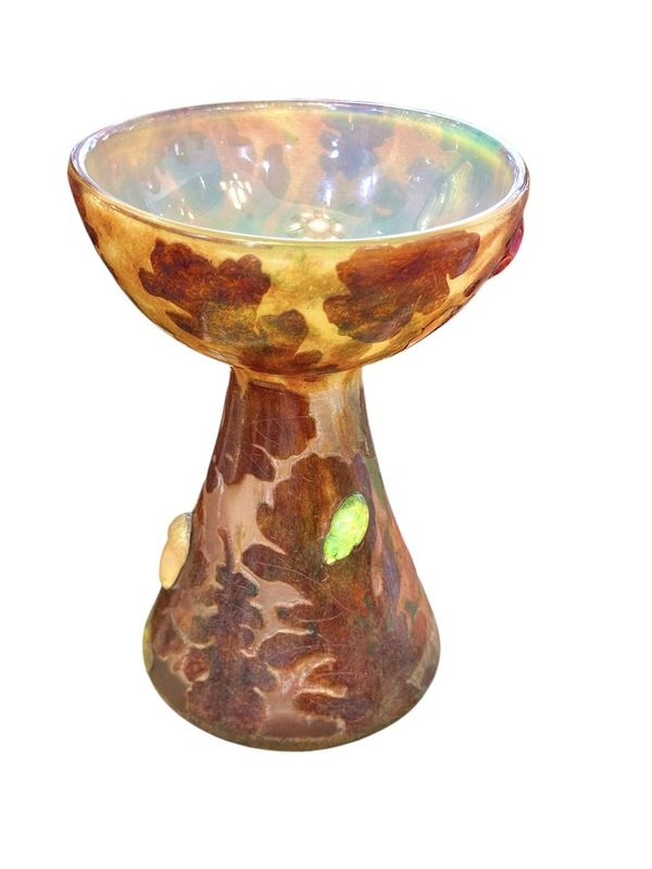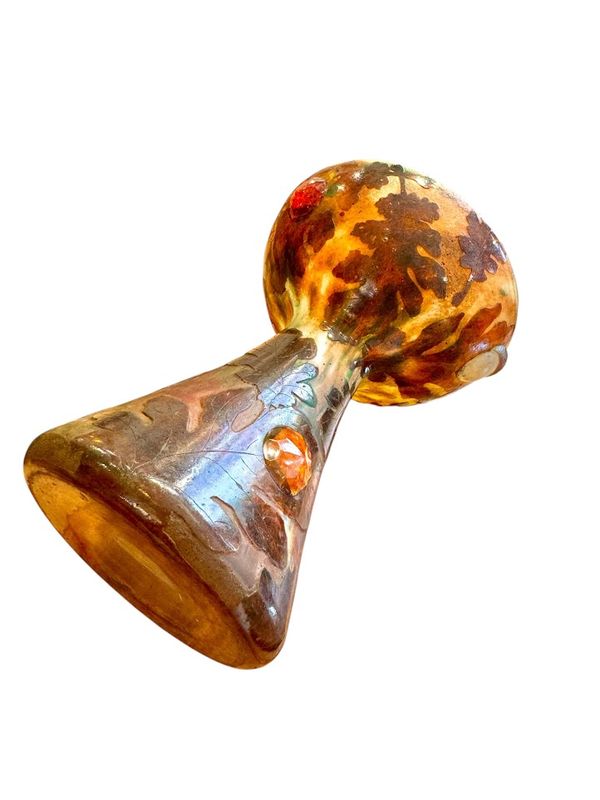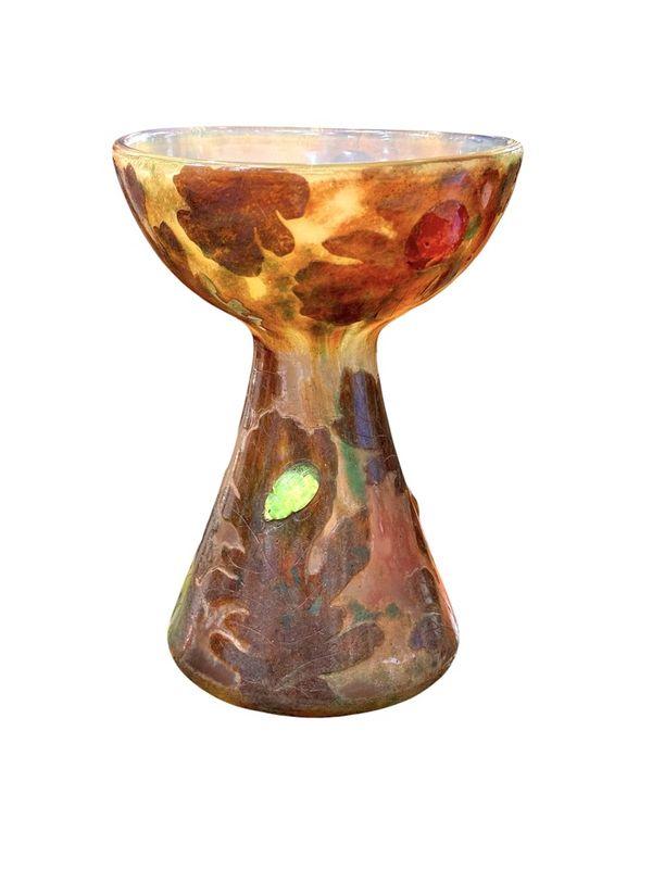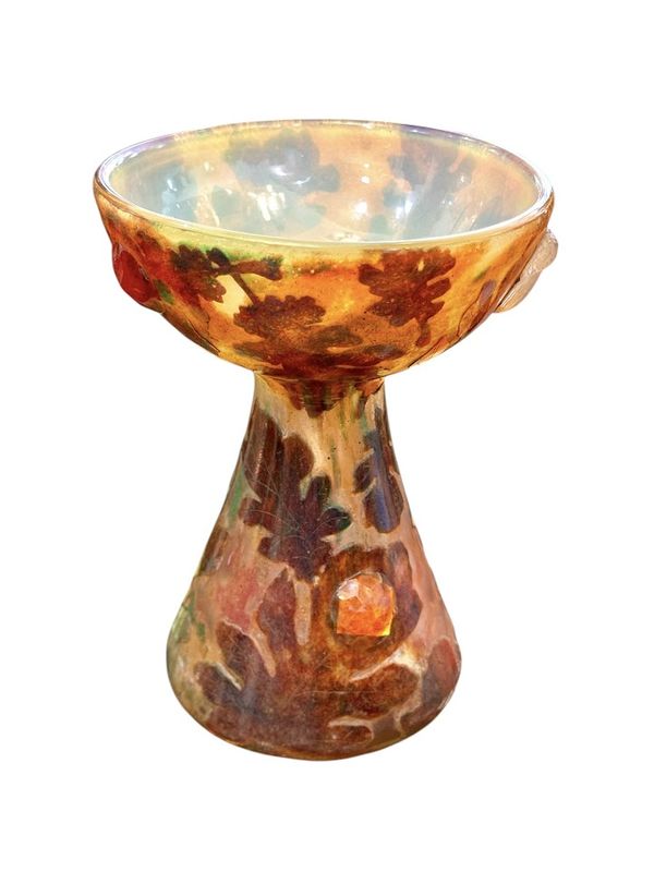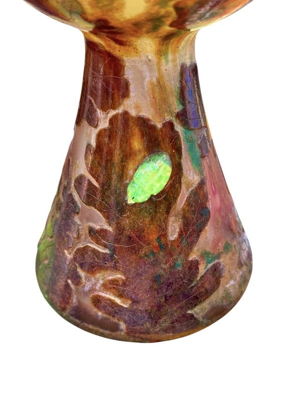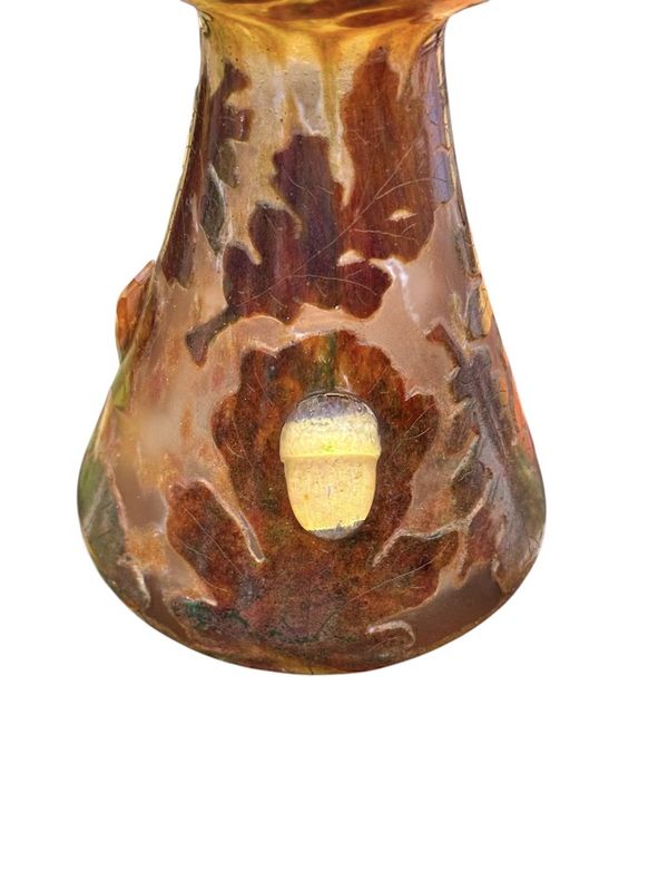 Very rare vase in colorless glass, opal and brown lined. Fall decor engraved in acid camée in vitrifications of pink, yellow and partially polished green powders, enhanced by applications of multicolored cabochons treated with gold (acorns, haneton), on a slightly granite background. Magnificent luminous rendering! Ref: DAUM MASTERS VERRIES by Noel DAUM Editions Denoël