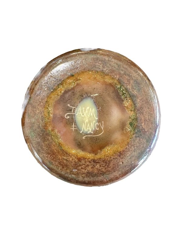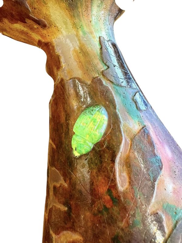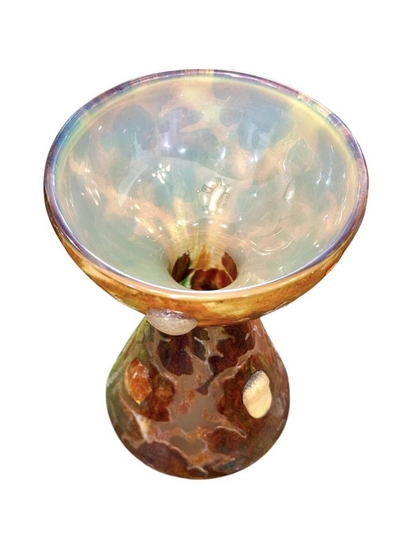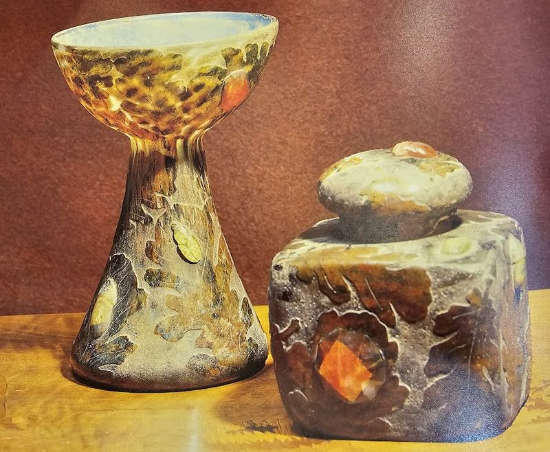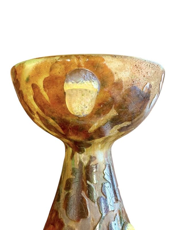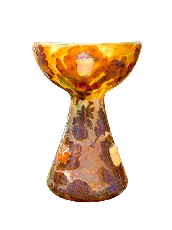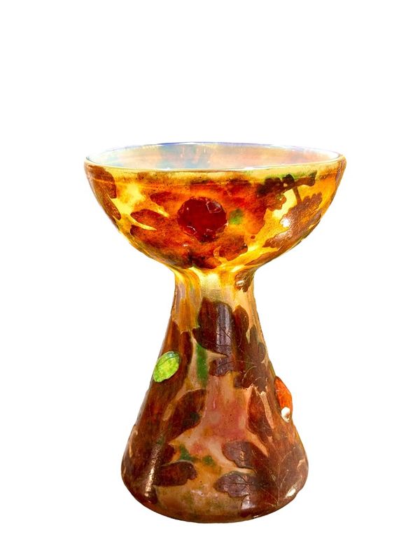 Very rare vase in colorless glass, opal and brown lined. Fall decor engraved in acid camée in vitrifications of pink, yellow and partially polished green powders, enhanced by applications of multicolored cabochons treated with gold (acorns, haneton), on a slightly granite background. Magnificent luminous rendering! Ref: DAUM MASTERS VERRIES by Noel DAUM Editions Denoël