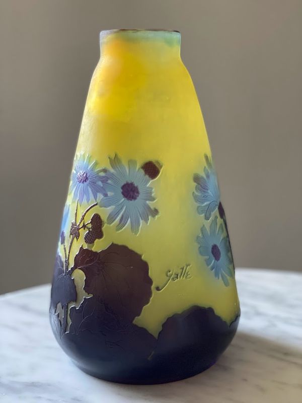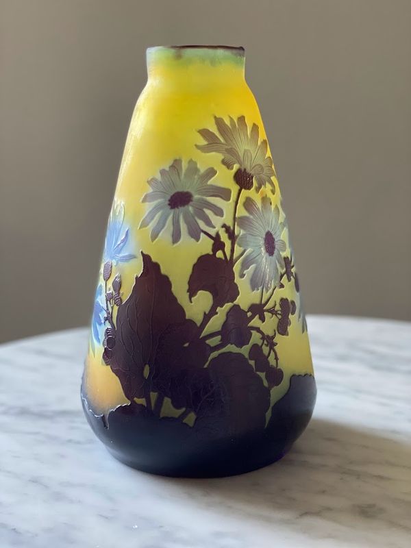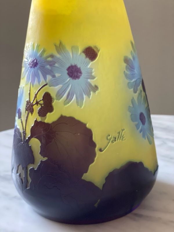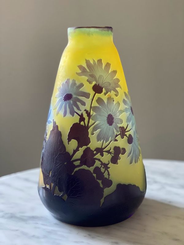 Gallé “Aux Marguerites” Vase nathalie rousselot2021-10-20T17:04:29+02:00 Item Description 2 October 14, 2021 Glassware [vc_column_te Emile Gallé Marguerites Vase [/vc_column_text] Vase Art Nouveau STYLE ARTIST Gallé YEAR 1894-1904 DIMENSIONS H: 25 cm D 15 cm PRICE 3400 Euros More information Pretty double glass vase, finely engraved with blue daisies, on an intense yellow satin background. Beautiful luminous rendering! My Messages SKILLS: Art NouveauGlassware Emile Gallé Art Nouveau vase decorated with daisies nathalie rousselot Site creator Share Facebook Twitter LinkedIn Google + Email