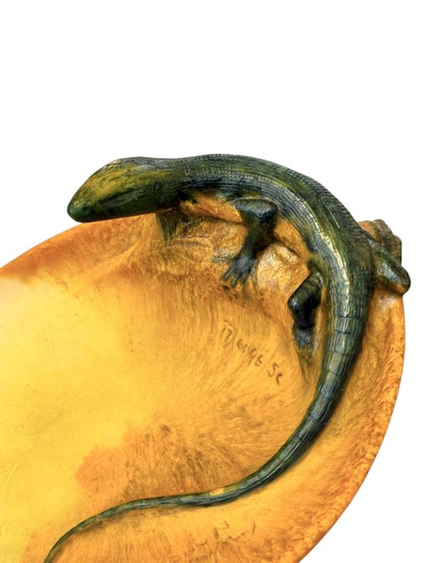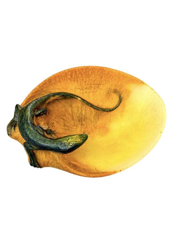Amalric Walter Vide Poche “Au Lézard” nathalie rousselot2025-11-21T18:53:36+01:00 Item Description 4 November 21, 2025 Glassware Pocket tray STYLE: Art Nouveau ARTIST: Amalric Walter and Henri Bergé YEAR: 1920-1930 DIMENSIONS h: 9.5 cm L: 21 cm D: 15.5 cm PRICE : 8800 Euros More information Important polychrome lost-wax glass paste bowl, depicting a green lizard in the round on an ovoid bowl treated with orange and yellow powders. Double signature in incision: A Walter Nancy and H Bergé Sculpteur. Superb luminous effect! My Messages SKILLS: Art Nouveau Amalric Walter Cup at the Lizard Nathalie Rousselot Share Facebook Twitter LinkedIn Google + Email