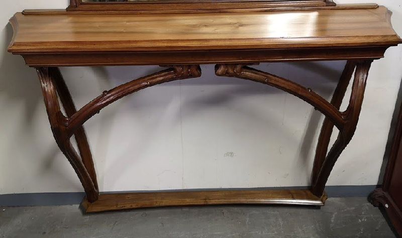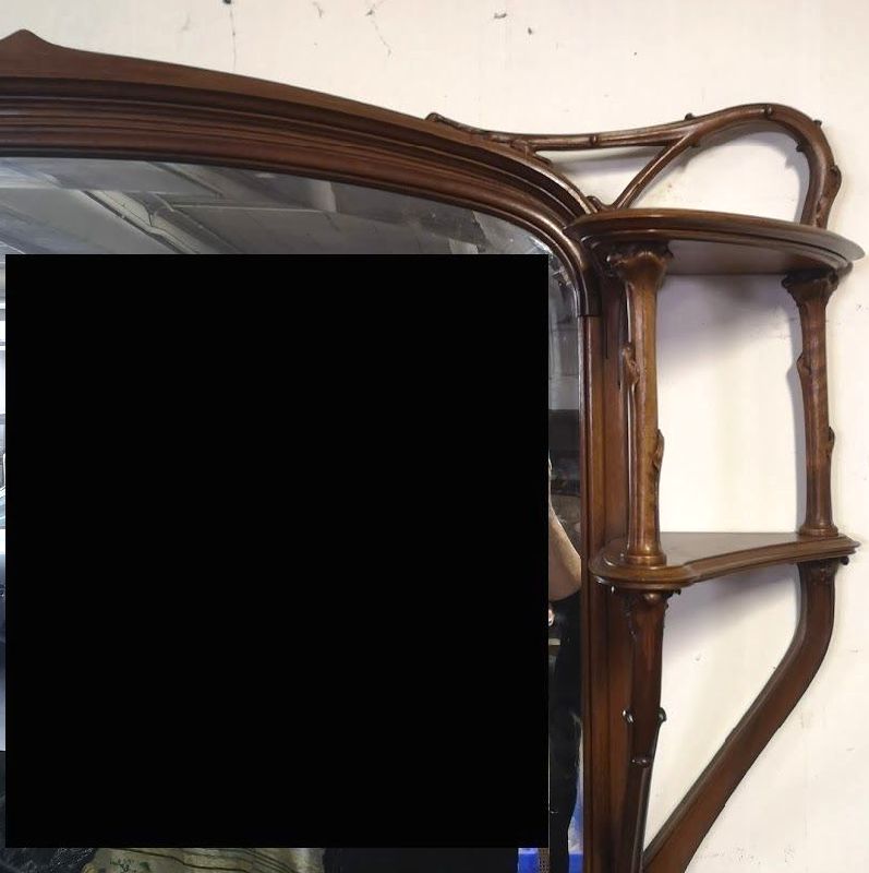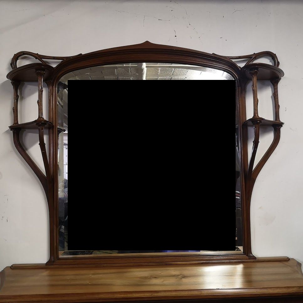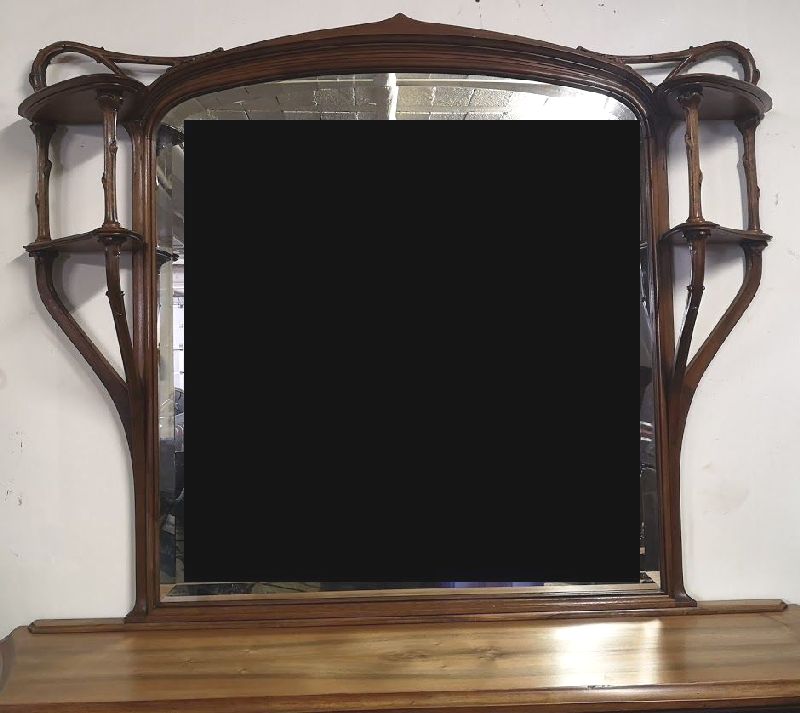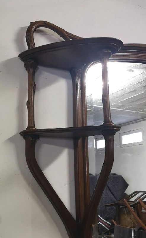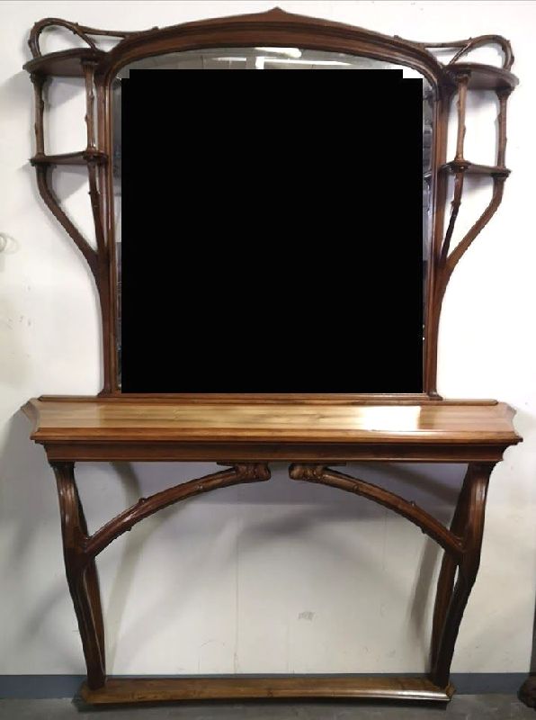 La mensola poggia su montanti curvi spartiti in arcate sul fronte, lo specchio è affiancato da due ripiani a sbalzo sorretti da montanti nervati e scolpiti.