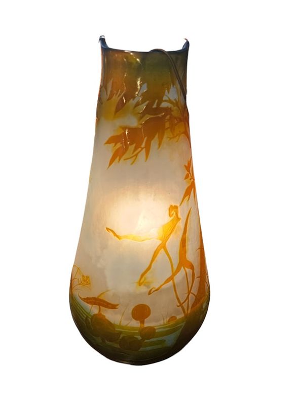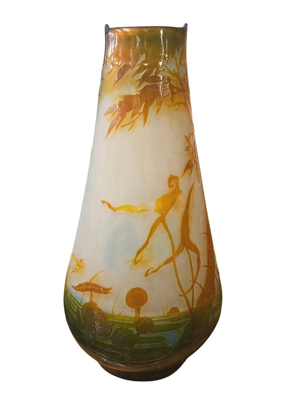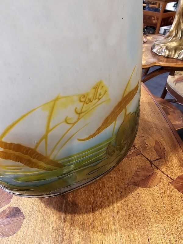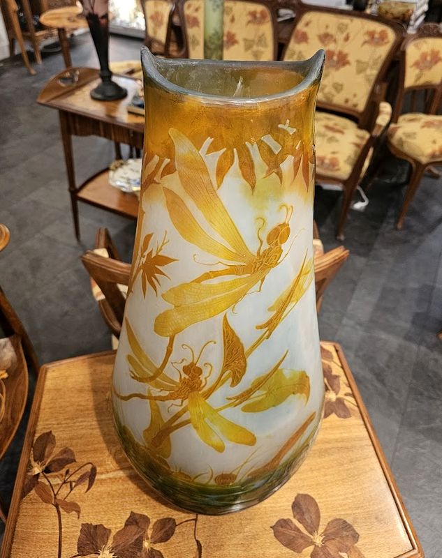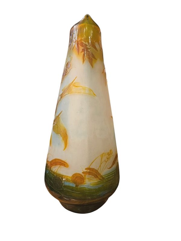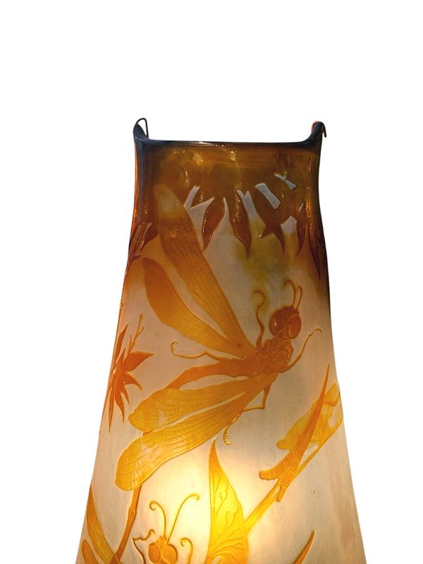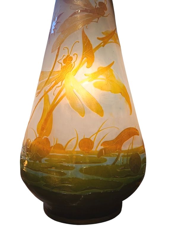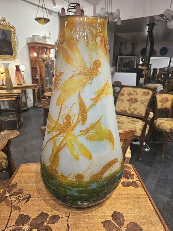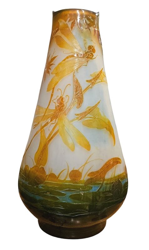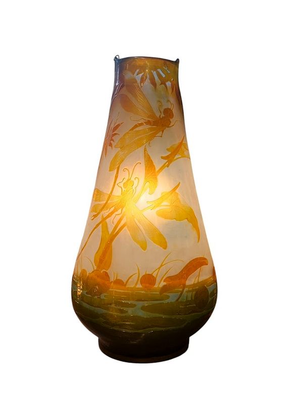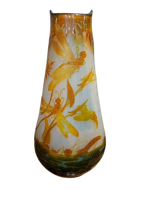 Vasi ovoidale eccezionale su Talon con colletto a navetta a tripla navetta. Magnifico arredamento inciso in belle riserve per acido, due grandi libellule che volano su una palude fiorite di gigli d'acqua e sagittari. Notevole qualità di incisione, notare la precisione dei colori di sfondo con la parte acquatica perfettamente delimitata con il blu. Qualità del museo!