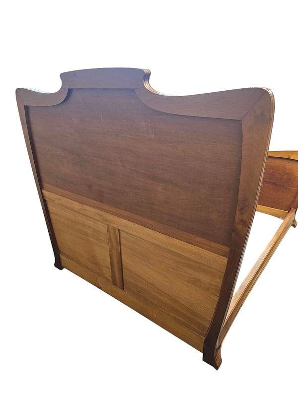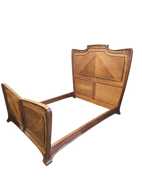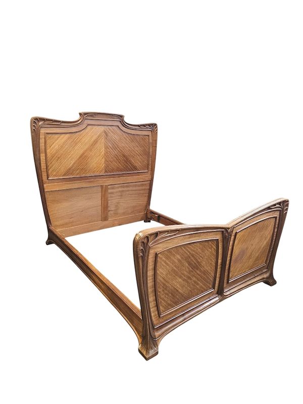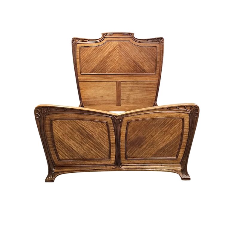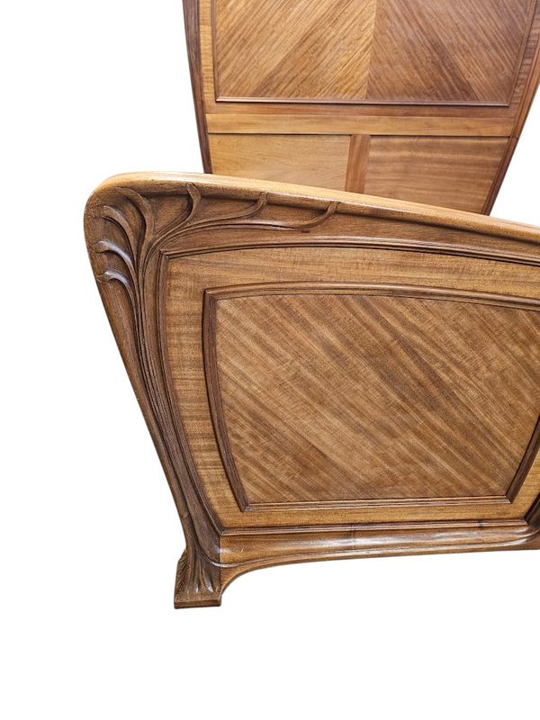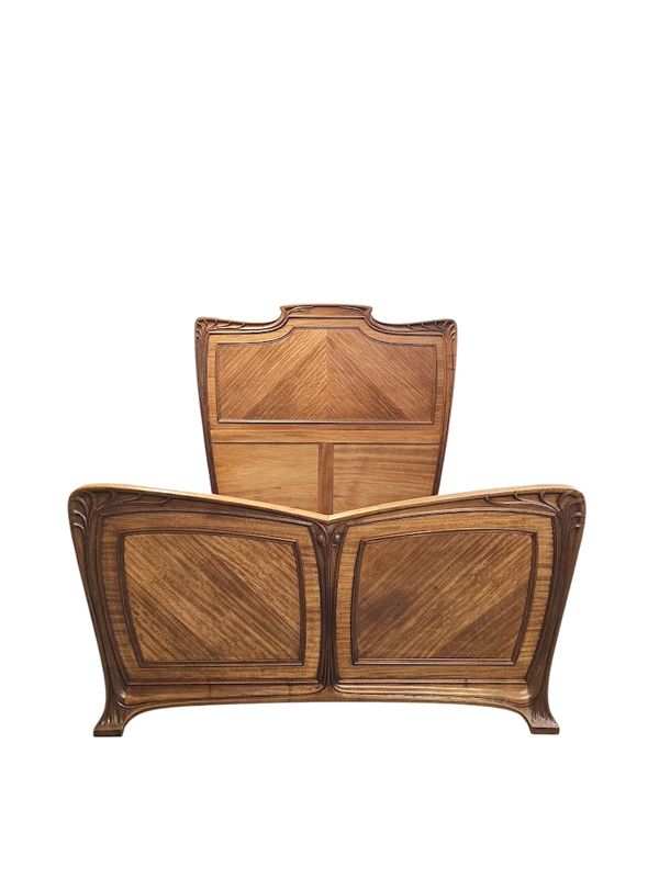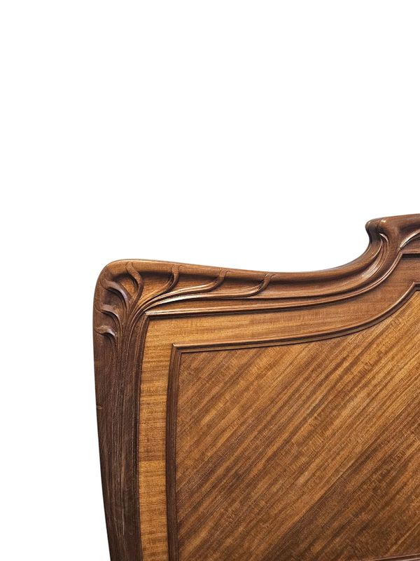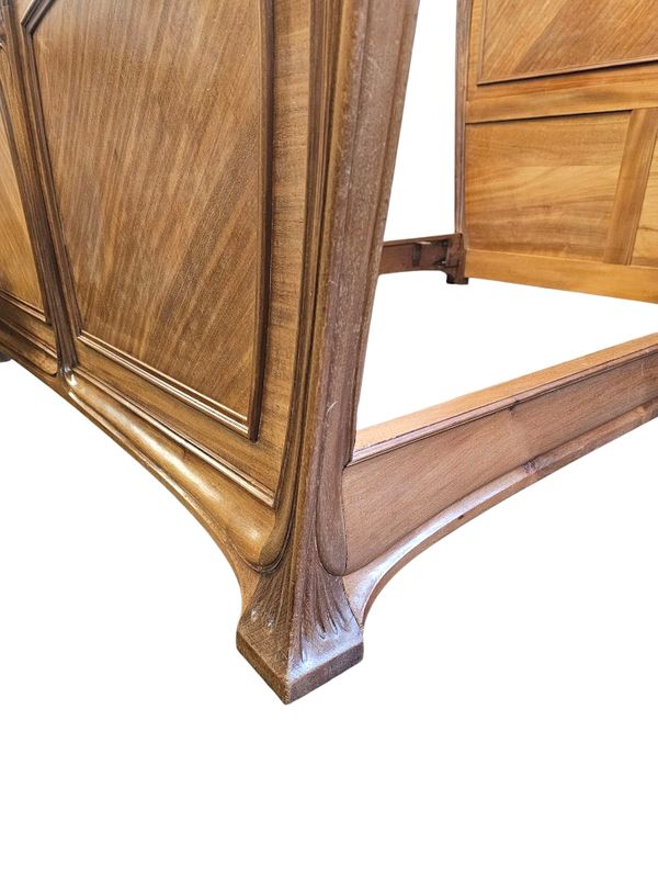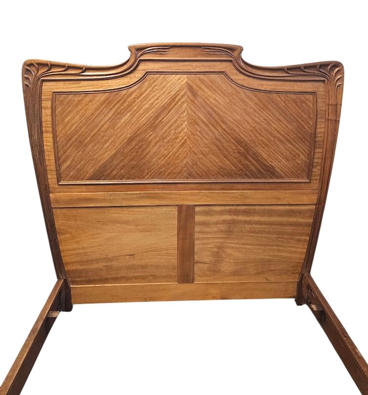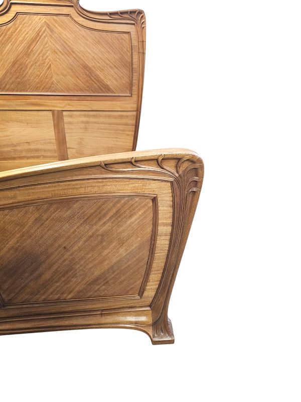 Ampio letto in noce massello e impiallacciatura in mogano satinato, modanato e intagliato. Il piede presenta un intaglio a forma di ala di farfalla, la testiera presenta una traversa con intagli a volute. Ebanisteria di altissima qualità! Rif.: Louis Majorelle di Alastair Duncan