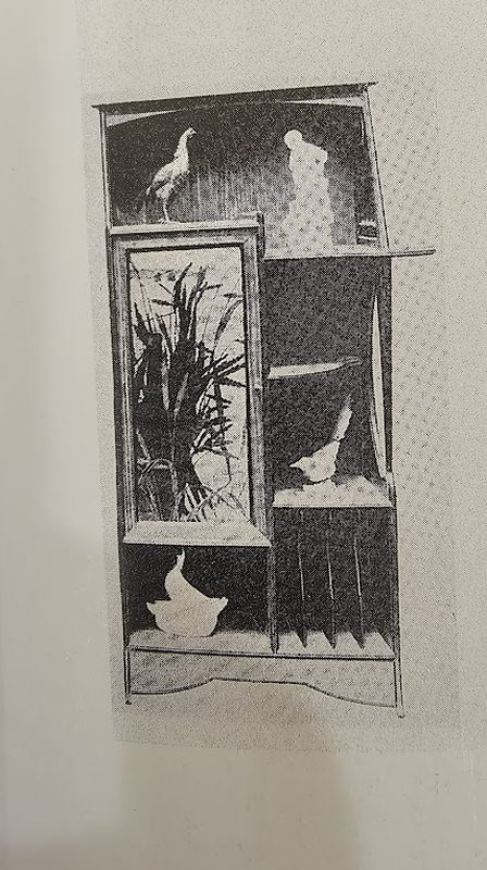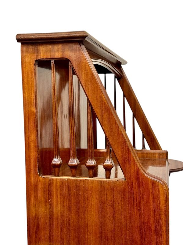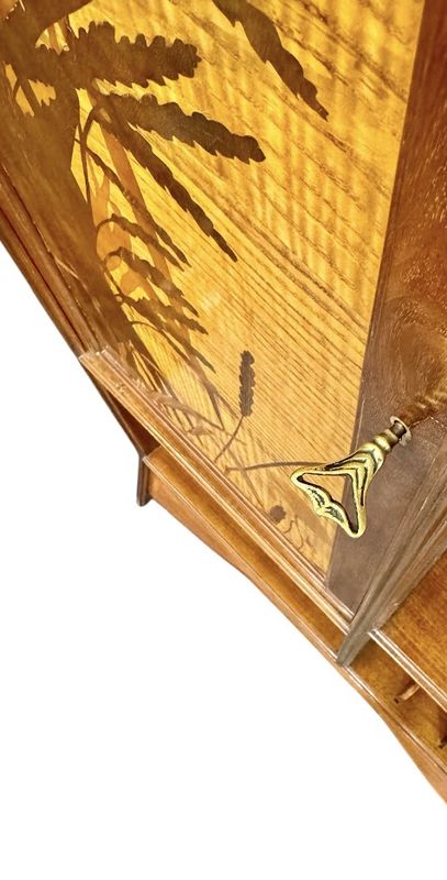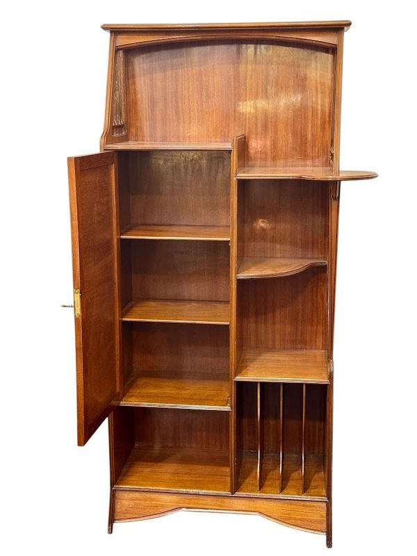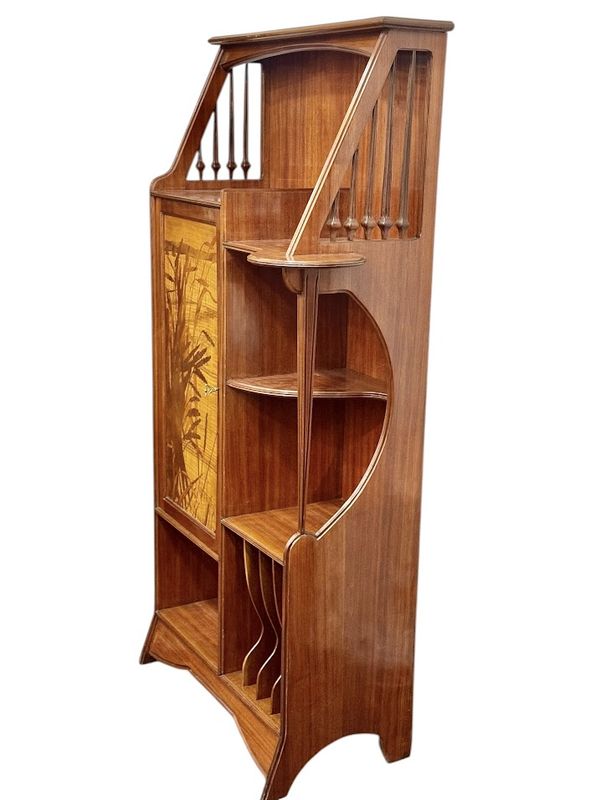 Un elegante mobile asimmetrico in mogano e impiallacciatura in mogano satinato. Si apre con un'anta intarsiata raffigurante spighe di grano e un papavero su uno sfondo di frassino rustico, rivelando quattro nicchie e un vano porta-spartiti suddiviso in scomparti. Il ripiano superiore a destra è arrotondato e sporgente, sostenuto da un montante intagliato a spirale. I lati sono traforati e dotati di colonne intagliate, mentre la sezione inferiore presenta una traversa inclinata con bordi smerlati. Chiave originale in bronzo dorato, finitura lucida francese. Rif.: Louis Majorelle di Alastair Duncan