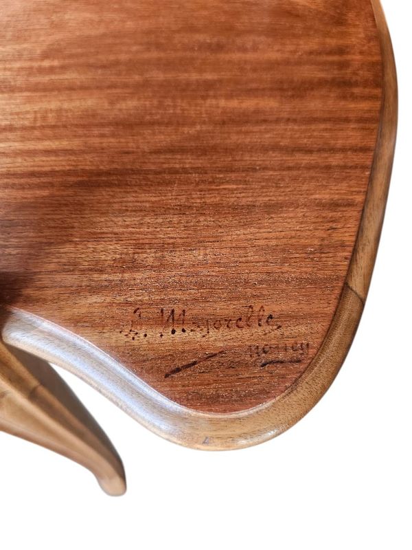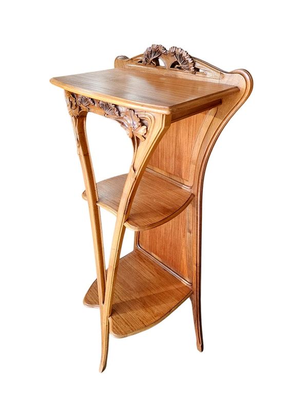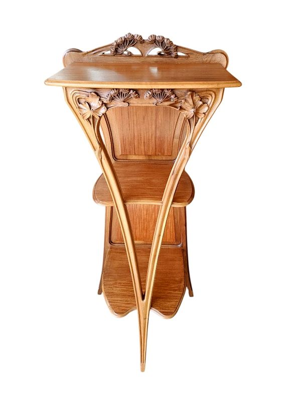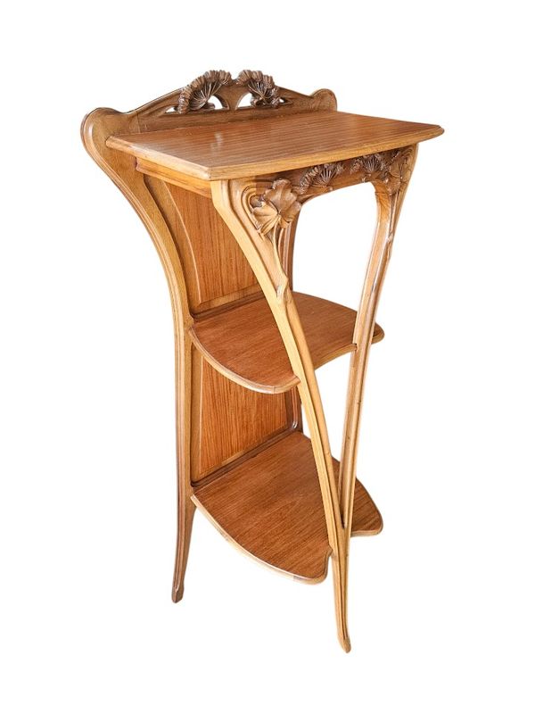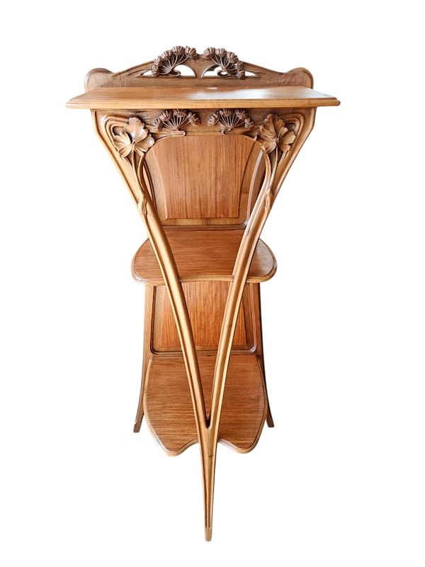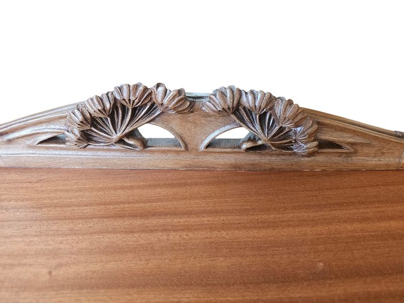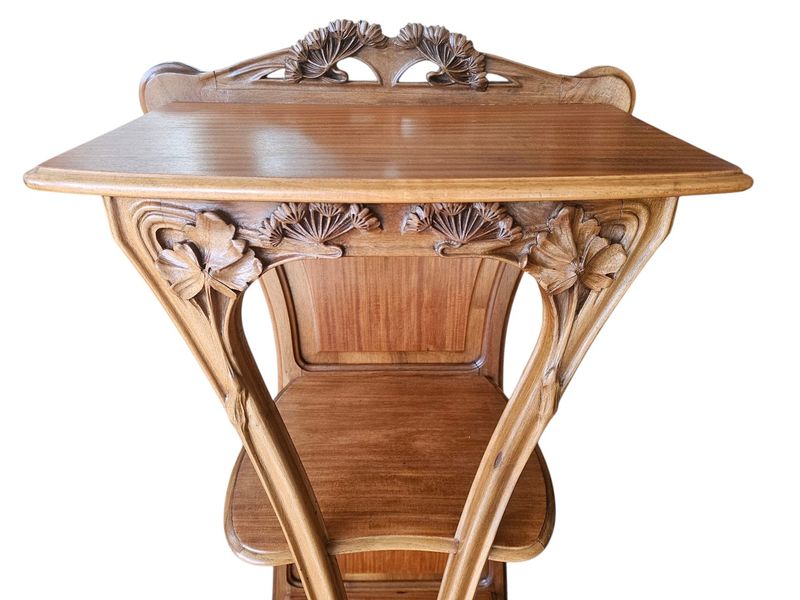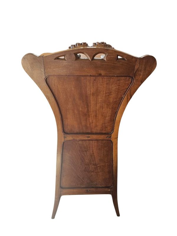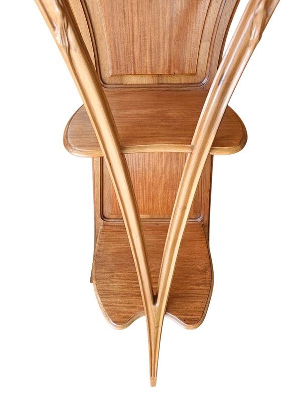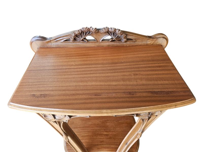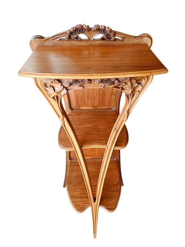 Raro tavolino da parete in noce massello e impiallacciatura in mogano satinato, modanato e finemente intagliato con decorazione a ombrello. Montante anteriore curvo e doppio, traversa superiore traforata, piani asimmetrici, stampati a caldo. Patina superba!