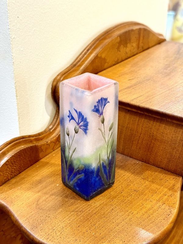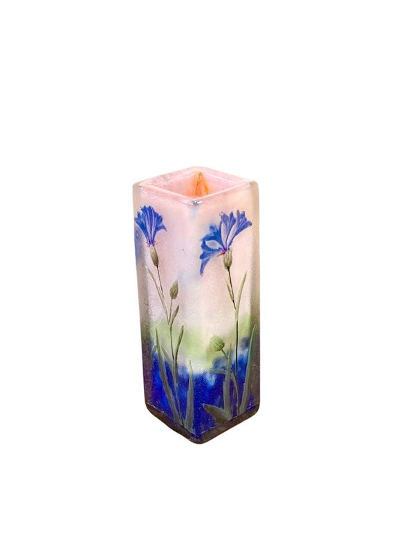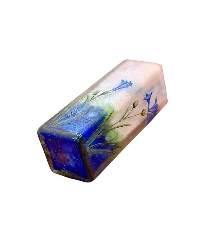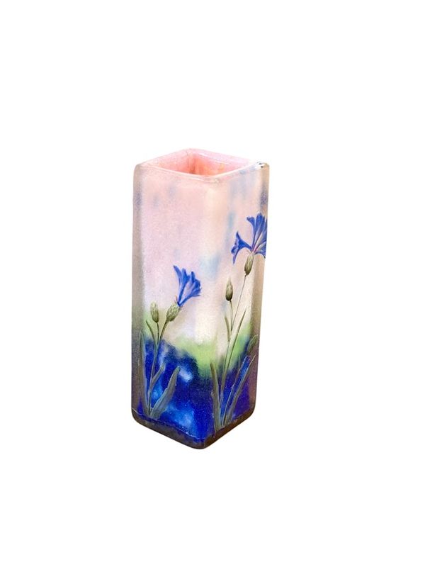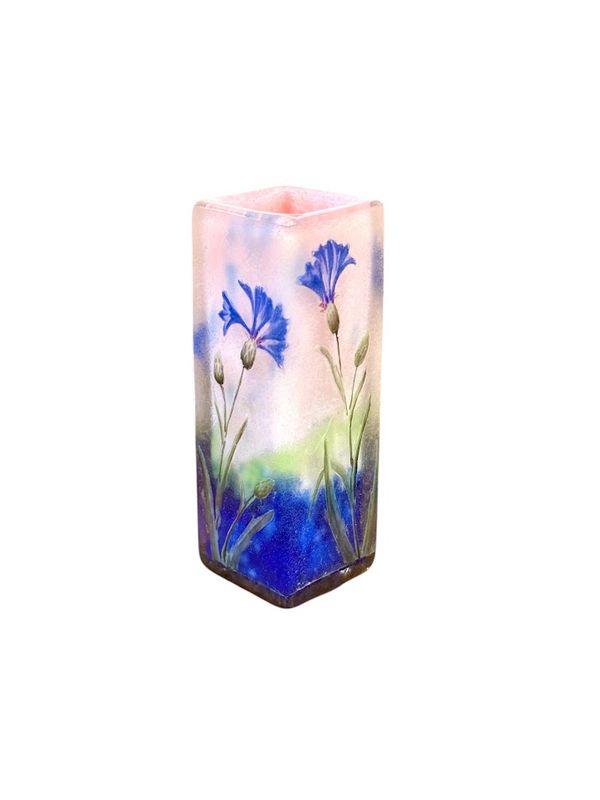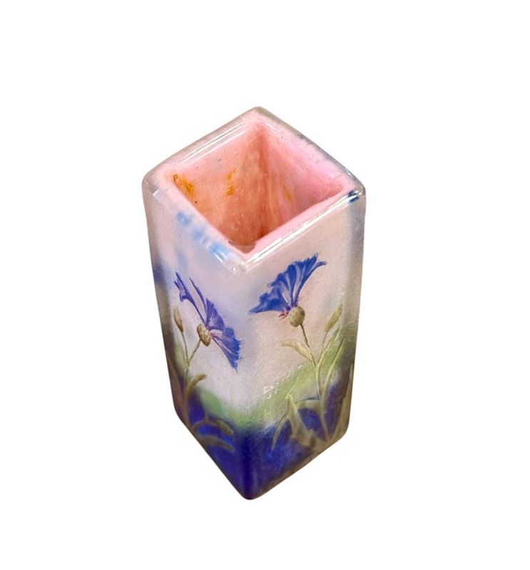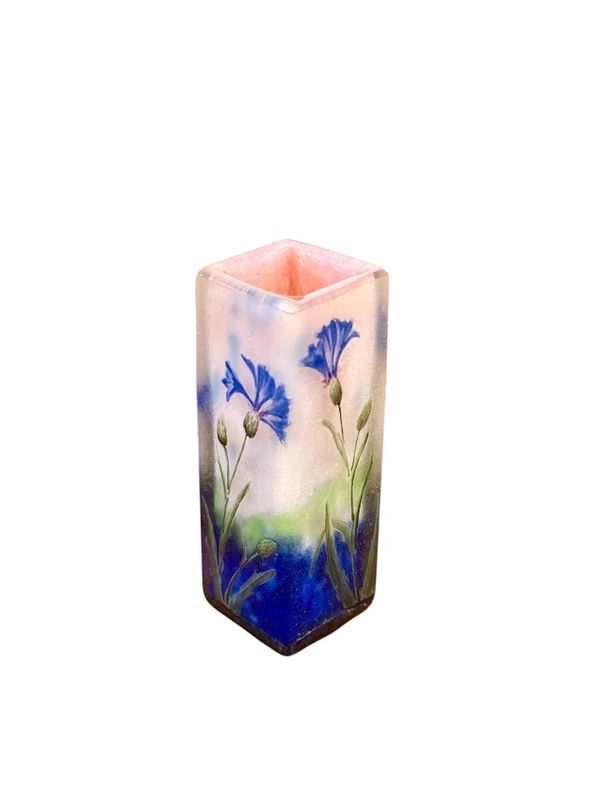 Bellissimo vaso quadrangolare in vetro doppio con inclusioni di polveri color malva, rosa e verde. Decorazione finemente incisa e smaltata di fogliame e fiori di fiordaliso su fondo satinato. Firma Daum Nancy con la croce di Lorena. Splendida qualità di produzione!