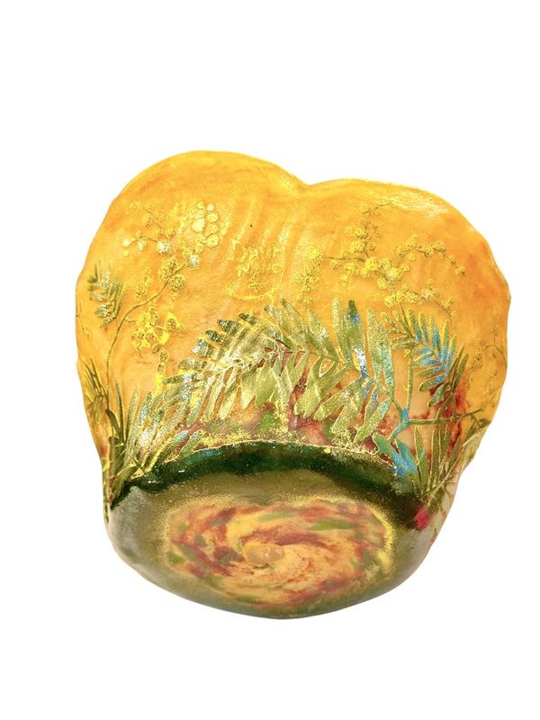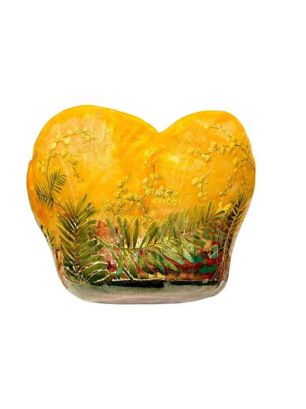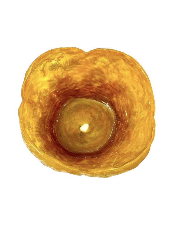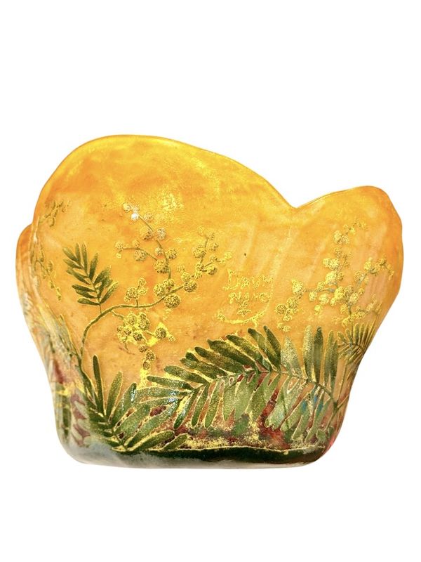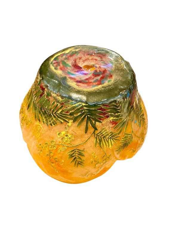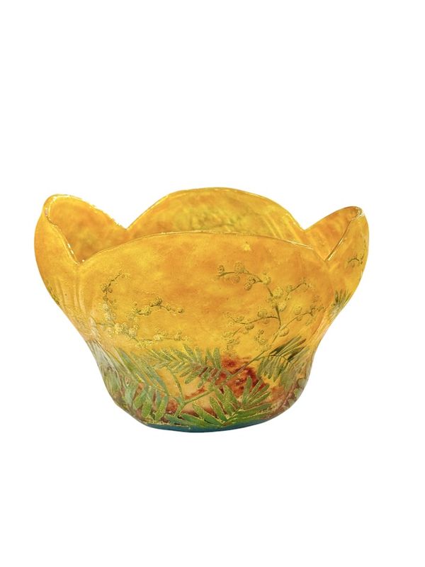 Superba ciotola in vetro soffiato a doppia soffiatura a stampo a forma floreale. La decorazione è incisa all'acido in sottili riserve e smaltata policroma con rami di mimosa fioriti, su uno sfondo marmorizzato trattato con polveri arancioni, verdi e viola. Forma rara e smaltatura di altissima qualità.