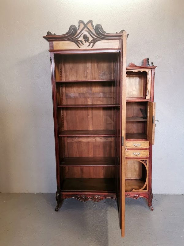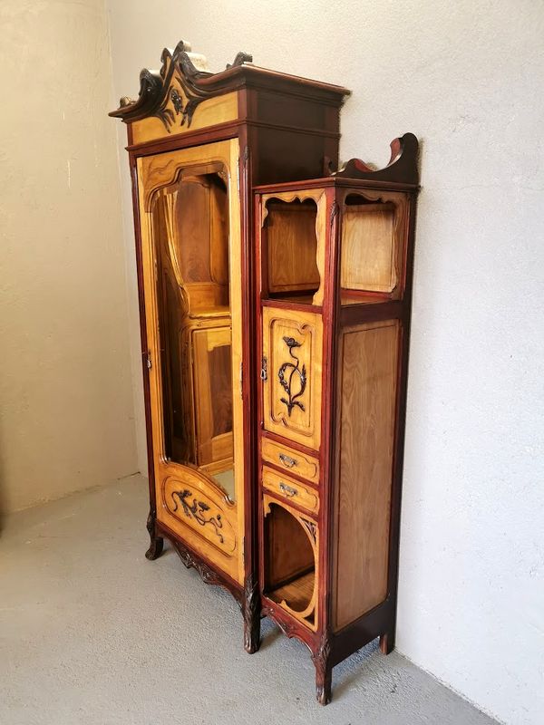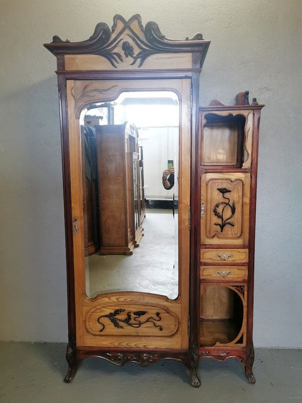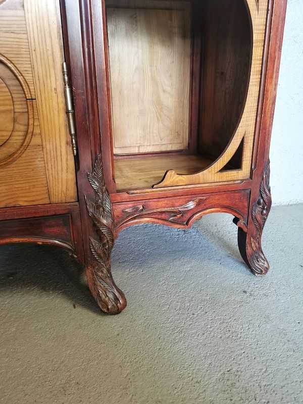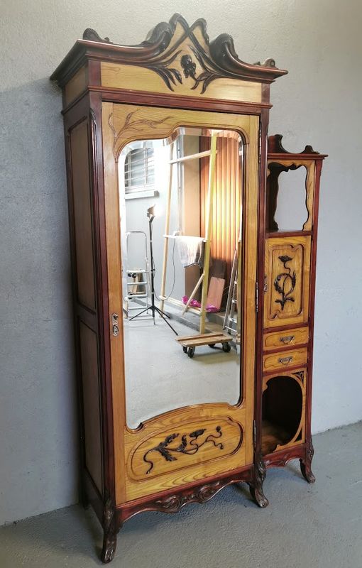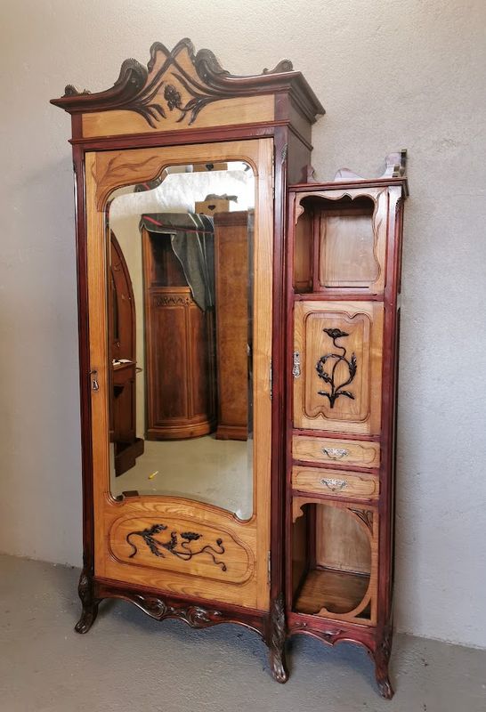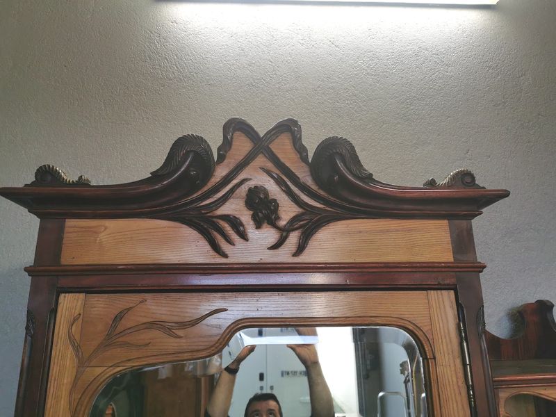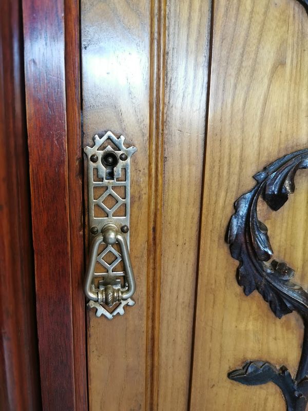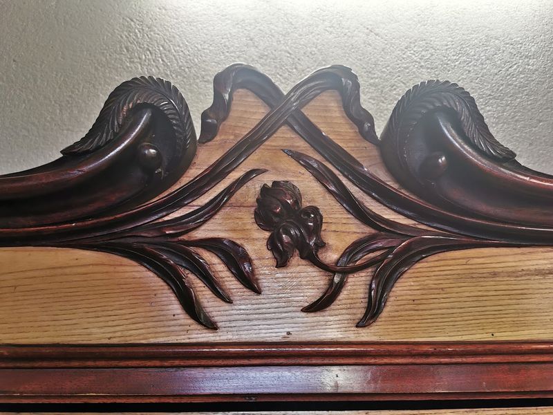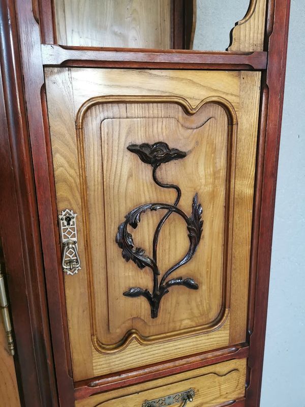 Belle armoire en acajou et frêne massif mouluré et sculpté à décor de pavots.