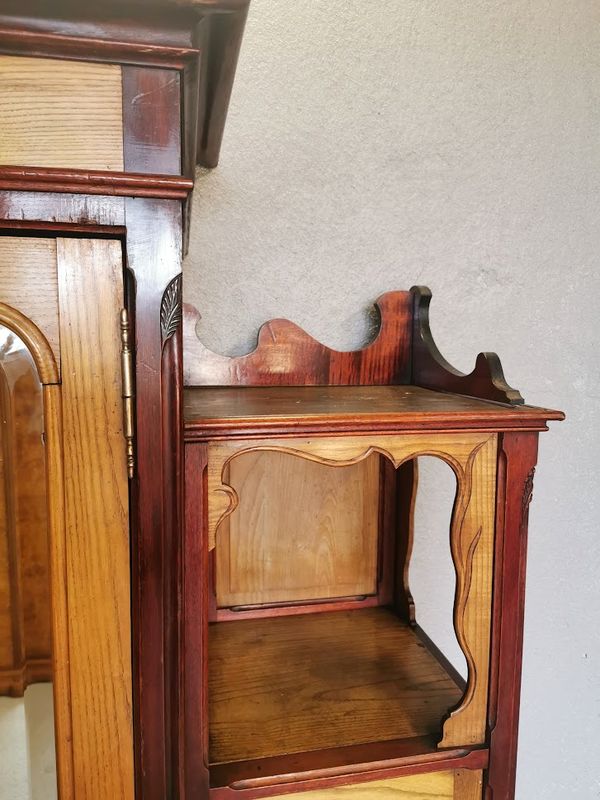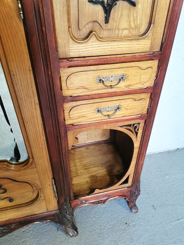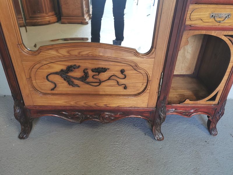 Bâtit asymétrique ouvrant par une grande porte à miroir chantourné et biseauté, deux tiroirs , une porte pleine, et deux niches sur la partie droite.