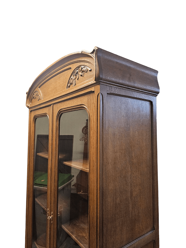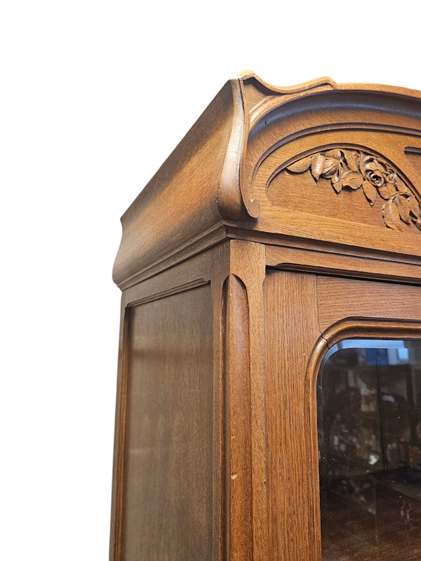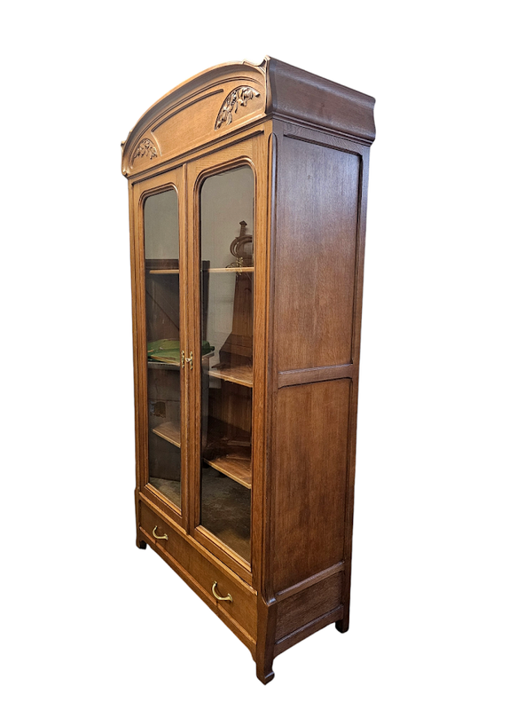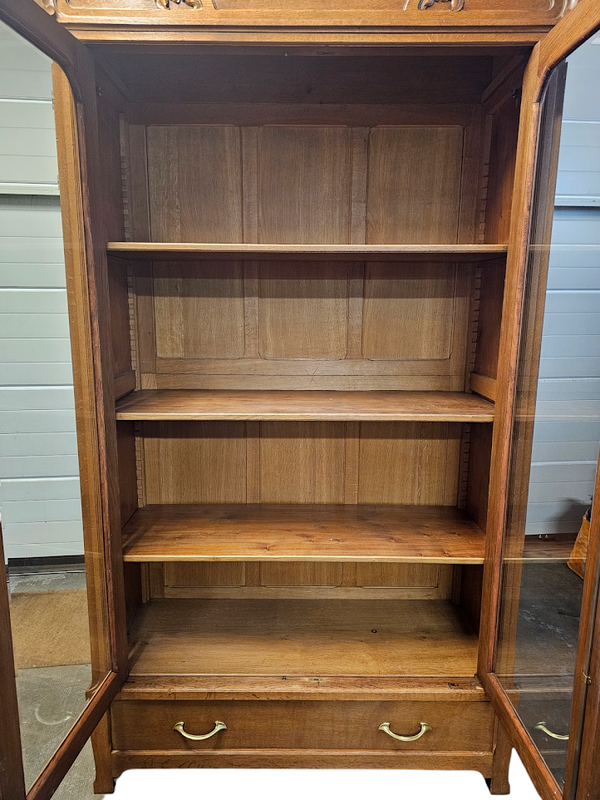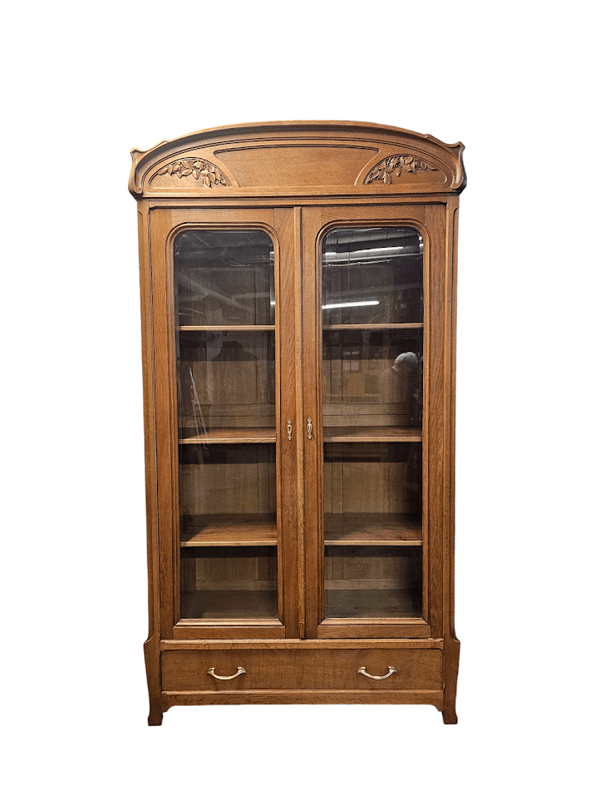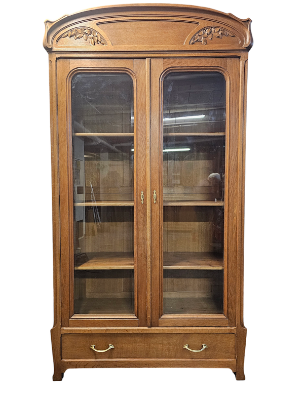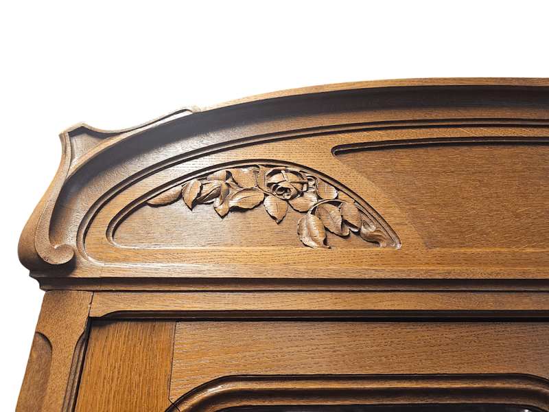 Grande bibliothèque en chêne massif mouluré et sculpté à décor de roses.