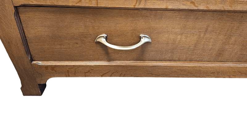Elle ouvre par deux portes vitrées et un grand tiroir, la corniche est cintrée en façade et moulurée à doucine latéralement.