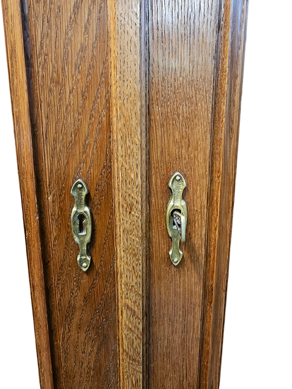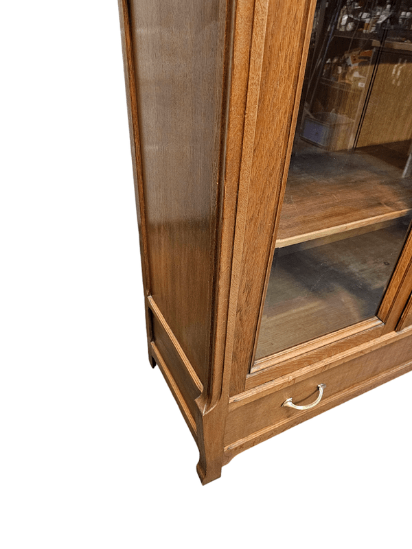 Vitres biseautées, entrées de serrures et poignées en bronze doré, rayonnages modulables en hauteur.