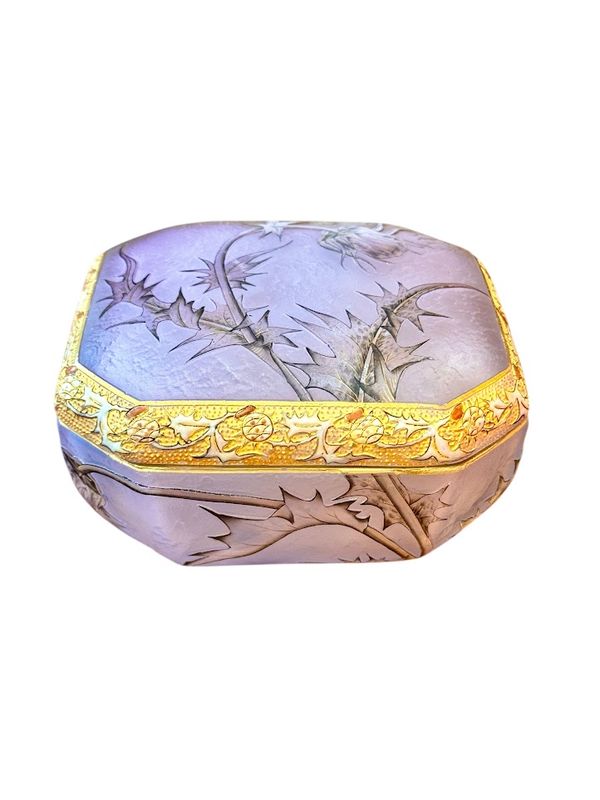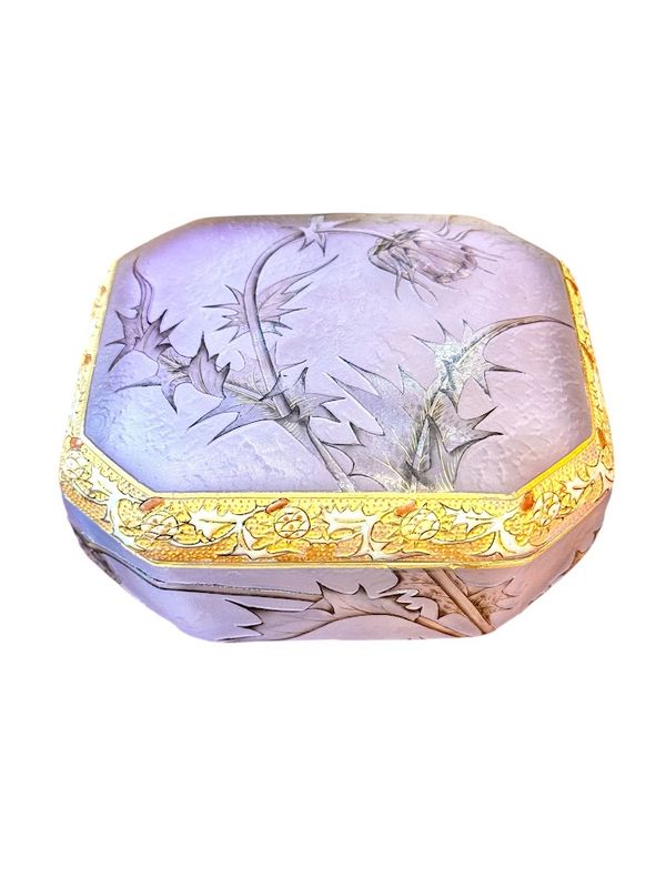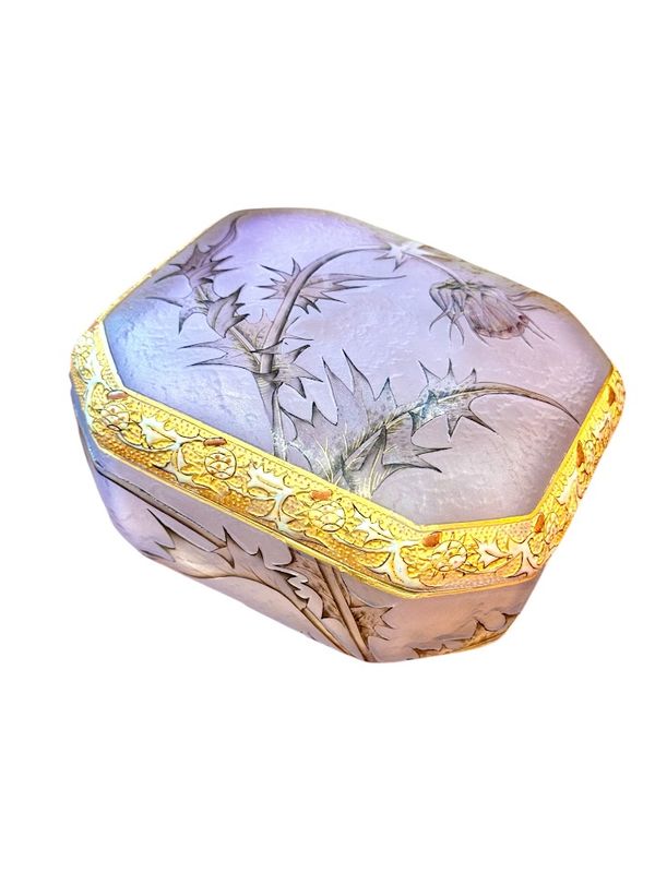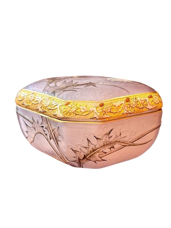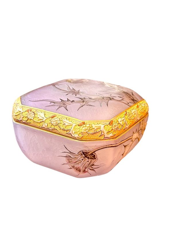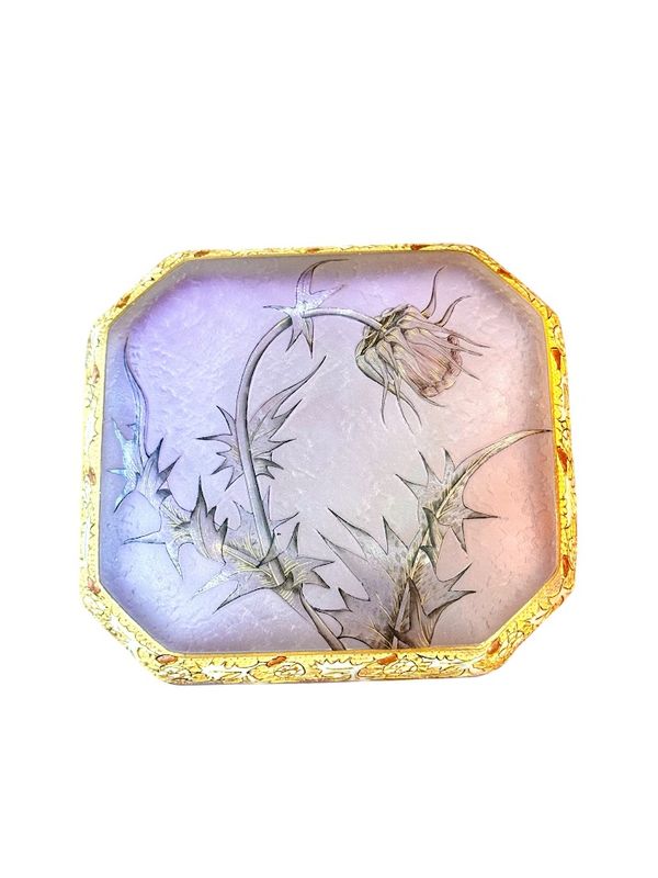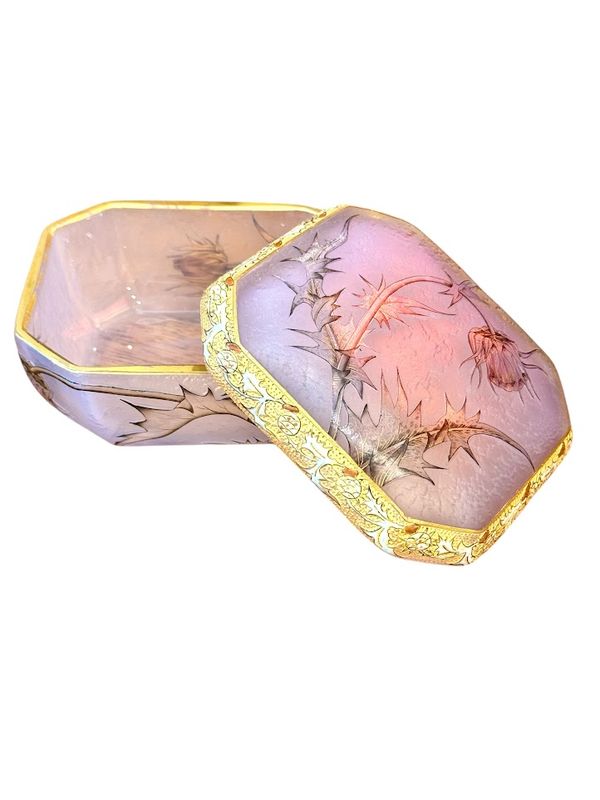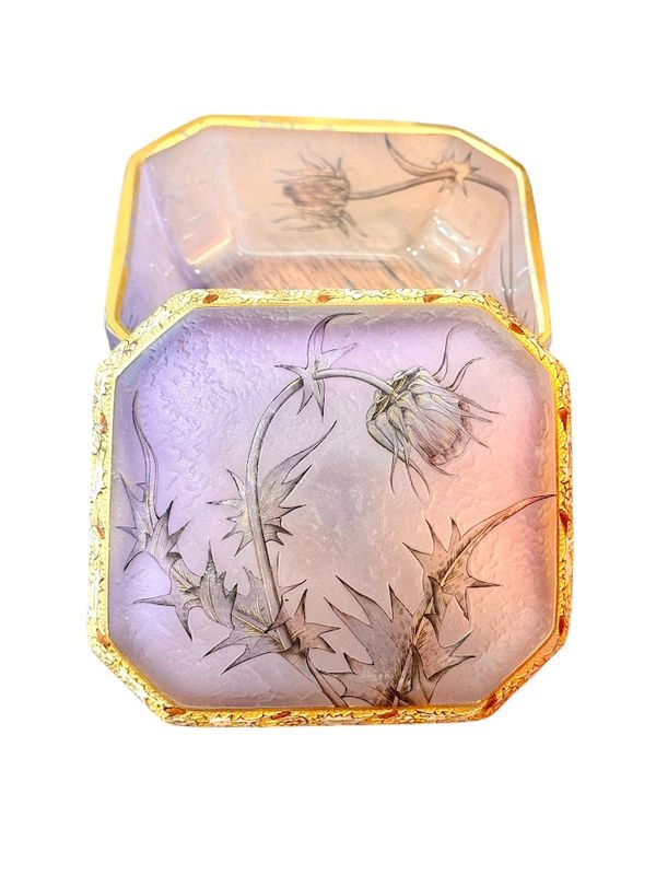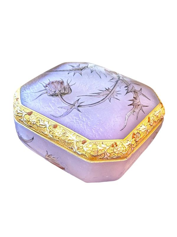 Superbe décor gravé en fines réserves à l'acide, émaillé polychrome et réhaussé d'une frise à l'or à décor de chardons.