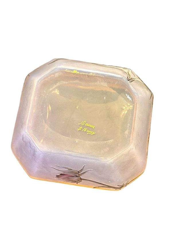 Jolie bonbonnière de forme octogonale en verre incolore, teinté et irisé en intercalaire de poudres roses.