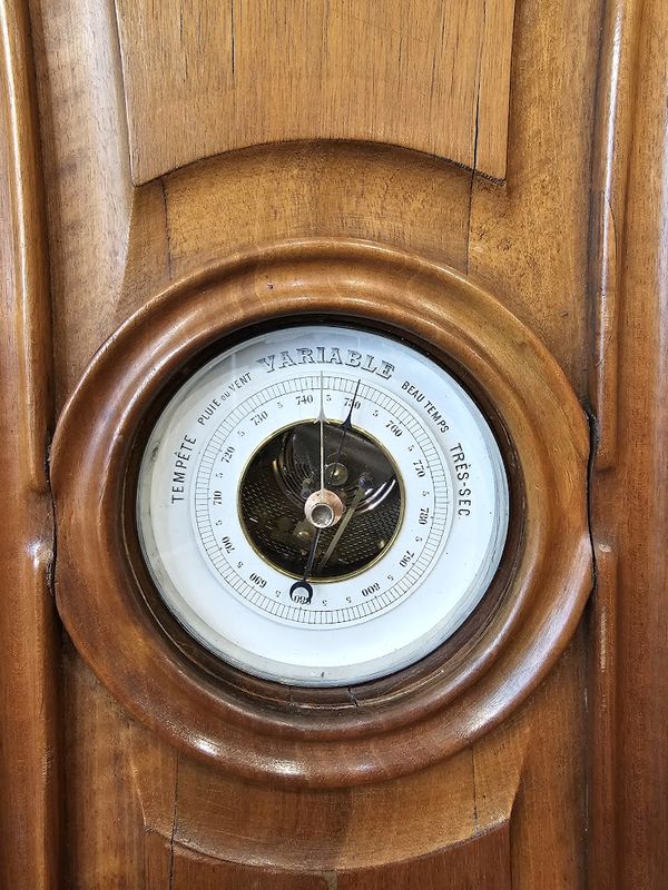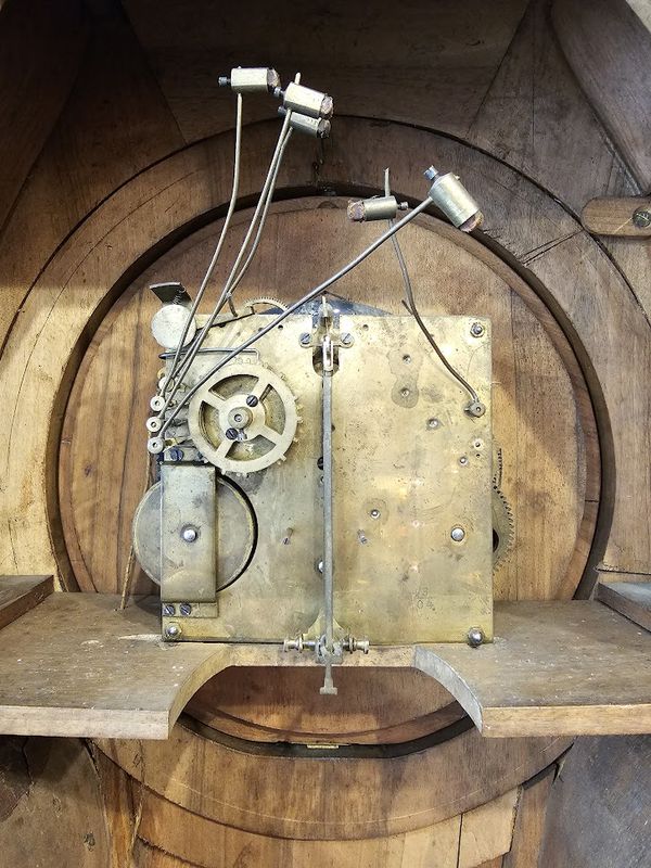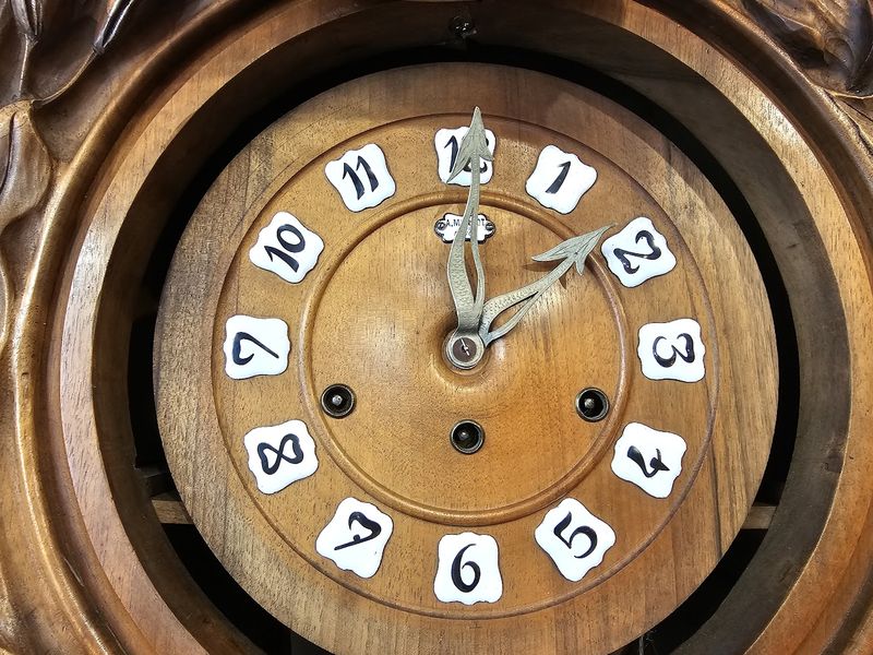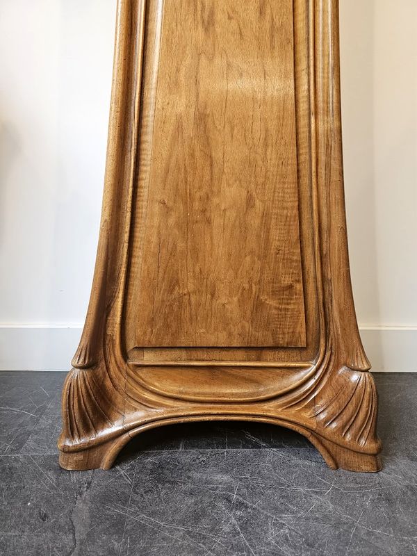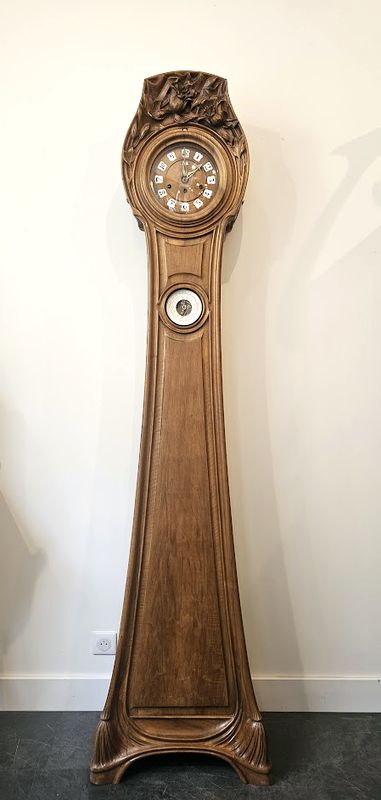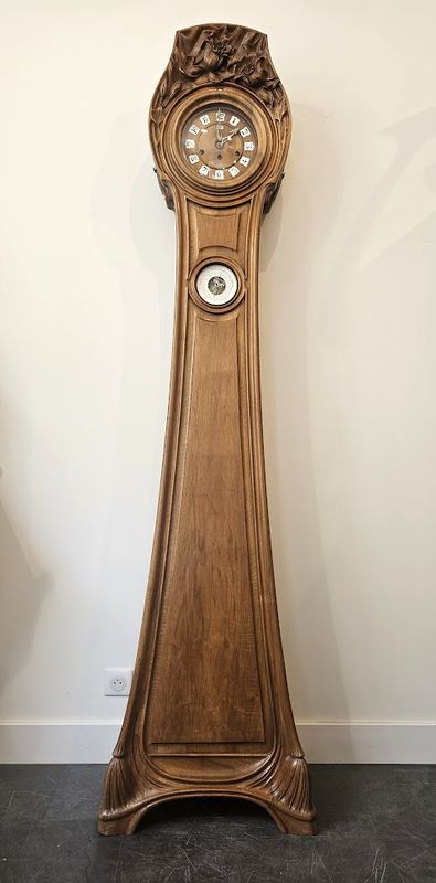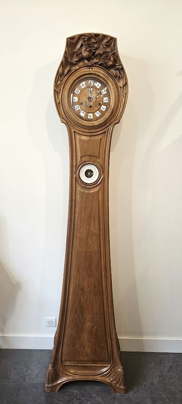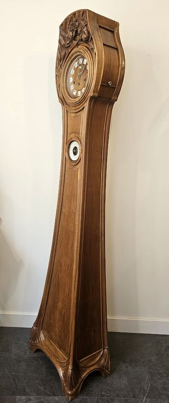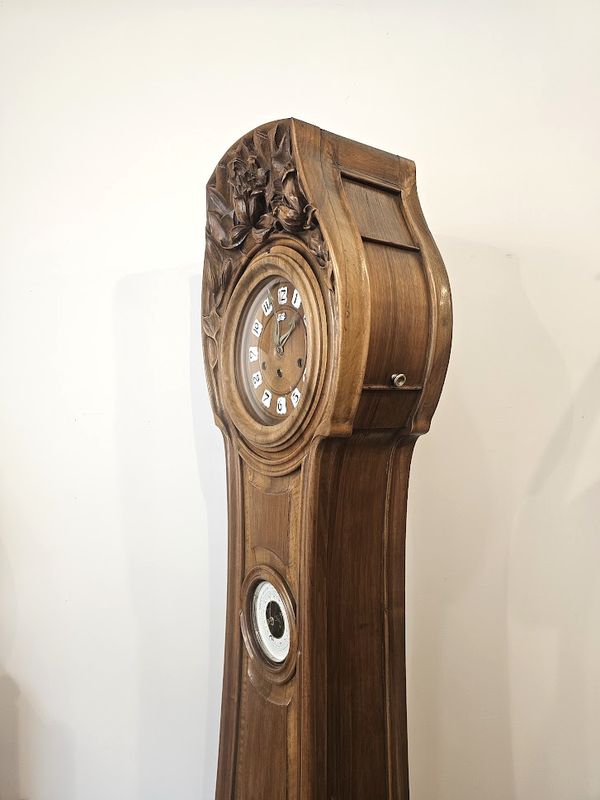 Rare et spectaculaire horloge en noyer massif mouluré et finement sculpté à décor de tulipes.