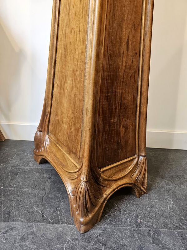 La base et sculptée en haut relief de bulbes nervurés, la caisse est profondément galbée latéralement et en façade, la partie supérieur à corniche cintrée illustre la floraison.
