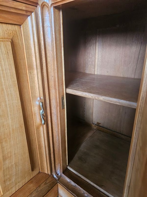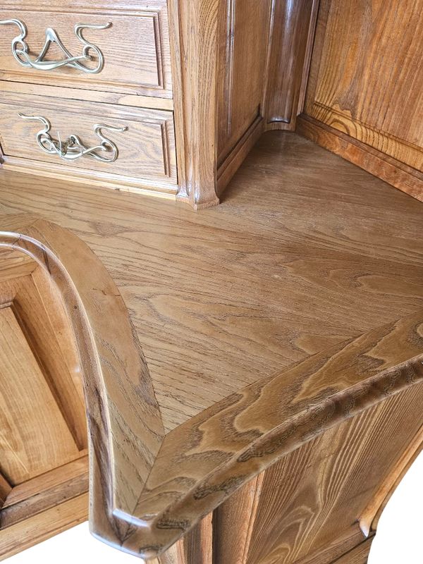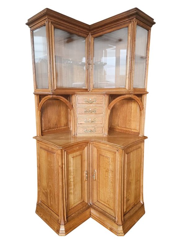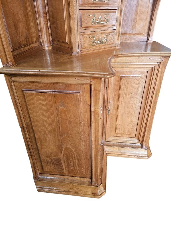 Superbe encoignure en frêne massif mouluré et sculpté.