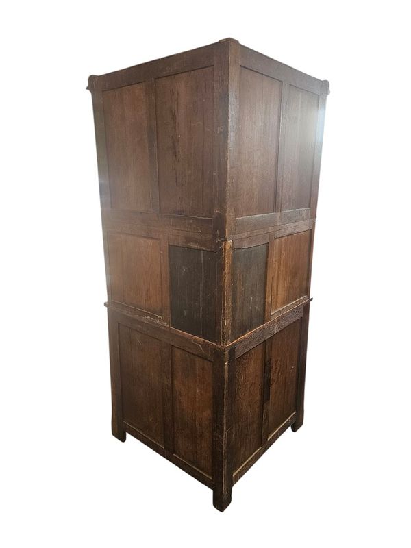 La partie basse présente des montants galbés et ouvre par deux portes pleines, la partie centrale présente un caisson à quatre tiroirs et des montants en arcatures, la partie haute en porte-à-faux est vitrée toutes faces et ouvre par deux portes.