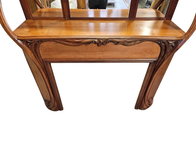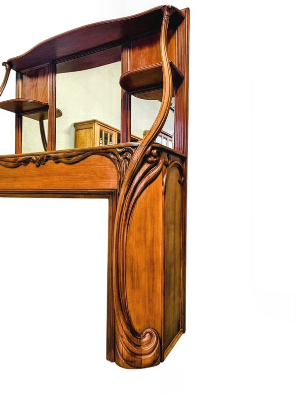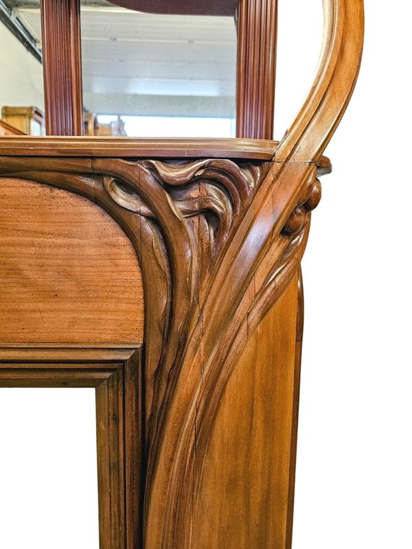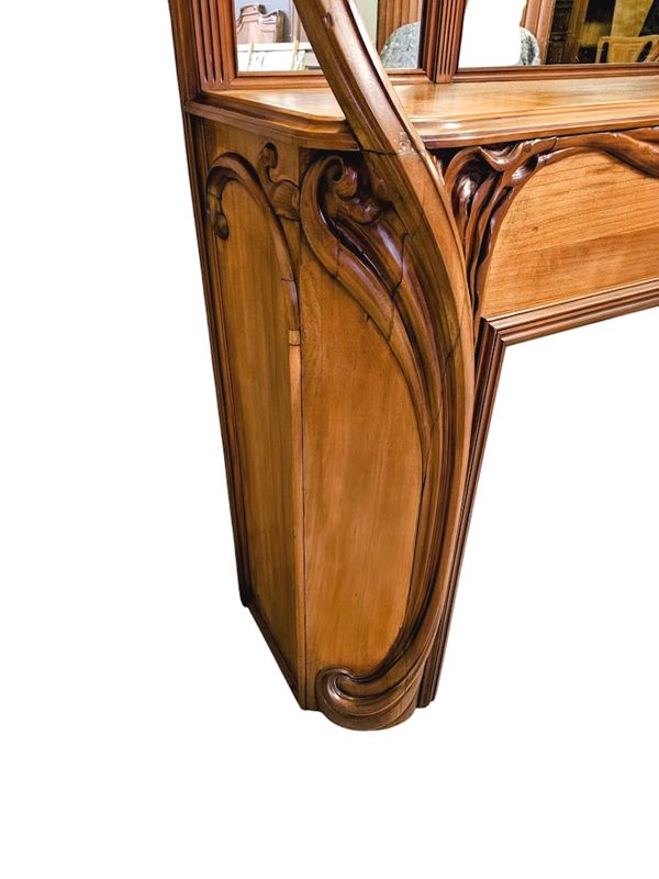 Exceptionnel manteau de cheminée en merisier massif mouluré et sculpté, à décor de moulurations d'inspirations végétales et de feuillages stylisés.