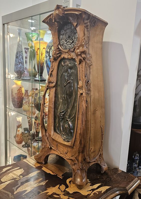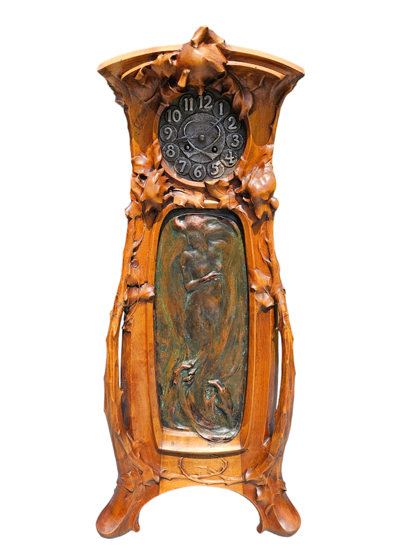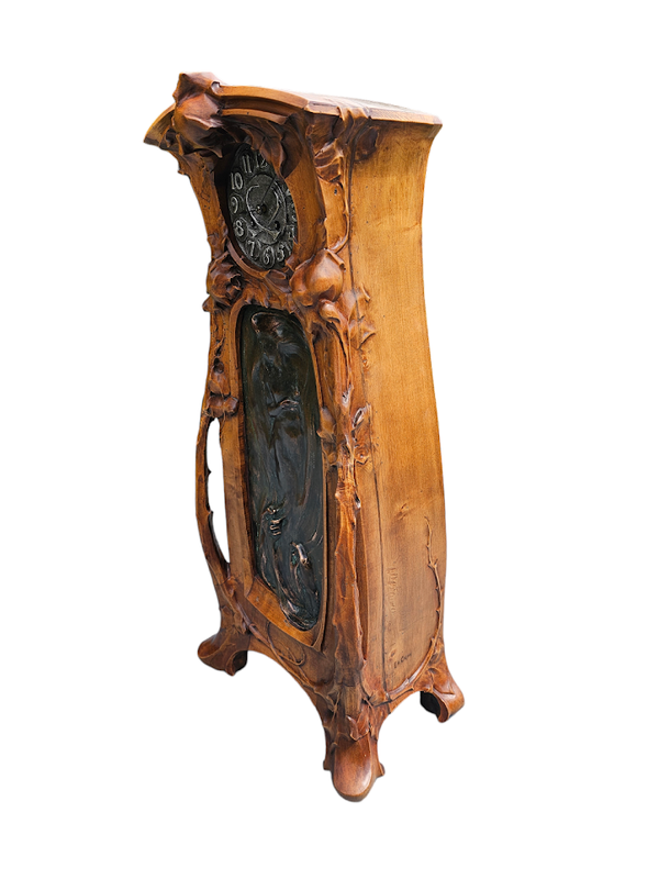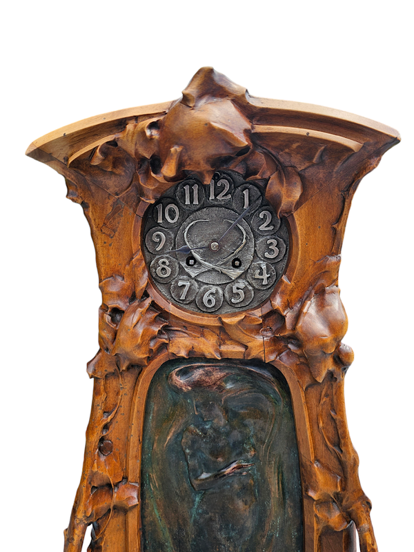 Rare et spectaculaire pendule en noyer massif mouluré et finement sculpté à décor de feuillages et de fleurs.