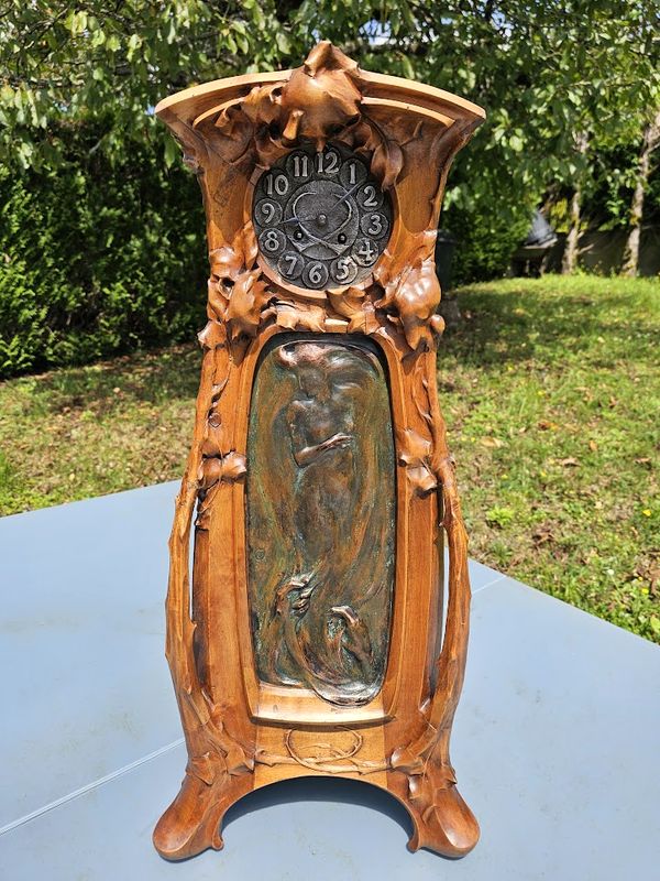 La caisse est profondément galbée, elle présente deux montants débordants ajourés et sculptés, une plaque en bronze à patine polychrome mordorée au décor d'une nymphe drapée retenue par des mains symbolisant le temps qui s'égrène, et un cadran en bronze argenté.